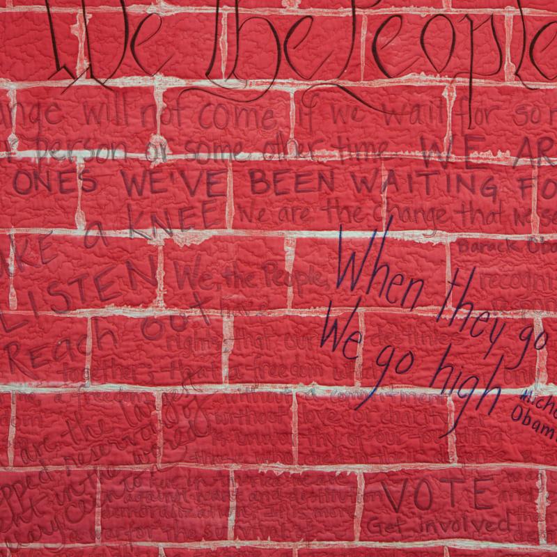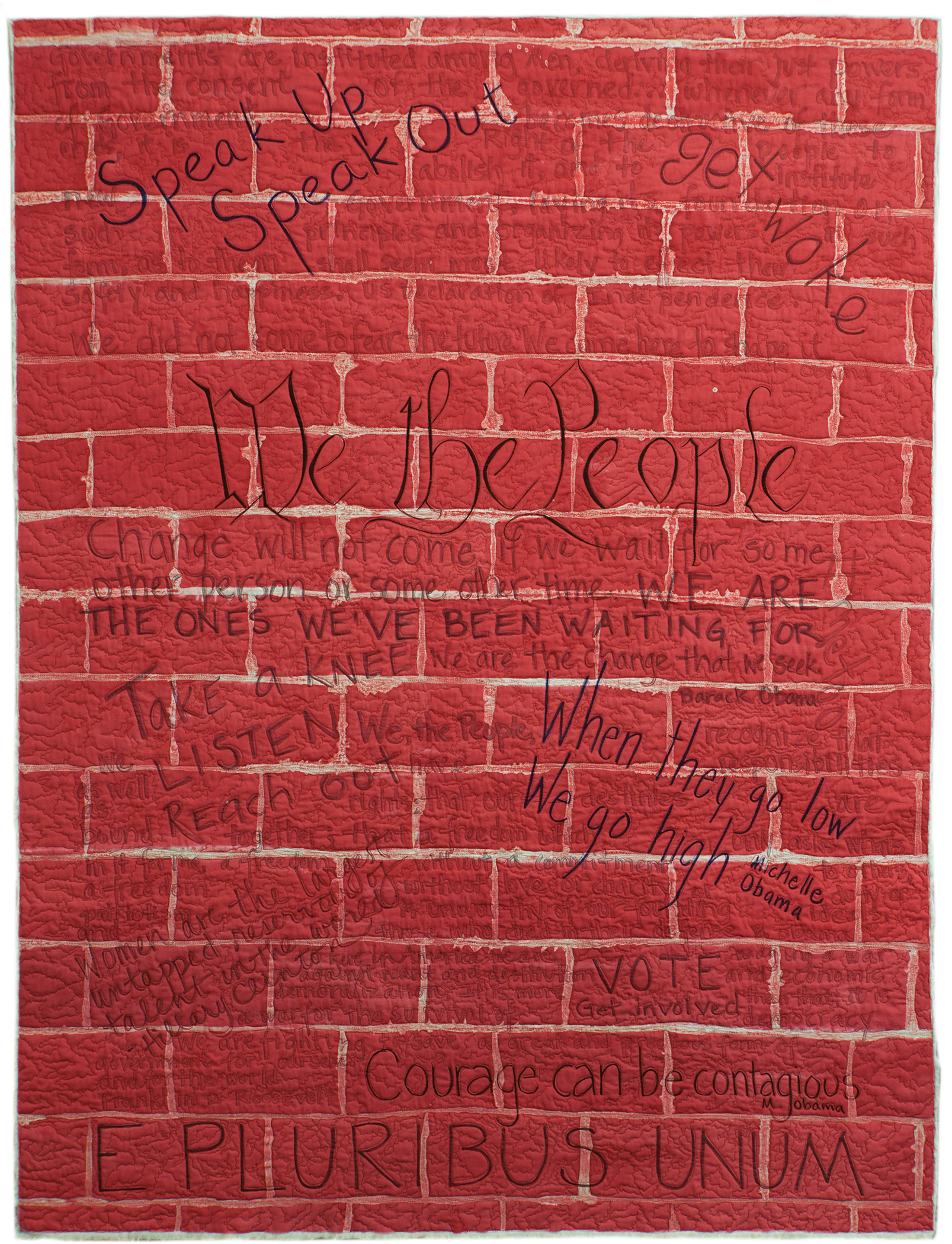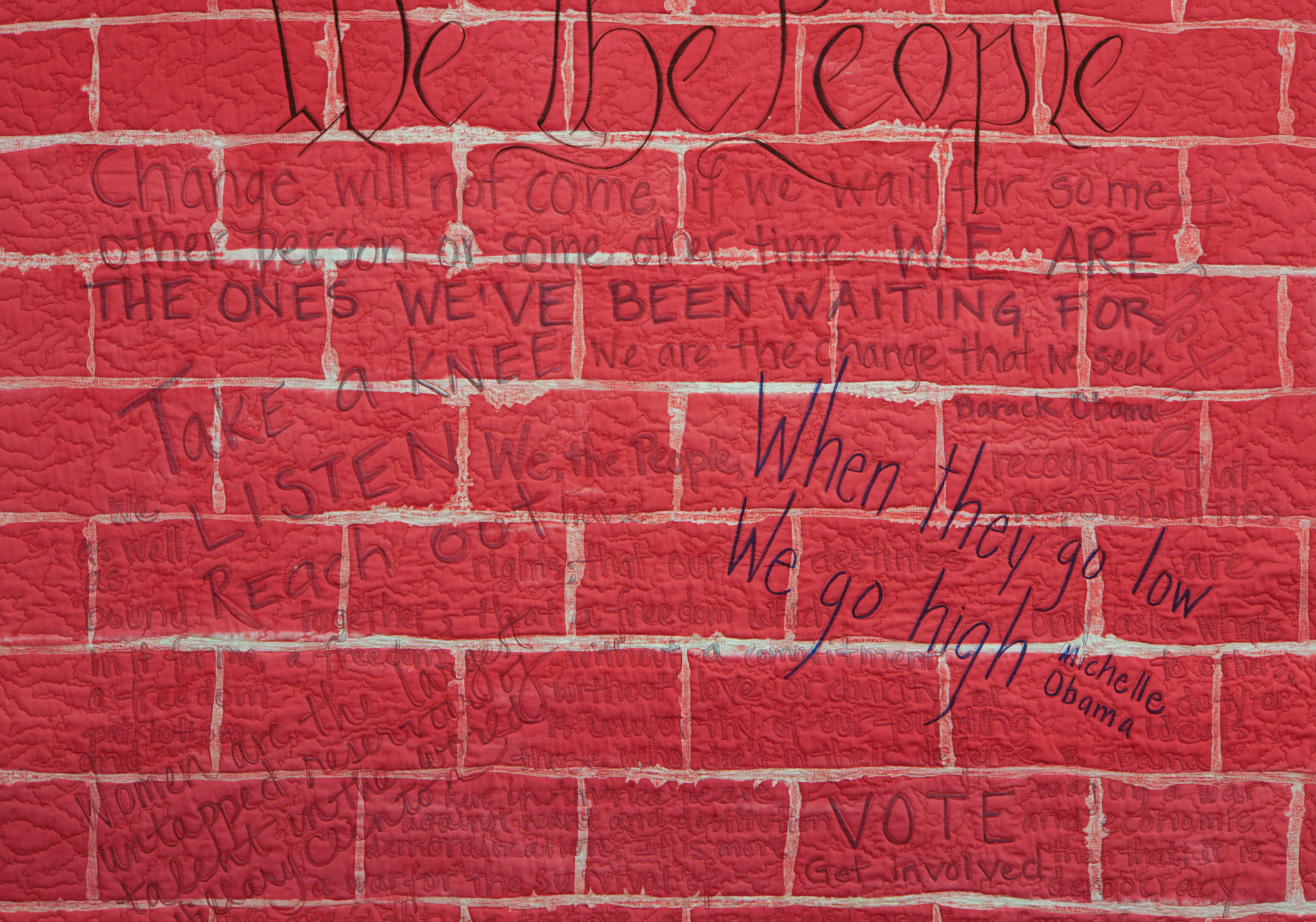 Words have power. The 2016 US election and the 45th presidency changed our nation and me; I was angry and galvanized to act and speak out. Words and quotations on a brick and cement wall, easily read and in the background, emphasize the call to action. The edges are raw and frayed, like our nerves and emotions. In the power of these words is the optimism they express that finally enough people are mobilizing to make a change that will endure.