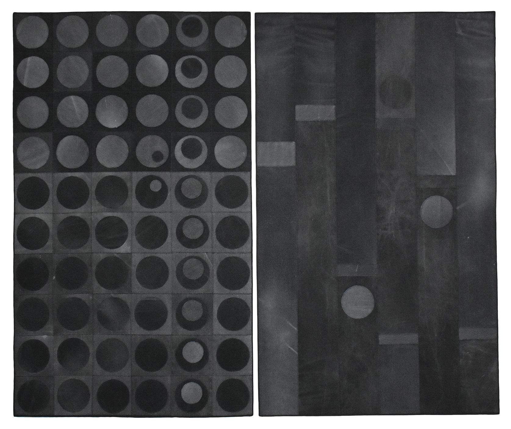 I am a story teller. Embedded in worn and aged clothing is a story about life. The marks and the patina of rubbed and worked areas presents a beautiful palette of values with which to tell a story. his diptych was made from three pairs of black work jeans. The dynamic rhythm of the left side is contrasted with the quiet qualities of the right half. Work...Rest.
