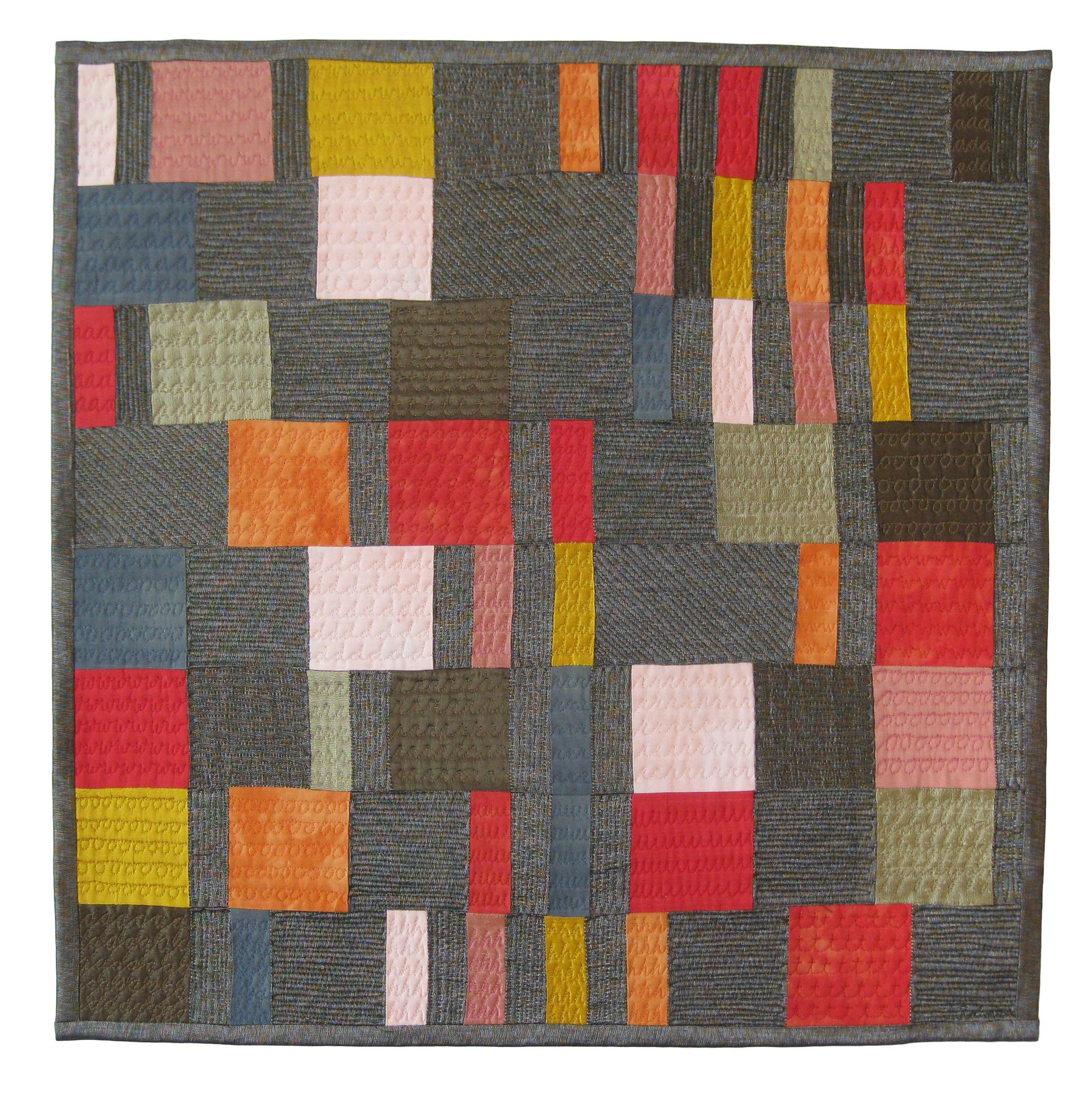 This piece is from my Lost Modern Language Series. This series presents a visual interpretation of the dots and dashes of Morse Code, enabling the viewer to "read" the artwork. The piece reads, "What Hath God Wrought." The longer rectangular boxes are the ""dashes,"" with the shorter ones being the "dots." The corresponding letter of our traditional alphabet is quilted inside the Morse Code symbols.