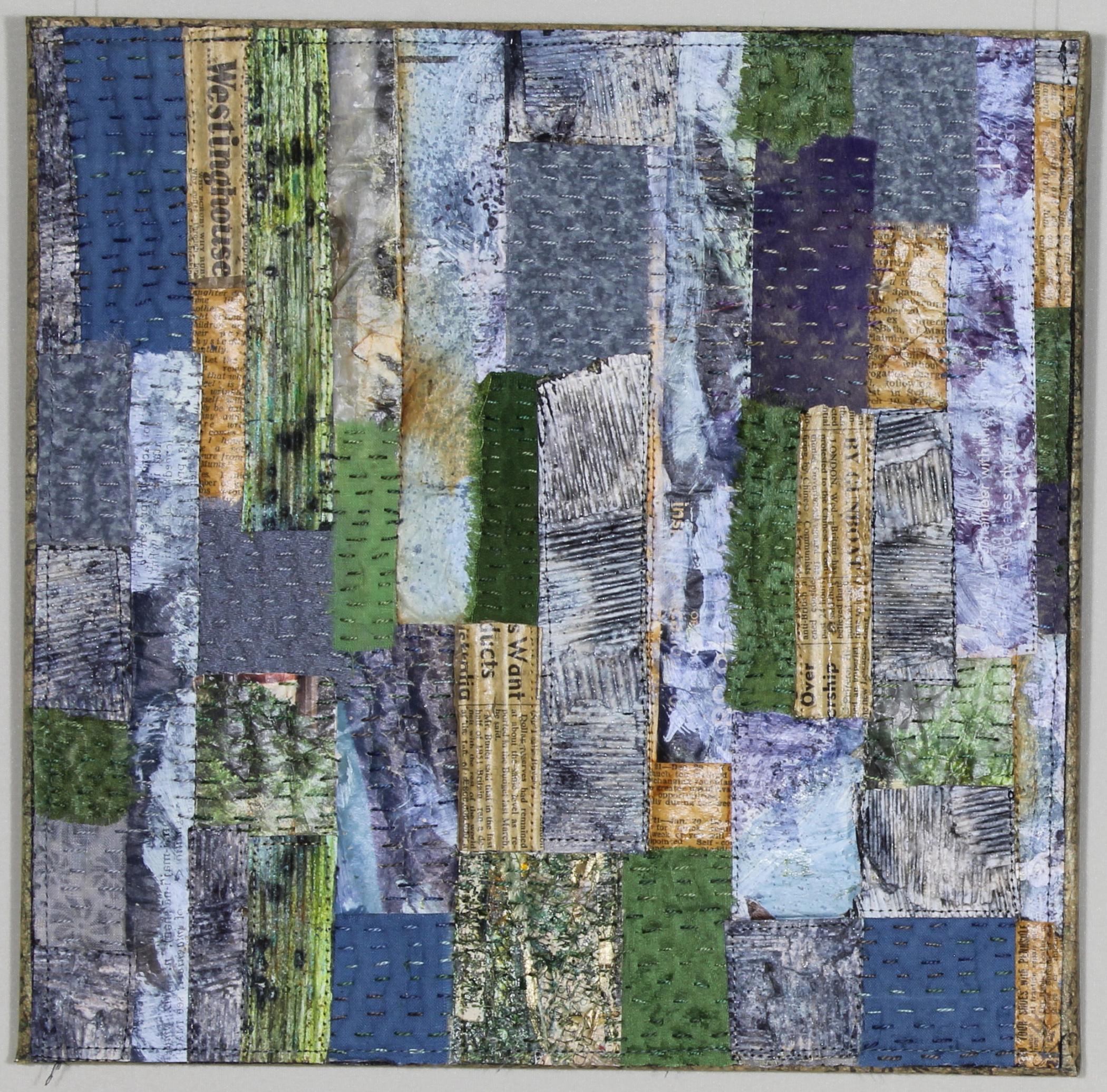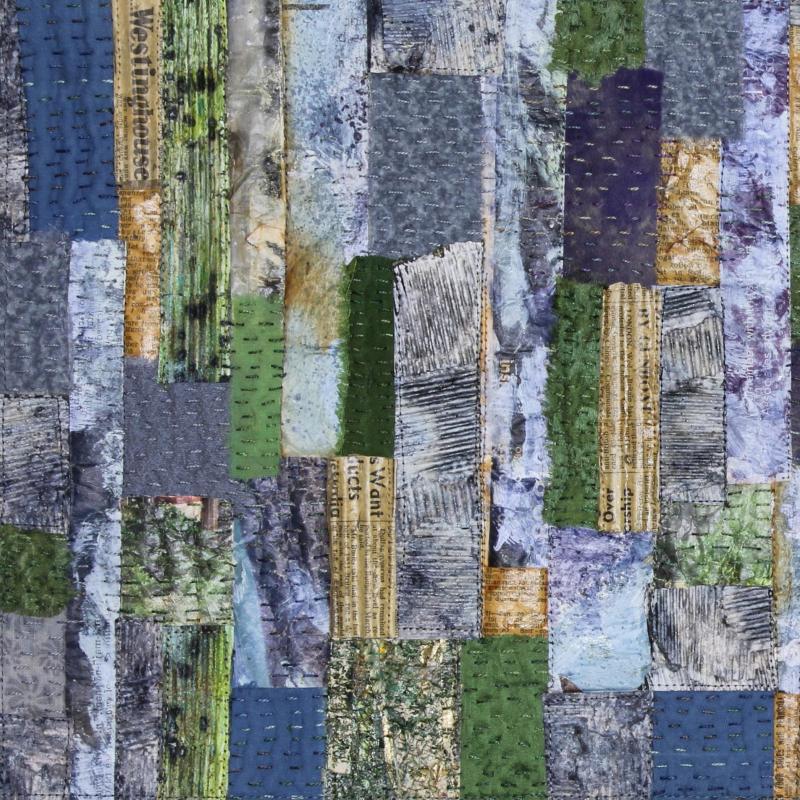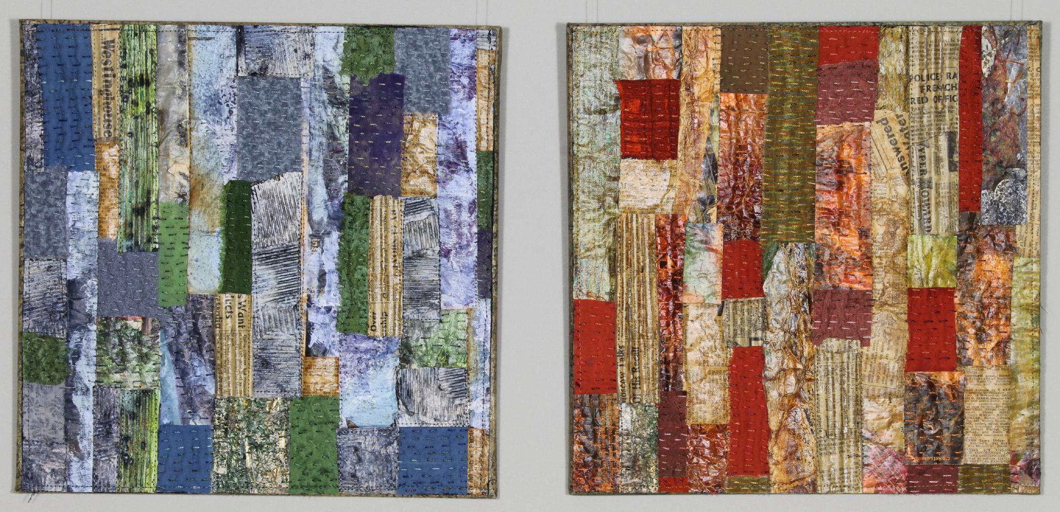 Paper and cardboard are deconstructed by soaking in water, then reconstructed using silk, scrim, mediums and stitching to produce paper textile.