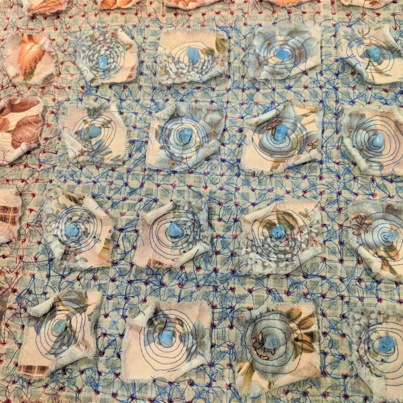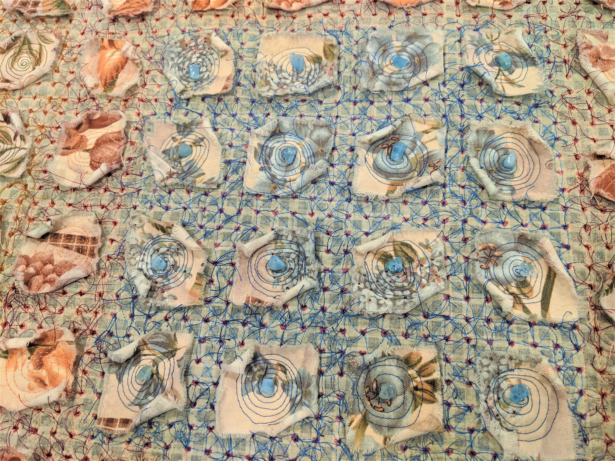 "Wrong Patch" came from 2020, the year of a wild presidential election and a pandemic. Simply everything seemed to go wrong, spiral out of control, and overflow with conflict and worry. "Wrong Patch" protests politics (which completely swamped me) exacerbating so many already bad situations. My life (like everyone's) was filled with fear. People were confined, and then friends and family got sick. Some died. People were out of work, out of food, out of money. Race was (and is) an issue. At first glance this seems a traditional quilt; but it is not pieced but rather composed of raw edge patches sitting atop the "wrong” side of a calico heart print whole cloth. Rules were broken here with edges curling, loose threads sprouting in political colors, and spiral and zigzag quilting speaking to personal anxiety and loss of control. Sizes are inconsistent, fabric is wrong side up, placement is imperfect, and hand stitching is rough. Everything is wrong about this quilt--perfect for 2020.