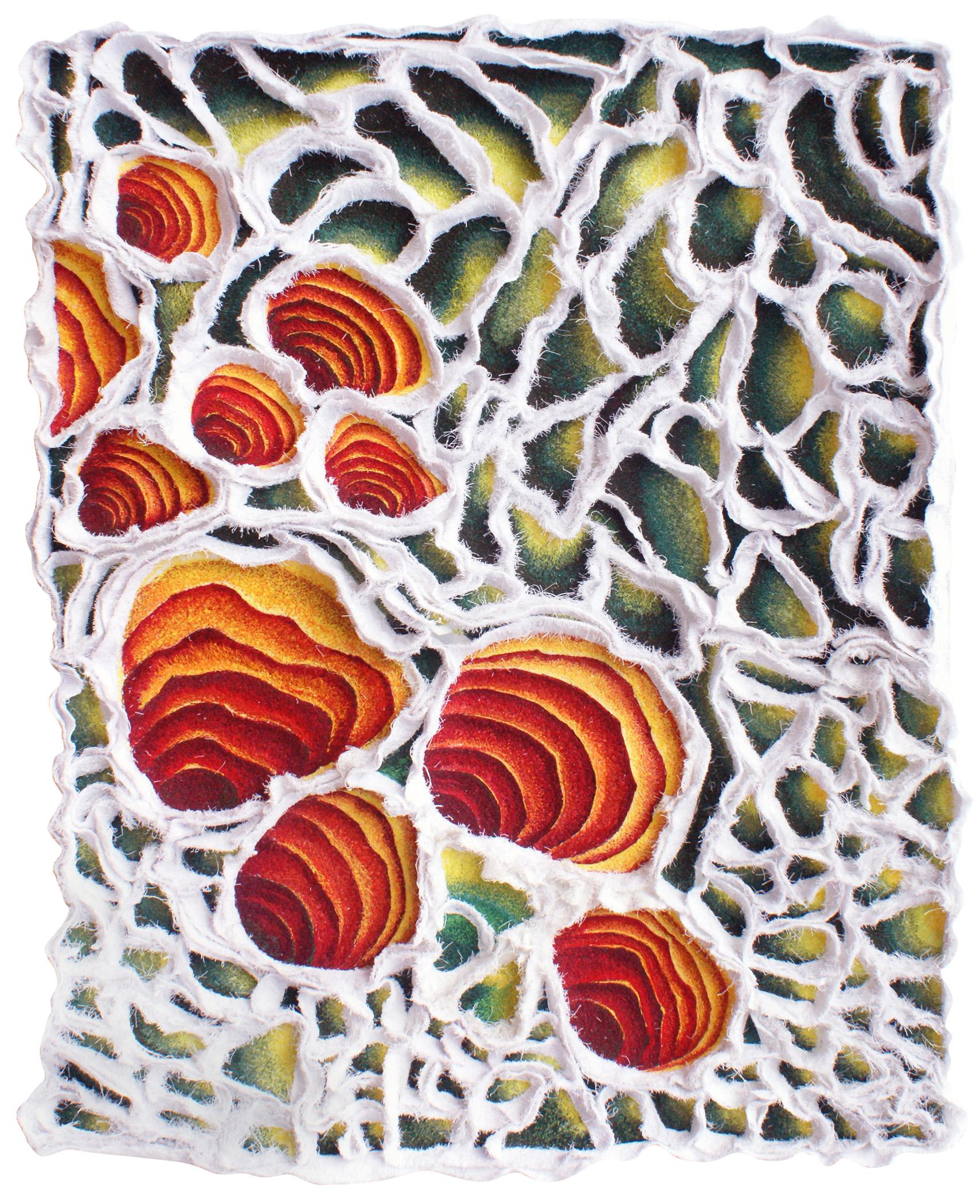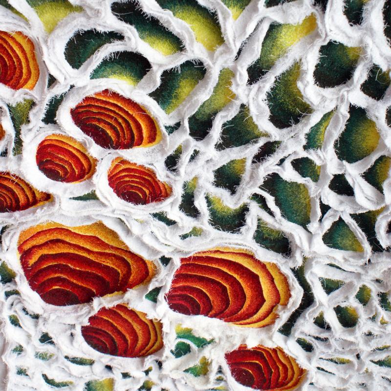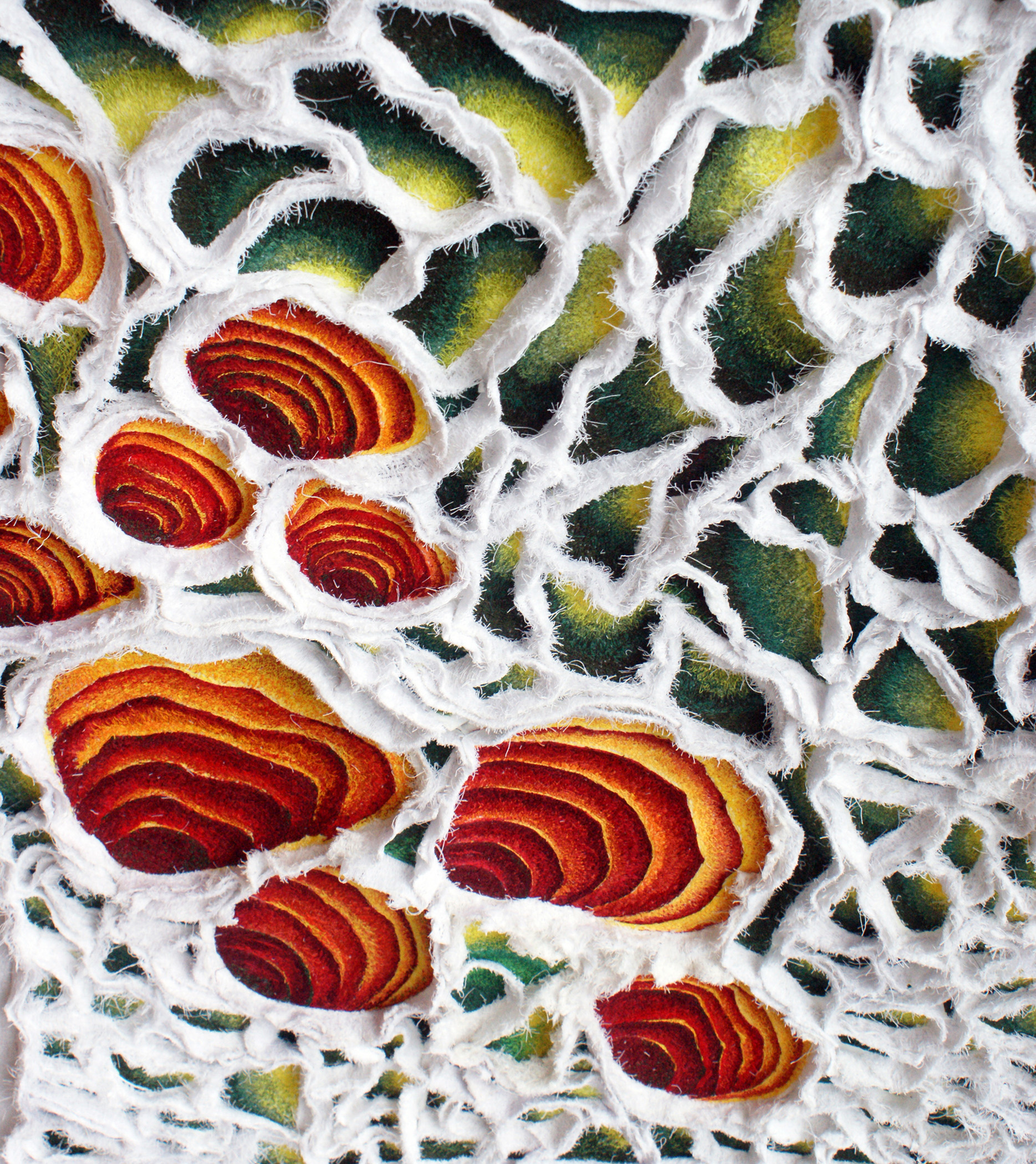 With permission from Dr. David Furness, I chose to interpret in thread a colored scanning electron micrograph image (SEM) taken by him. The depth and the values were a challenge I could not resist. I used more than one color of thread, blending the two colors together in each section. I put the next lightest value on top throughout the value range, allowing me to create a seamless transition for the eye to follow. My interest in color theory and visual perception were piqued when I saw the SEM image. Of course, I didn’t realize that recreating it would take three months, almost 200 hours, and 10 miles of thread to complete.