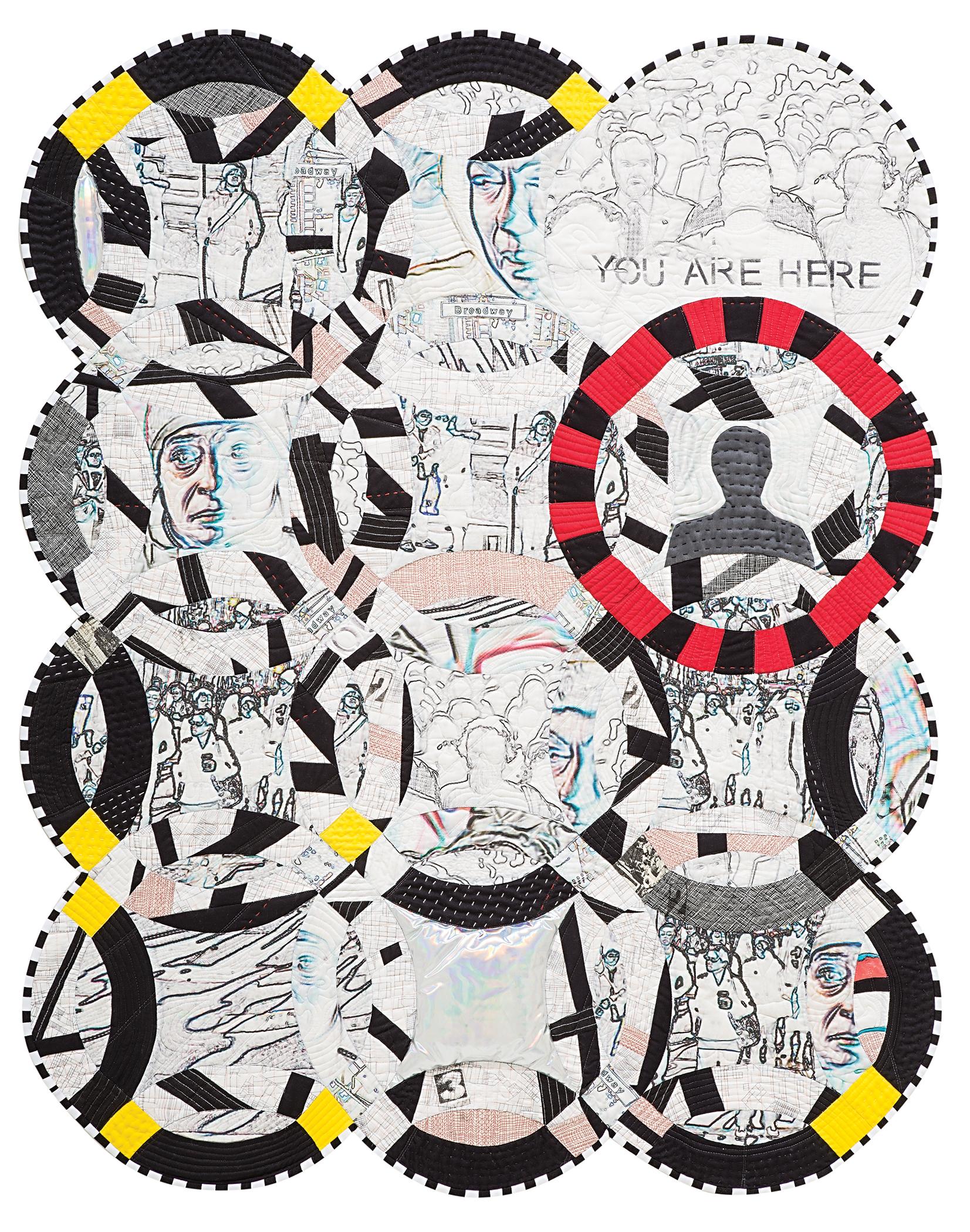 You Are Here is about living in New York city and how my neighborhood influences my work. Inspired by the possibilities of the city, How you can be completely anonymous in the crowds, or have some random thing happen that makes you the center of attention. New York city is a mob of chaos, and at the same time a very small town. That duality is what I was going for in this quilt... It's chaotic, and busy, but at the same time the grid of the city, or the grid of a quilt holds it all together. New York pushes you naturally out of your comfort zone. A place i love very much.