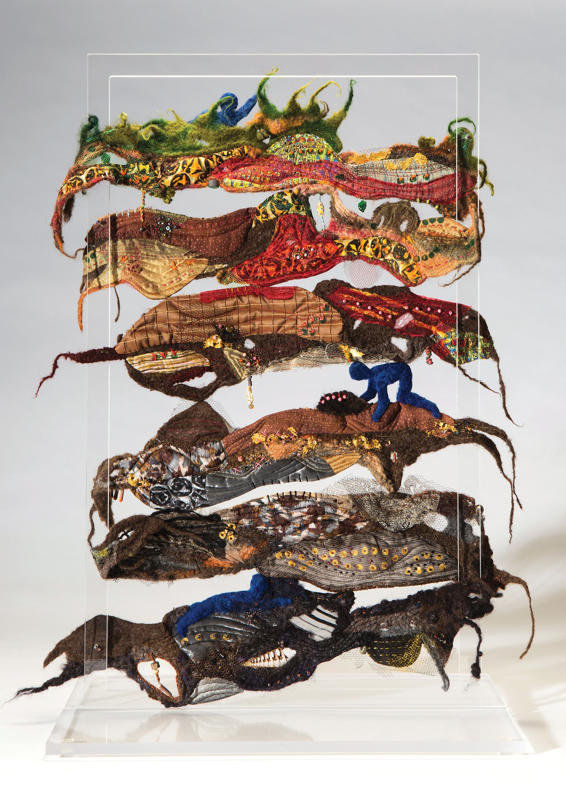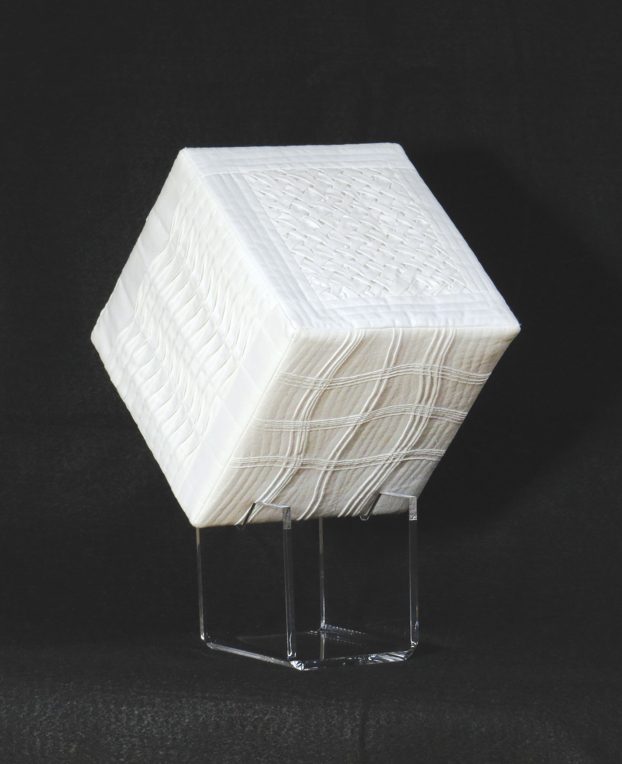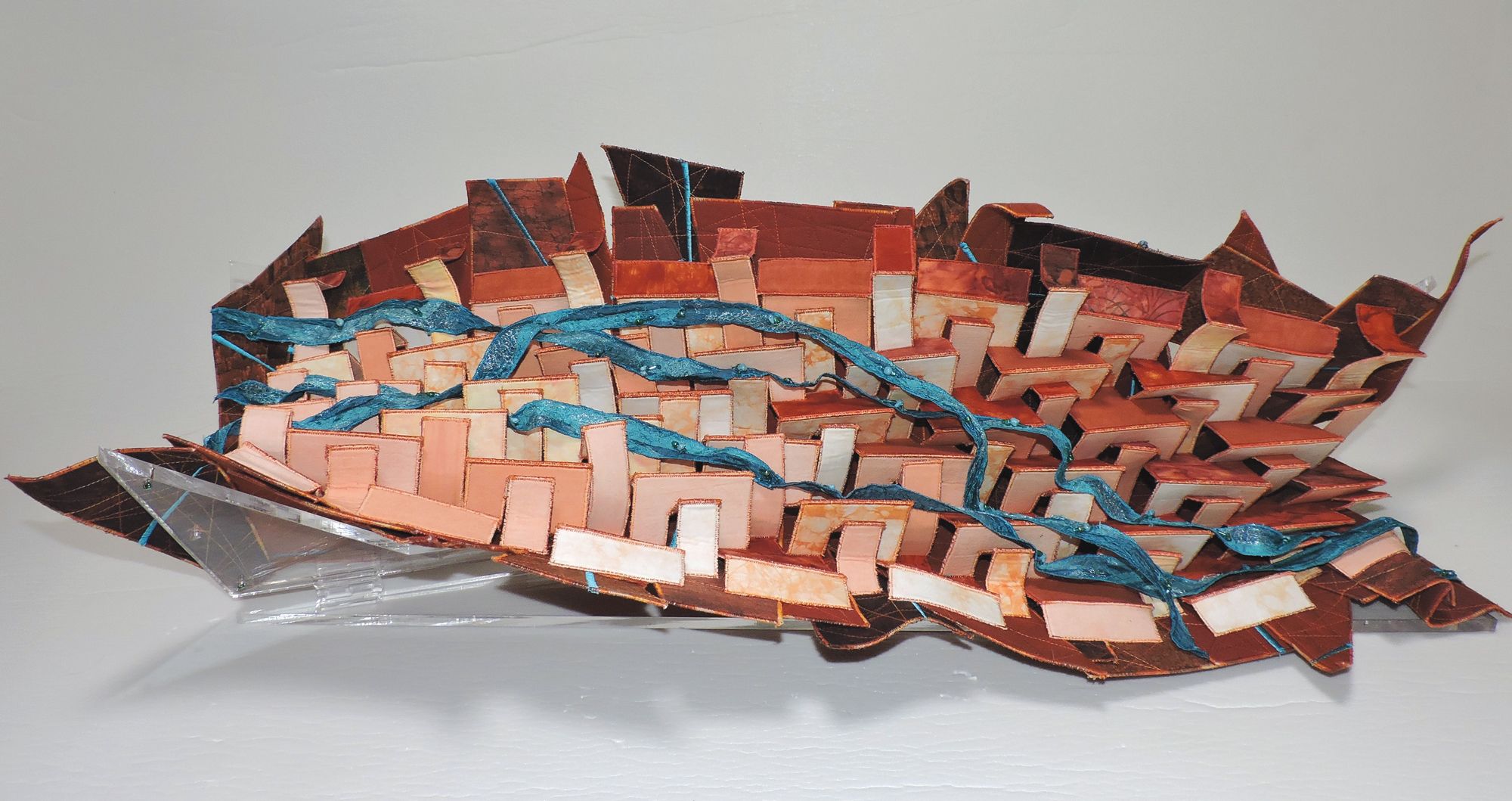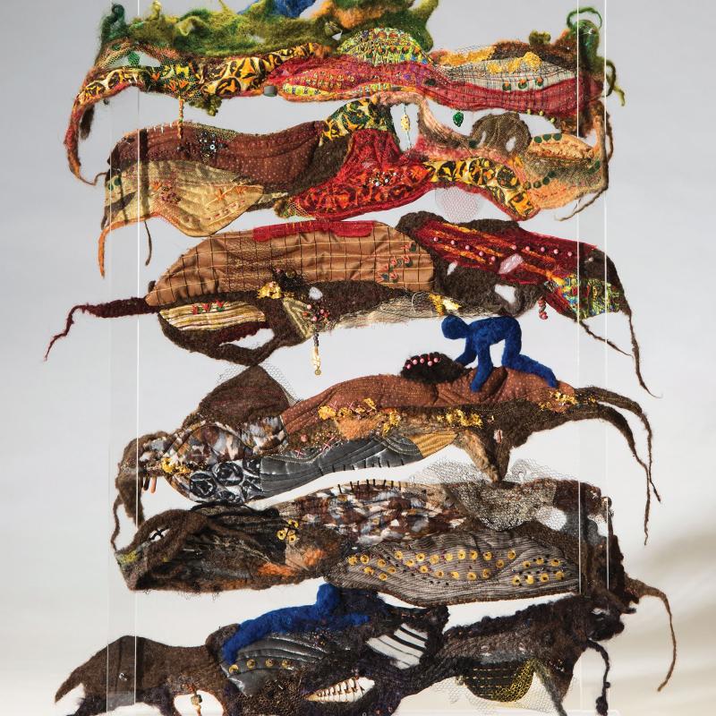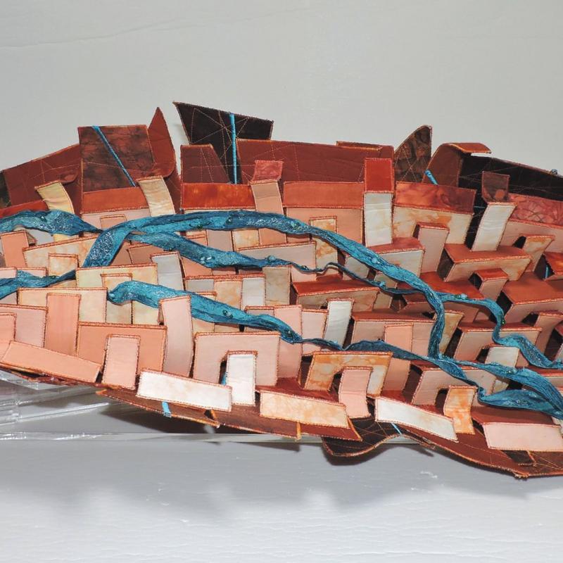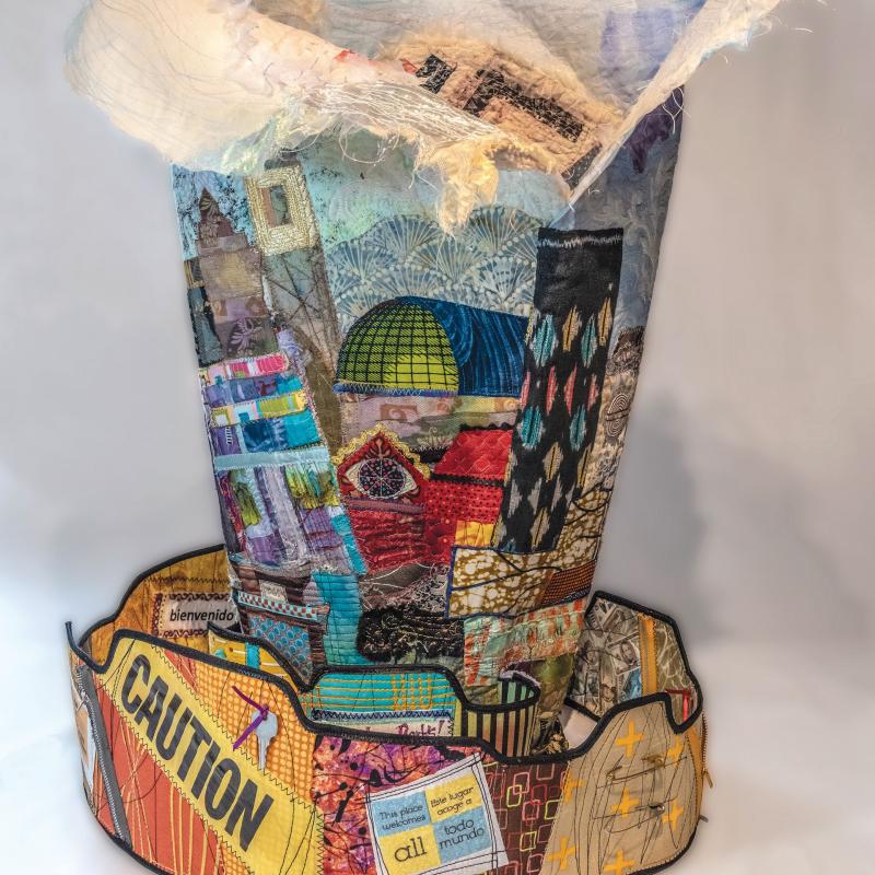 SAQA Global Exhibition 3D Expression offers an intriguing glimpse into a new dimension of art quilts, creatively interpreted by artists from 14 US states and 10 countries. The wide variety of pieces selected by juror Bruce Hoffman include vessels, wearables, wall-pieces, and sculptural artworks.