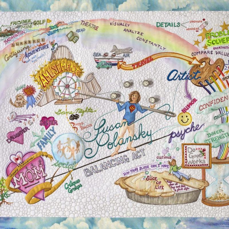 From serious to lighthearted, from literal to abstract, there are many ways to find balance. It can be found in formalism; in the pursuit of compositional balance and mastery of the medium that is fabric and stitch. It can be historic, spotlighting the people and events that contribute to our ability to achieve balance. But mostly, it’s personal. Viewers are invited to find their own stories in the pieces presented and ask, what does balance mean to me?
