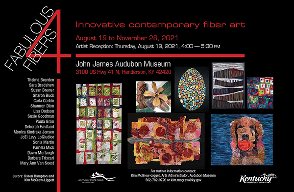 Fabulous Fibers IV will once again have the walls gleaming with vibrant colors at the John James Audubon State Park. The textile exhibit will fill the lower and main levels of the Museum. Talented SAQA (Studio Art Quilt Associates) fiber artist from Indiana and Kentucky/Tennessee regions will be exhibiting their fiber artworks. Fabulous Fibers IV will show artistic creations of seventeen textile artists, using a wide variety of materials and techniques.