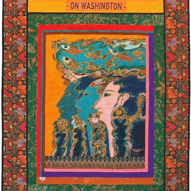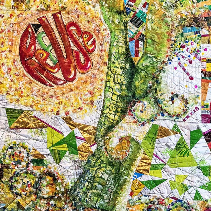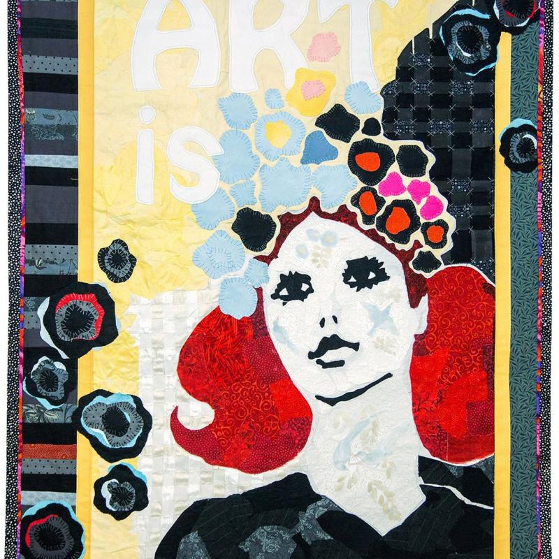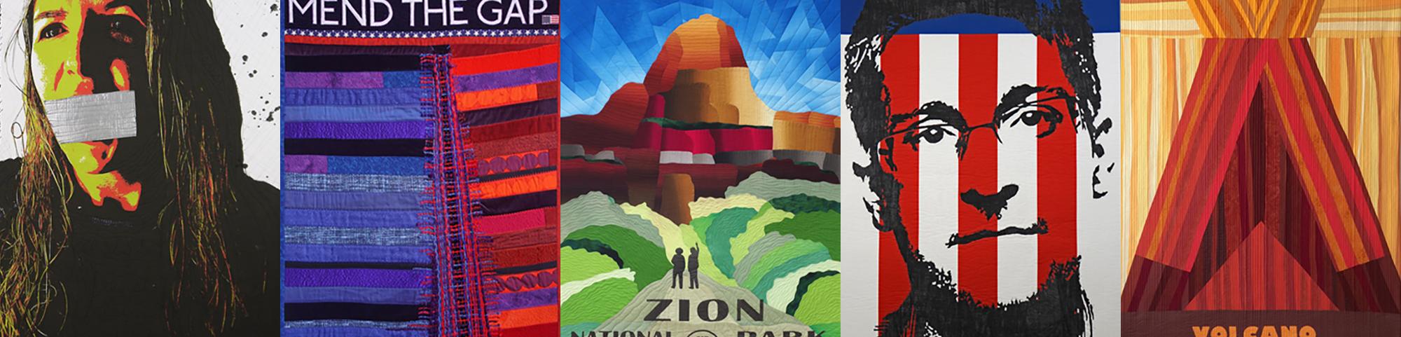 SAQA’s Textile Posters brings together the familiarity of quilts with the equally familiar vernacular of posters to create a visually exciting, informative, and emotional exhibition. Selected pieces reflect the wide diversity of posters. What all have in common is an emblematic economy of text and imagery. Posters are meant to convey a message in the blink of an eye, be it to inform, educate, or persuade. It is that particular aesthetic consideration which characterizes these textile artworks.