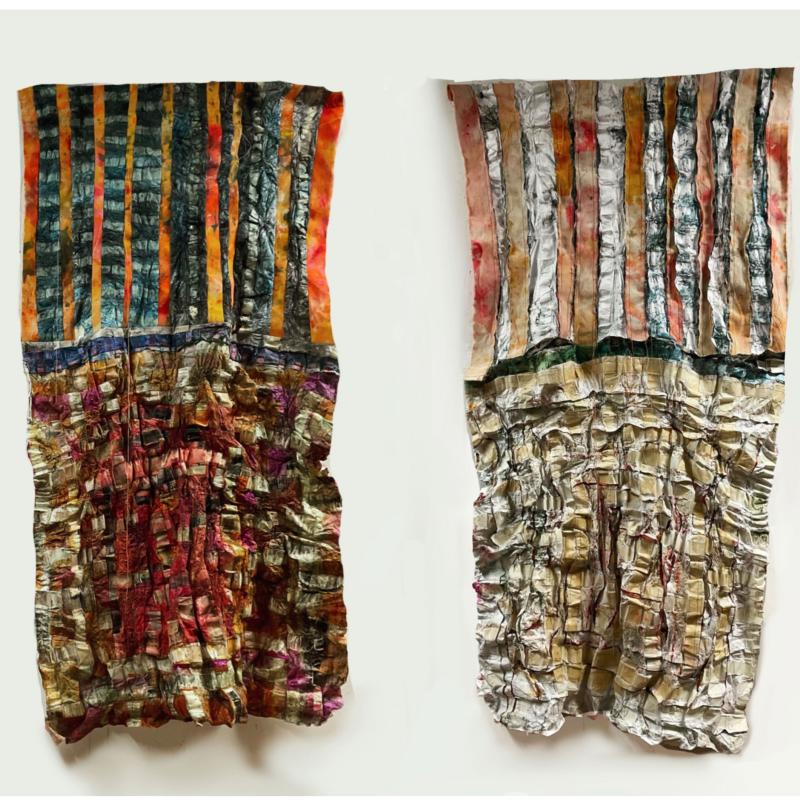 I began sewing under the guidance of my mother and other skilled quilt makers. In 2016, I rekindled my passion for creating quilts on my sewing machine, linking them together into artful assemblages. I weave bed sheet yarns, tie threads, and paint surfaces, transforming them into fortified, almost mummified creations. Through the process of creating my works, I endeavor to connect with the pain of loss and insecurity, the concealing of truths, the inherent vulnerability of life and death, and the inevitable process of disintegration and impermanence. Yet, I also seek to capture the sparks of beauty that often emerge within the transitions and fade away. My art serves as a continuous effort to piece together fragments of my own experiences, sometimes building up my weavings and, at other times, deconstructing them—a symbolic reconstruction of my psyche, a continual process of destruction and reclamation of myself.