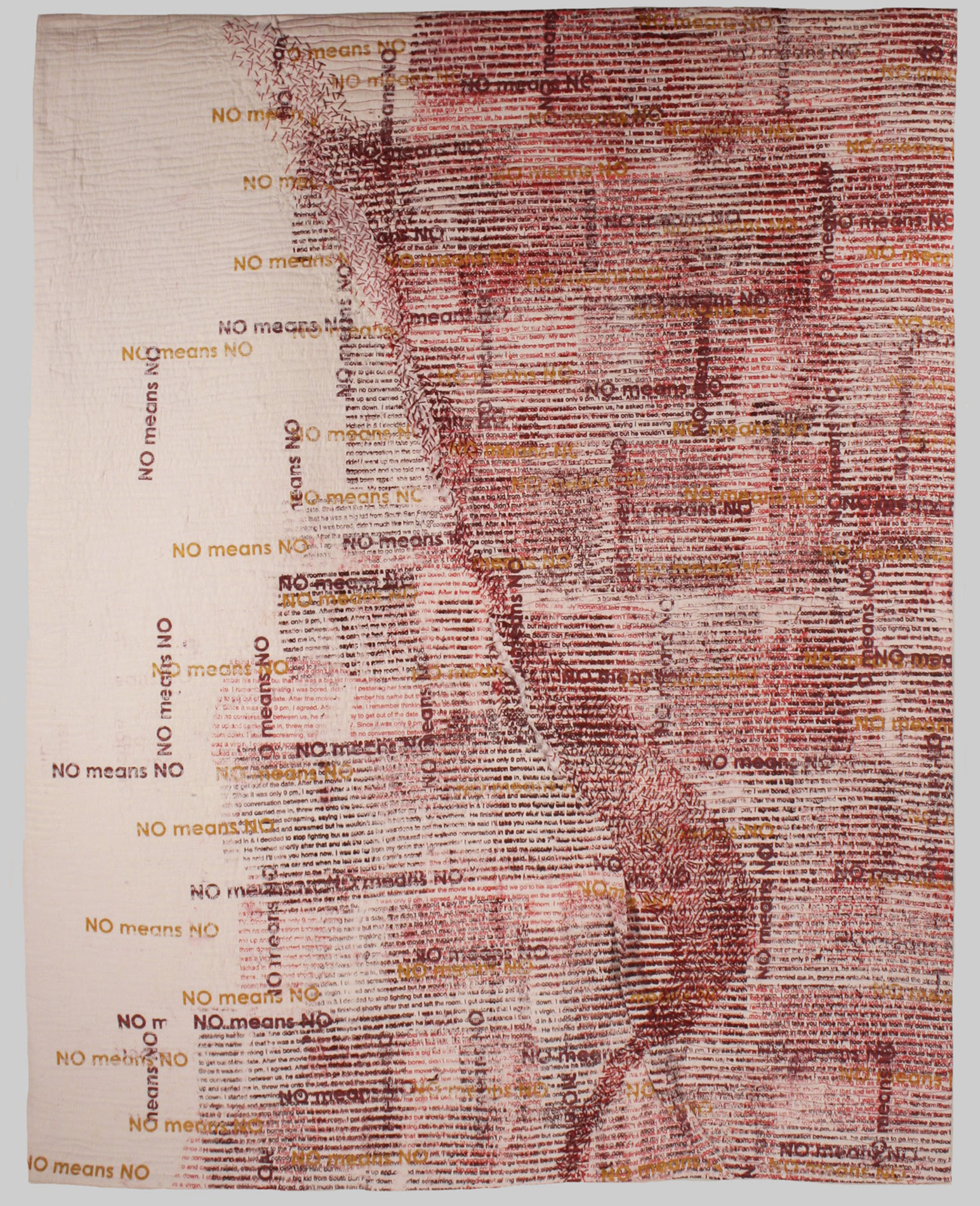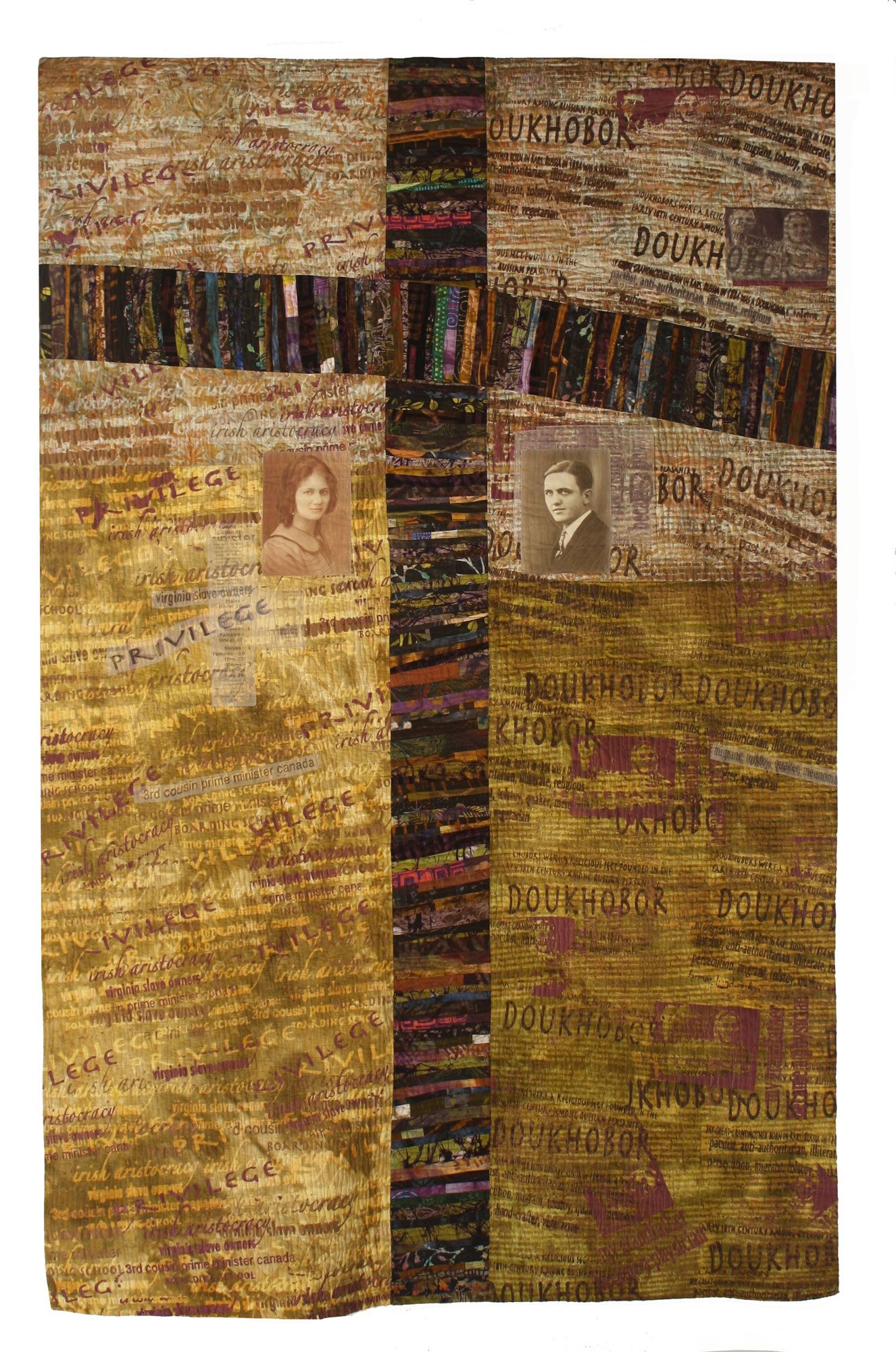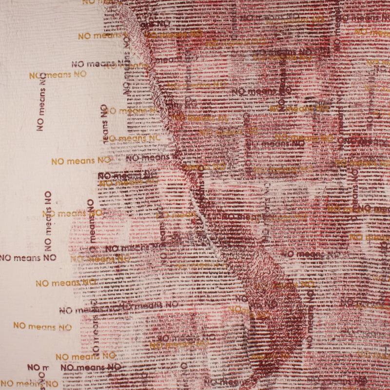 I am a storyteller. With cloth as my medium, I layer text with paint onto the cloth and embellish with images, clothing, ephemera and stitch relevant to the story. Through the examination of social and cultural values; such as beauty, women’s issues, sexual assault, social justice, aging, dementia, gun violence and climate change, I create a narrative which encourages the viewer to contemplate their own story, or point of view. My greatest reward is when others recognize themselves in my work.