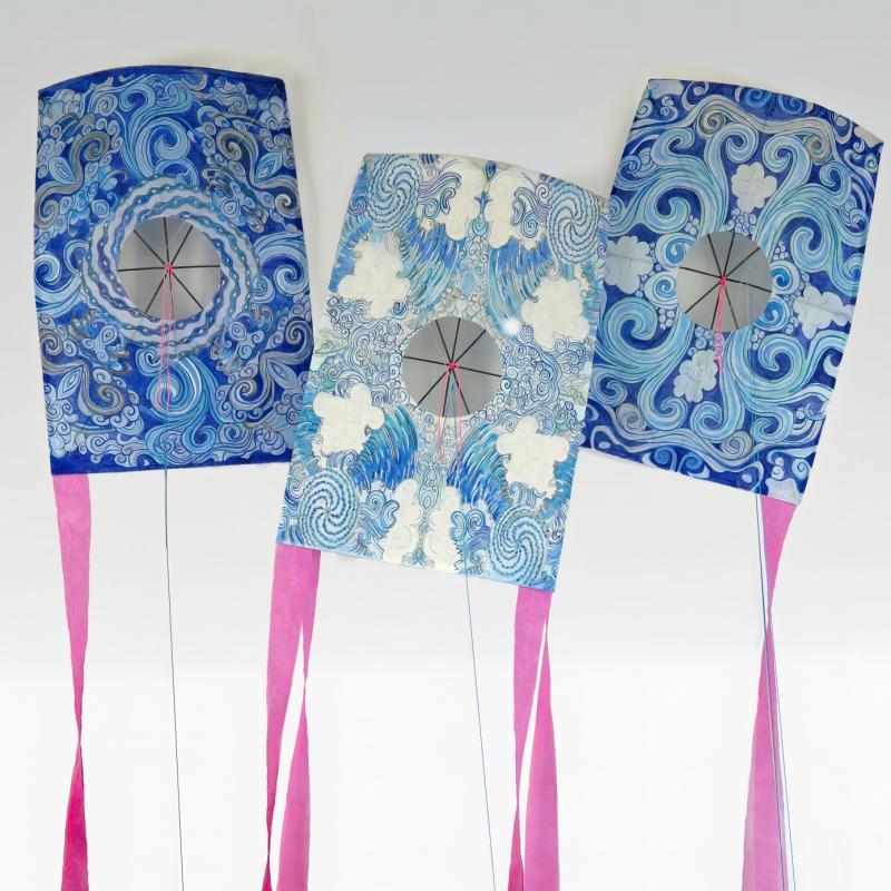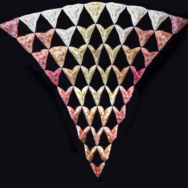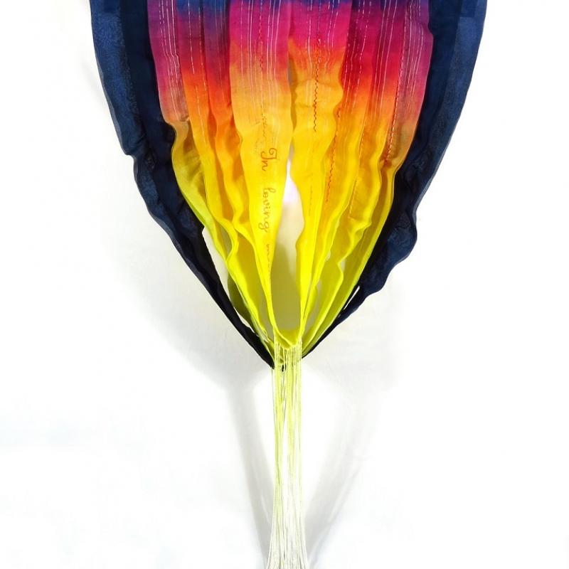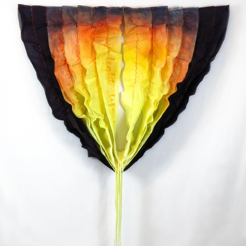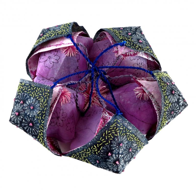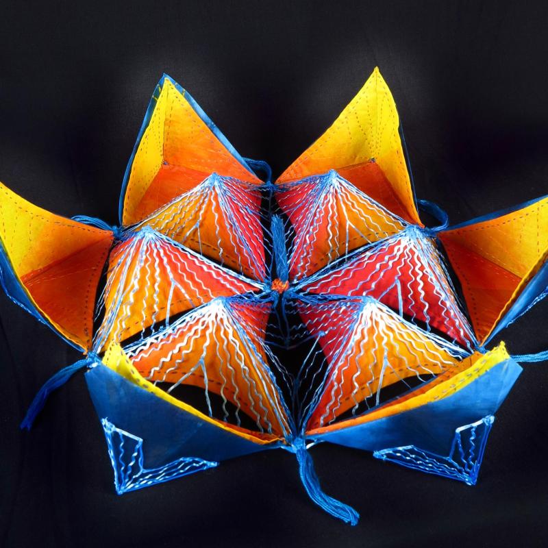 The manipulation of layered geometric forms has recently become the main focus of my work. I use creases and pleats to fold and distort fabric to create 3 dimensional structures and sculptures. Exploring intuitively I stack, layer and mark fabric then join with stitch to create complex networks.