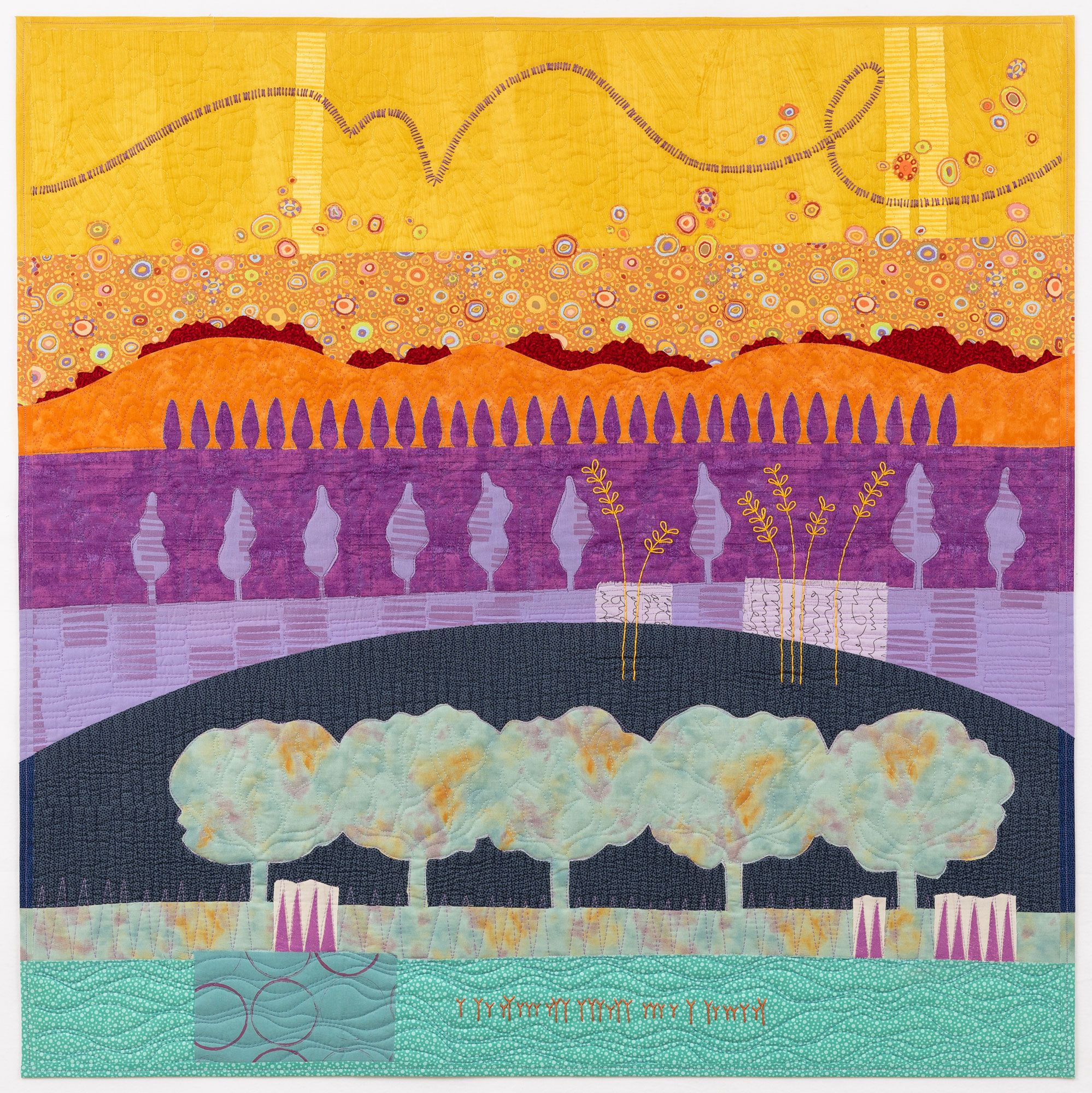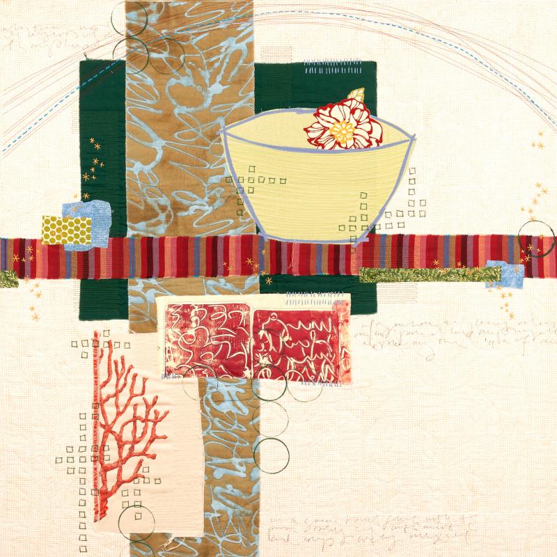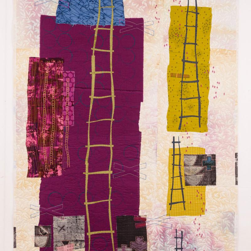 Deborah Boschert is an artist, author, and teacher who creates art quilt collages with fabric, paint, and stitching. Her work makes a striking visual impact while offering intimate details up close. She often includes personal symbols like ladders, chairs, and bowls, exploring themes of growth, transition, and curiosity.