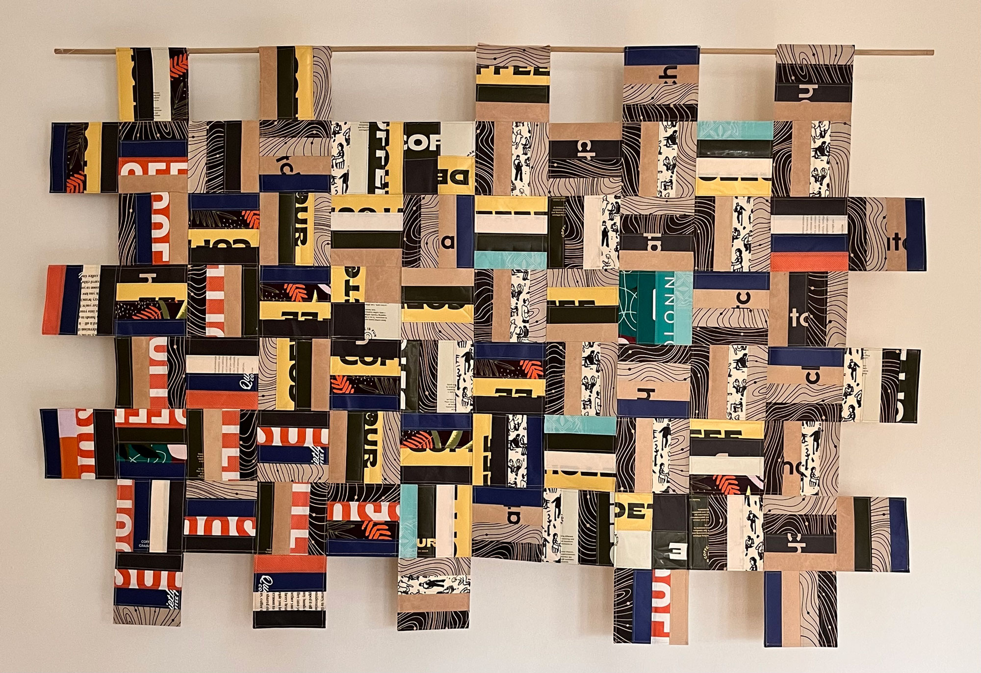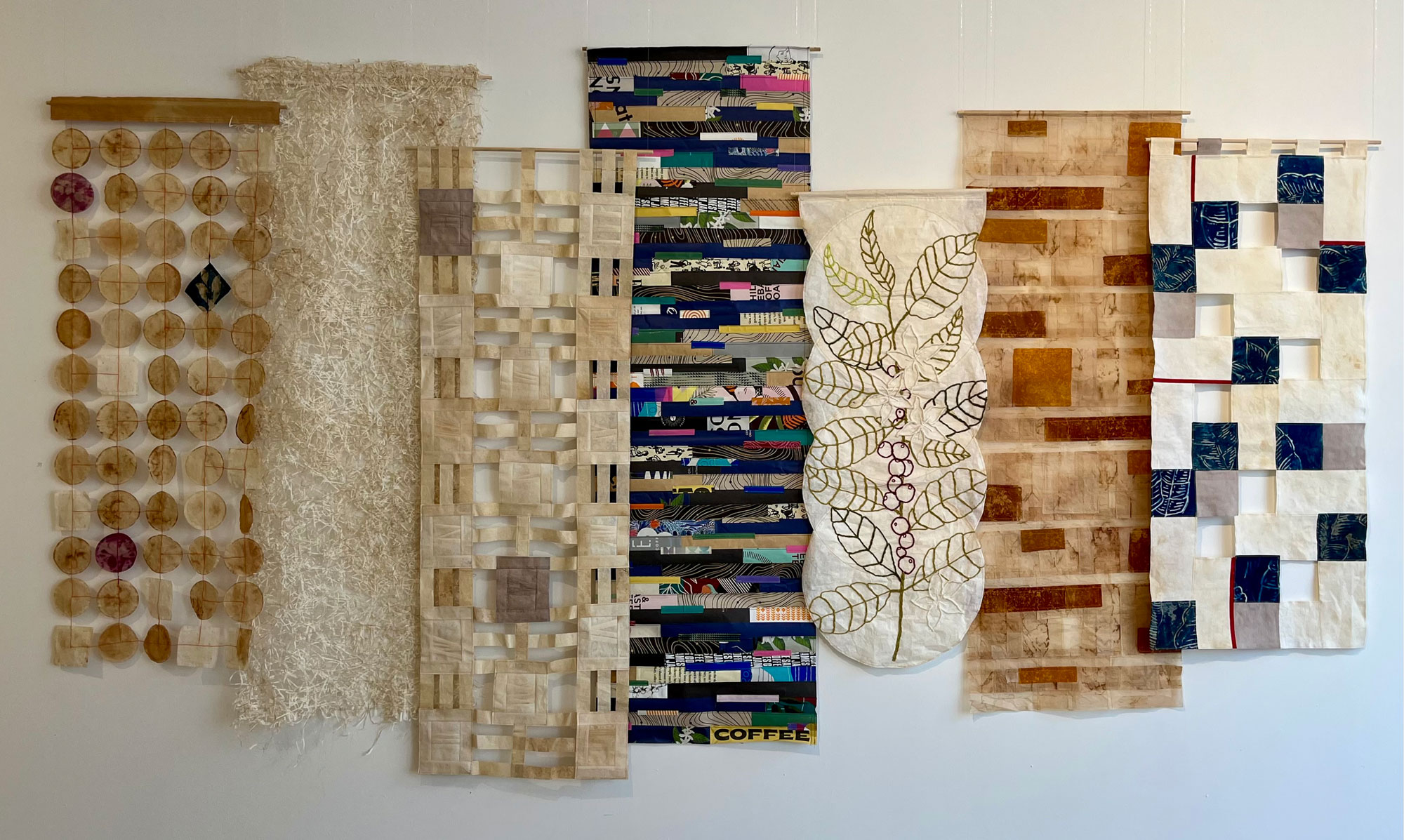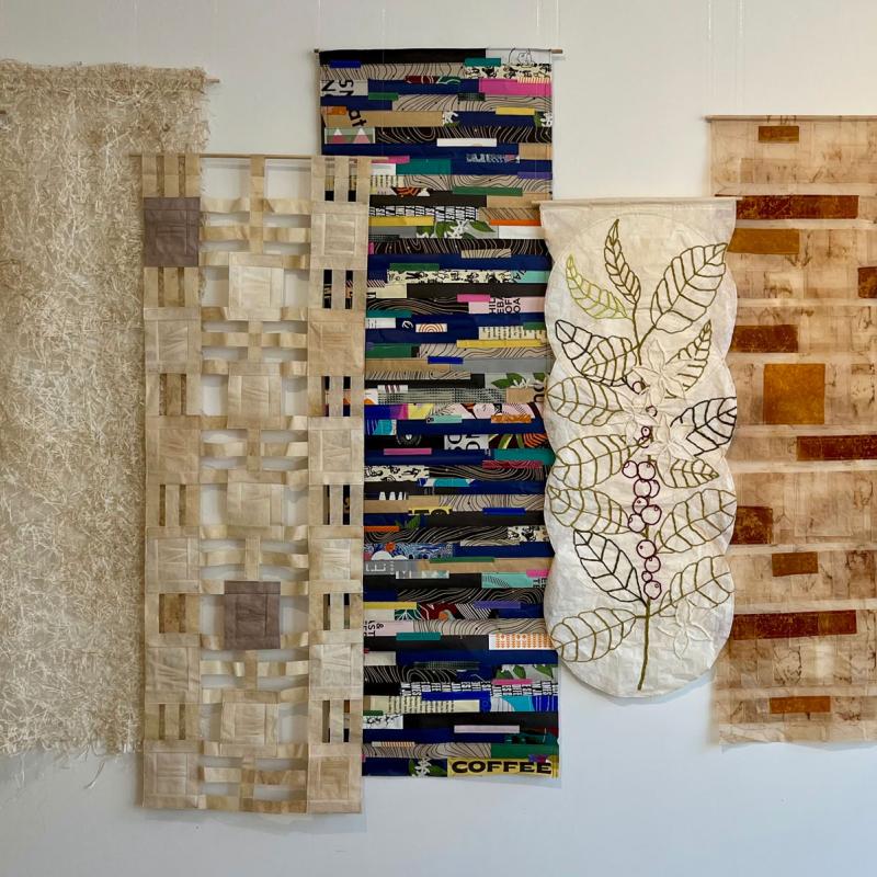 My recent body of work, the "Coffee Culture" series, and my installation "Consumed!", started with the creation of Café Curtains for the 2023 Design TO Festival. I choose to recycle materials from coffee and tea preparation, as these items capture the fleeting imprints of daily rituals, moments in time, and the comfort of home. Each used coffee filter, tea bag, coffee package, or burlap sack holds its own story, but when stitched together, they weave a larger narrative about waste, beauty, value, and reuse.