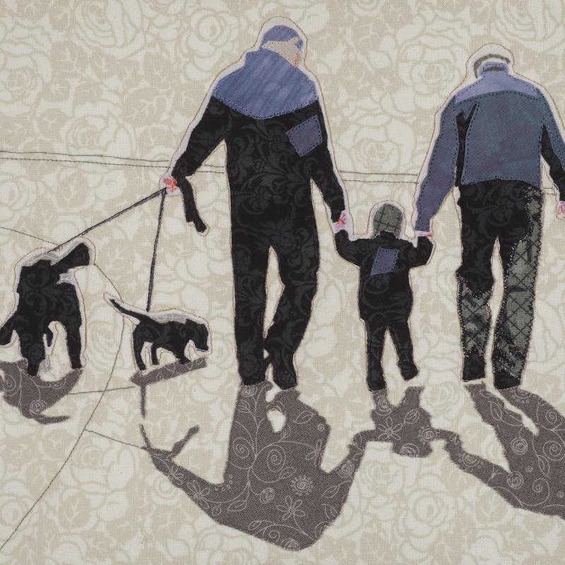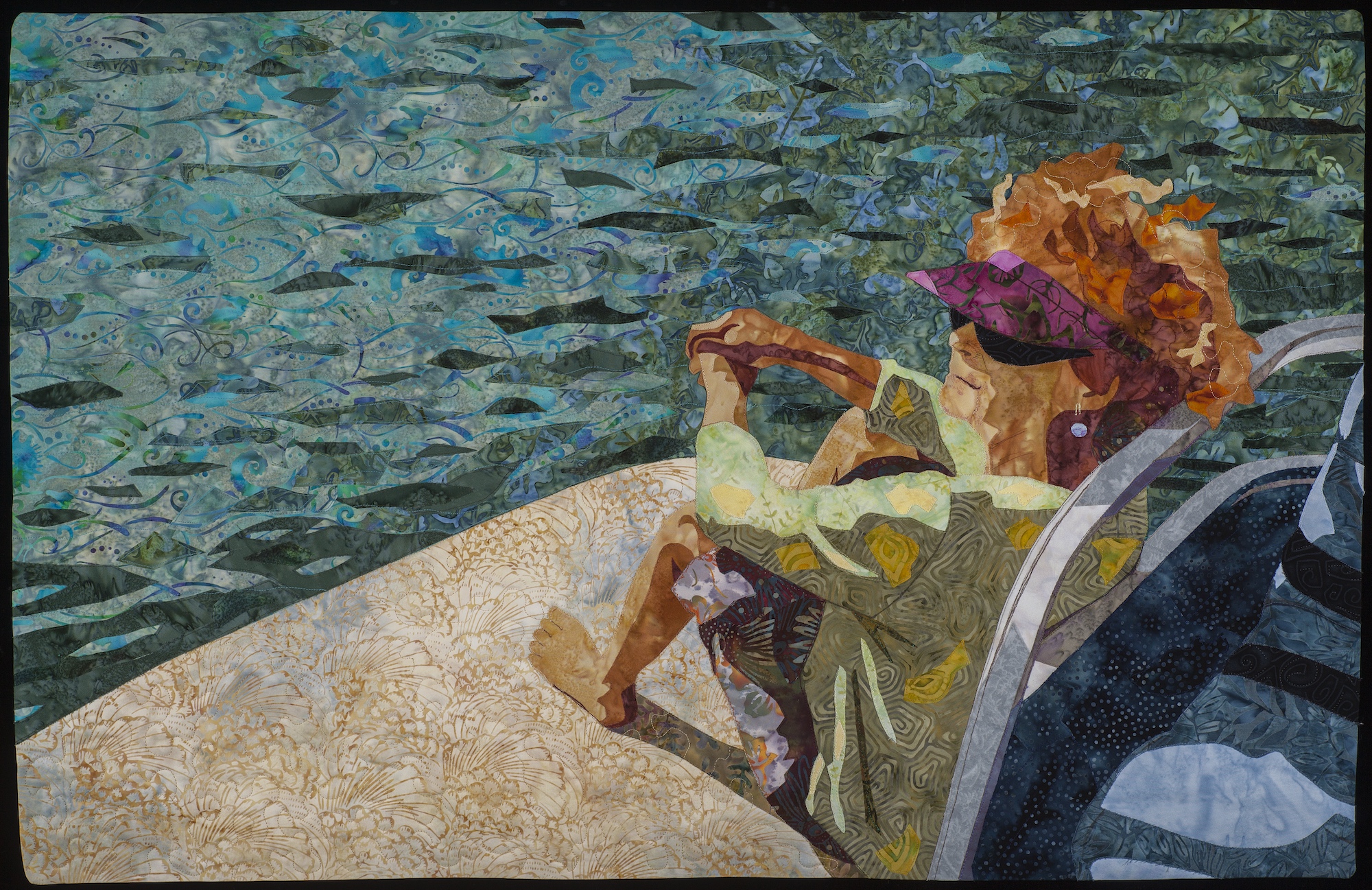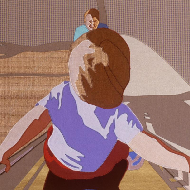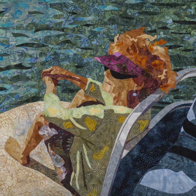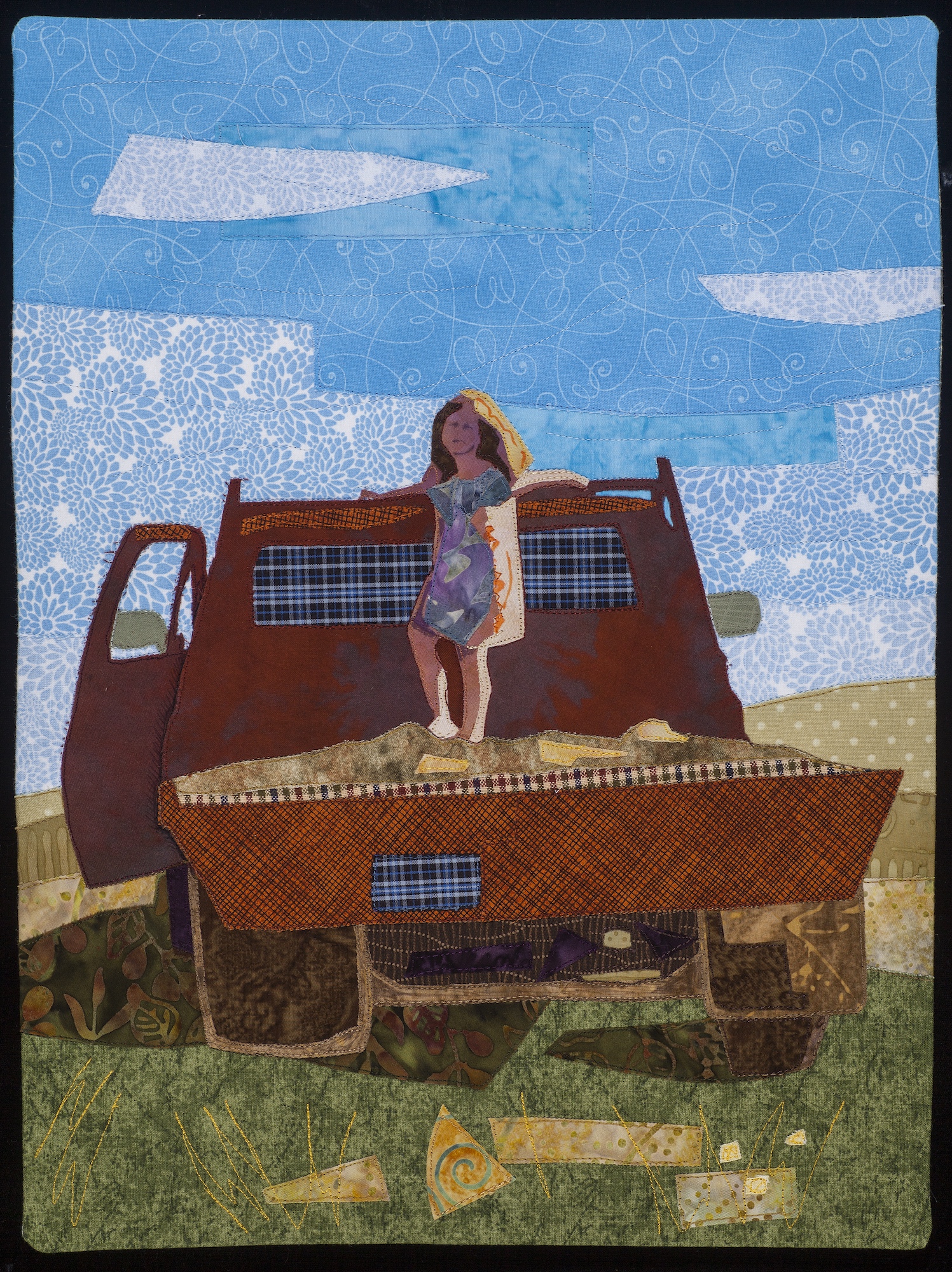 My work combines abstract and representational styles and often shows people in relationship with each other and the out doors. I respond to my surroundings as well as the changing times and current events. Impermanence and communion are themes that repeat in my pieces. Within the work I have a balance of unfinished imperfect areas with those portions clearly in focus. I enjoy the wide range of voices inherent in the medium, and the way that these qualities add to what I have to say. I often combine commercial and painted fabrics, as well as hand and machine stitching.