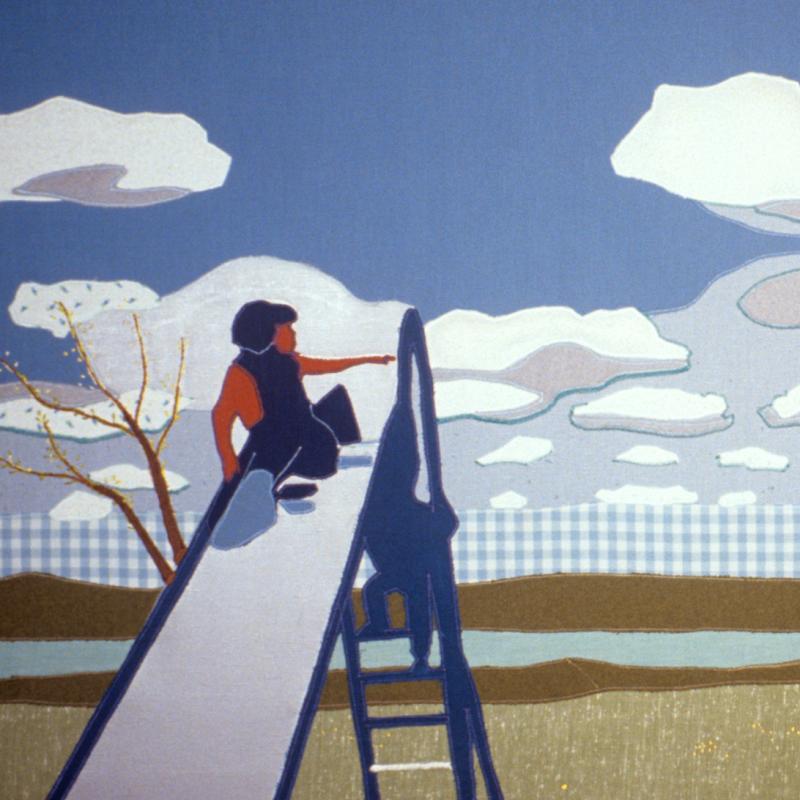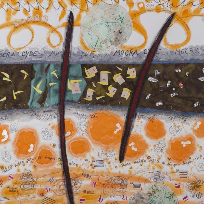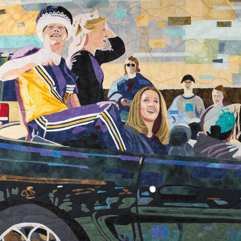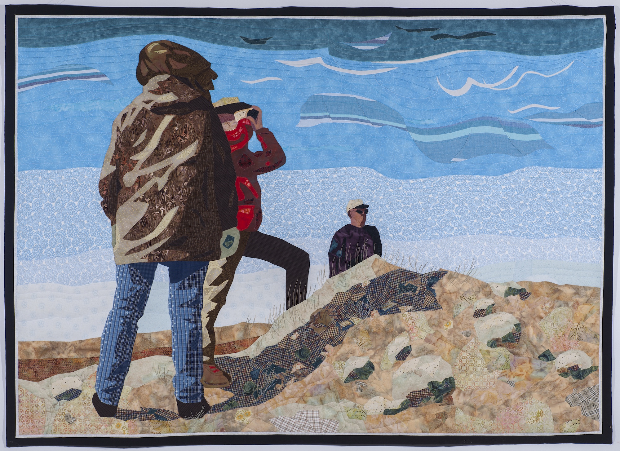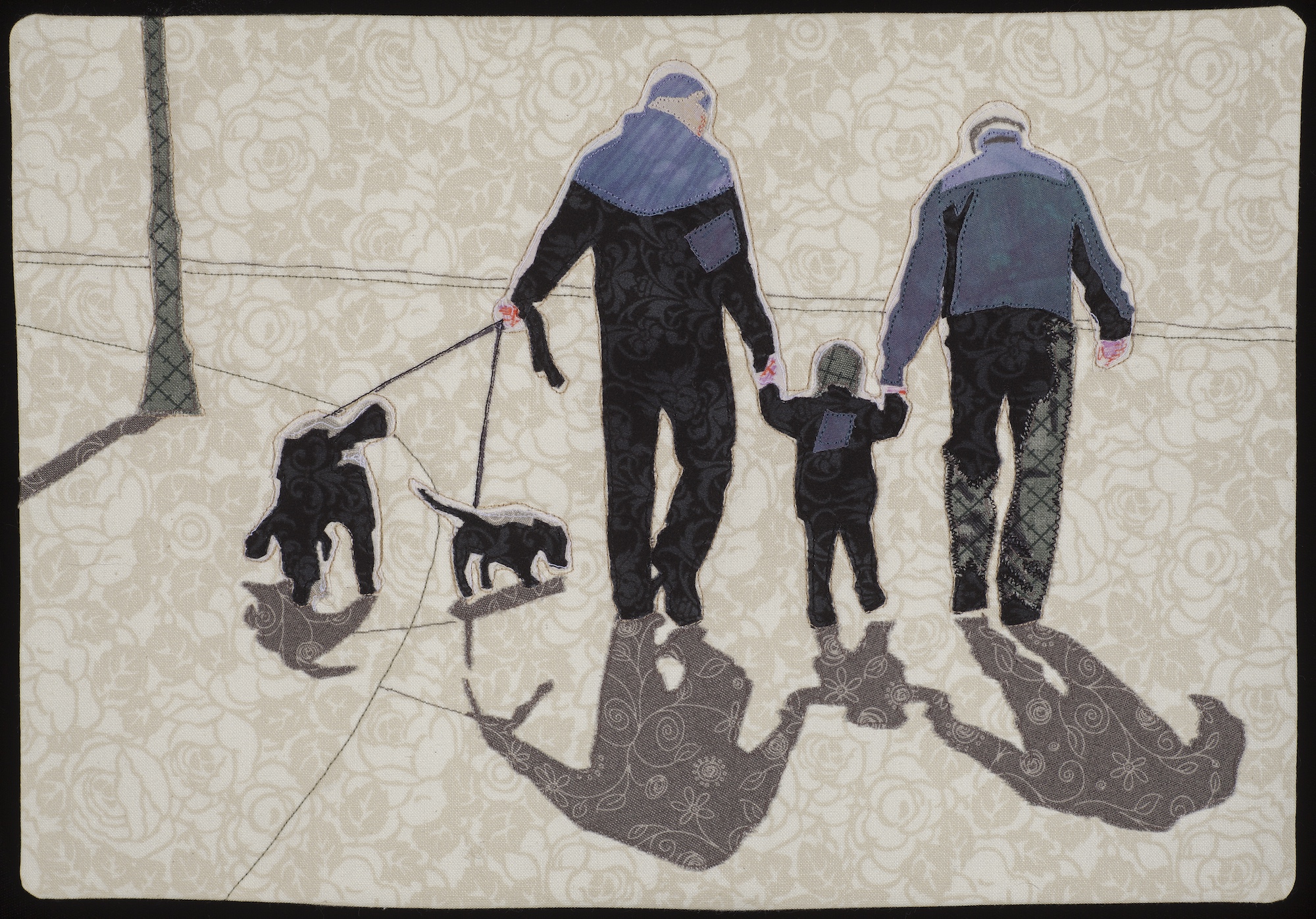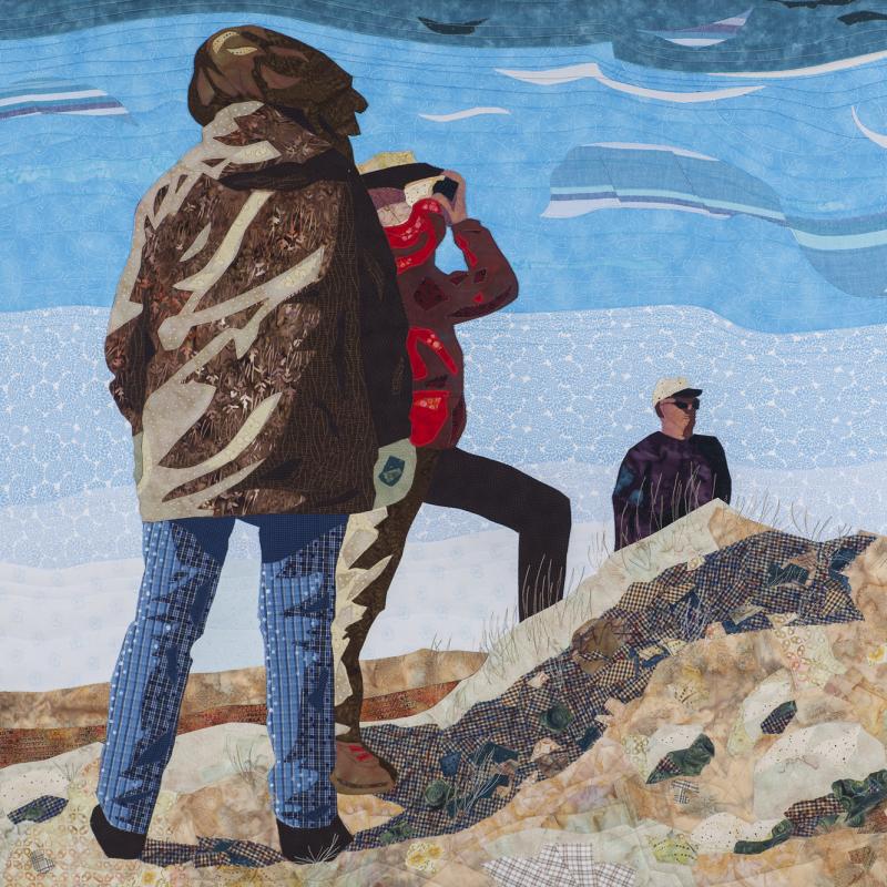 My work combines abstract and representational styles and often shows people in relationship with each other and the out doors. I respond to my surroundings as well as the changing times and current events. Impermanence and communion are themes that repeat in my pieces. Within the work I have a balance of unfinished imperfect areas with those portions clearly in focus. I enjoy the wide range of voices inherent in the medium, and the way that these qualities add to what I have to say. I often combine commercial and painted fabrics, as well as hand and machine stitching.