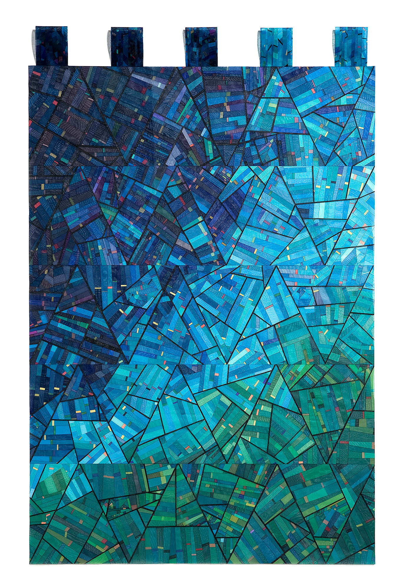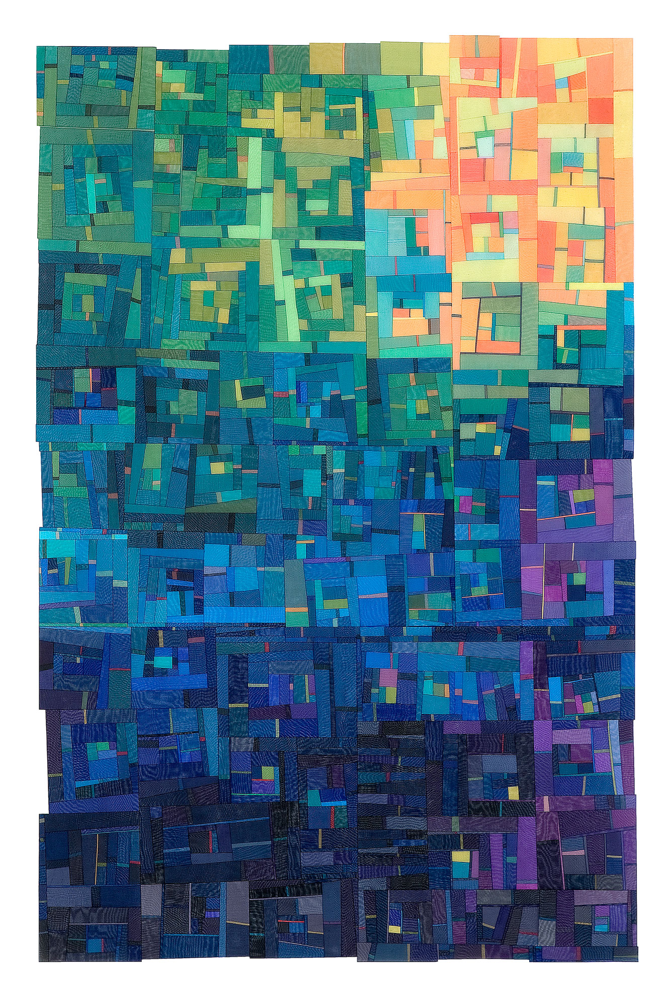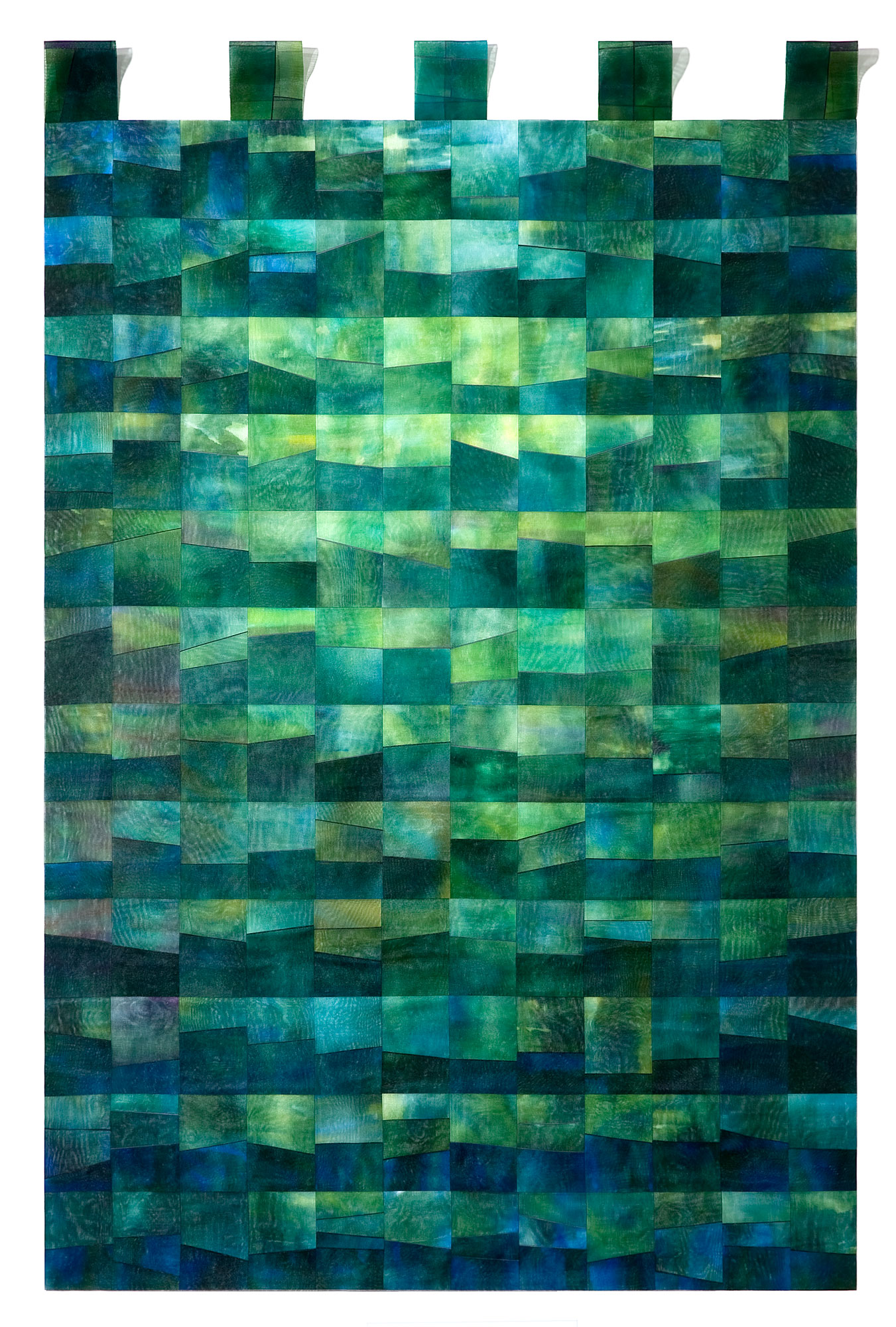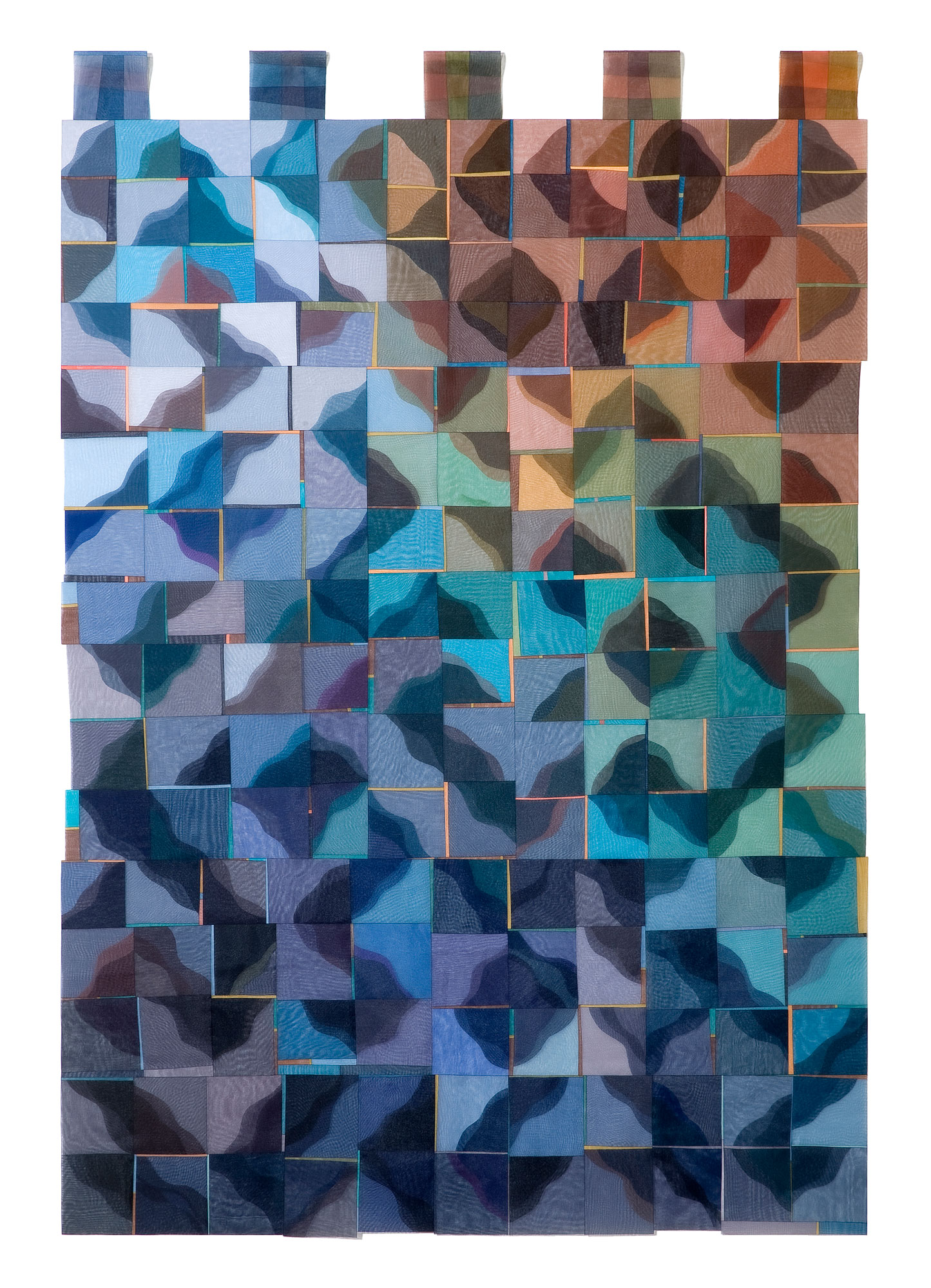 Grounded in quilting traditions of piecing and layering, I use a soldering iron—rather than needle, thread, or a sewing machine—to cut and fuse organza. The resulting fused lines are extremely thin and transparent, functioning more like fluid boundaries than seams. Depending on the direction and intensity of light, these boundaries appear or disappear, and color changes in depth and density according to the thickness of overlapping layers.