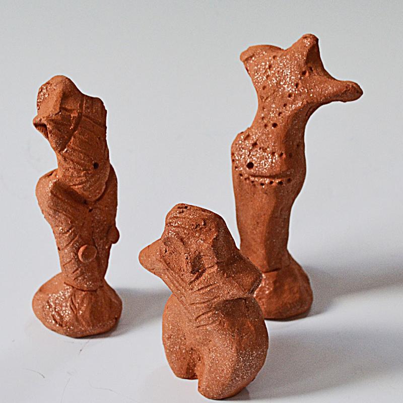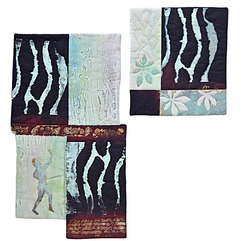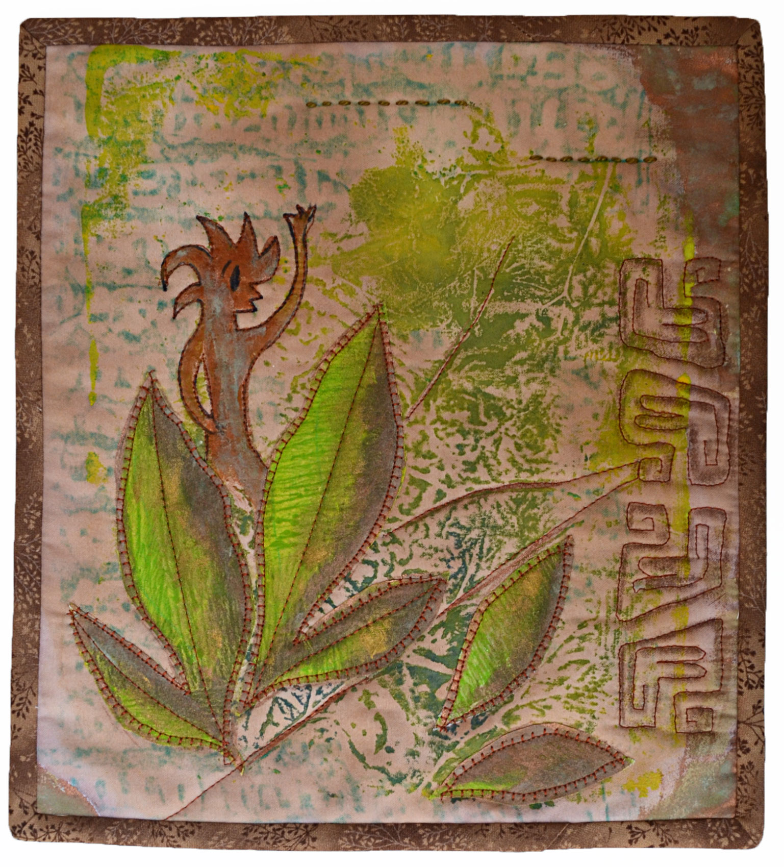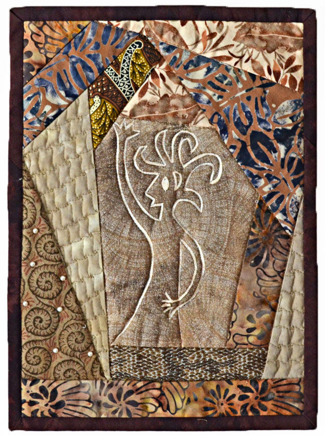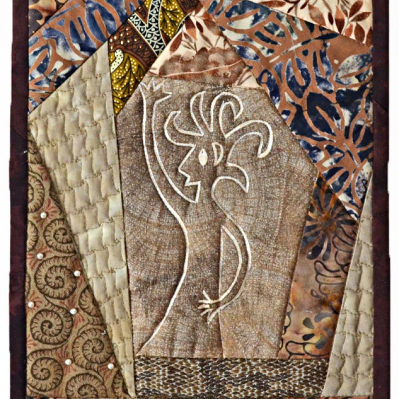 Inspirations for my quilts often come from archaeology, especially the controversial work of Marija Gimbutas. I use drawings, woodblock prints, paints, piecing, quilting, and hand embroidery to investigate motifs that interest me, such as this Bird Goddess. Sometimes the images require other low-tech forming methods, such as micaceous clay goddesses. I often frame the wood block or collagraph when I finish printing a series of images on fabric.