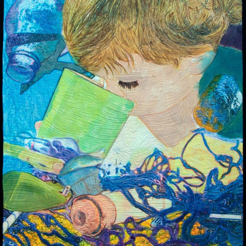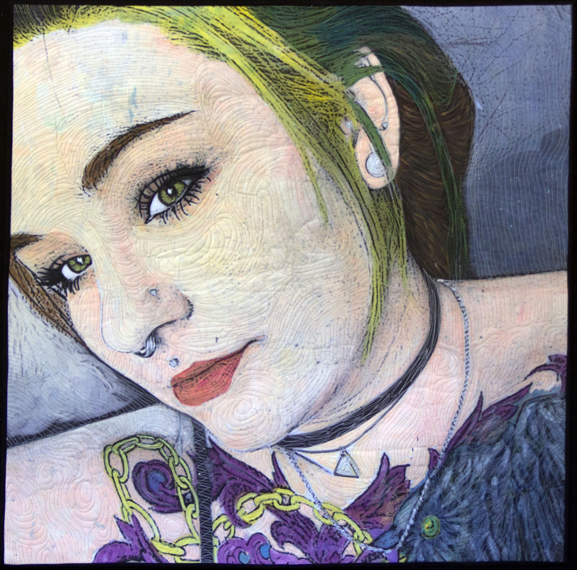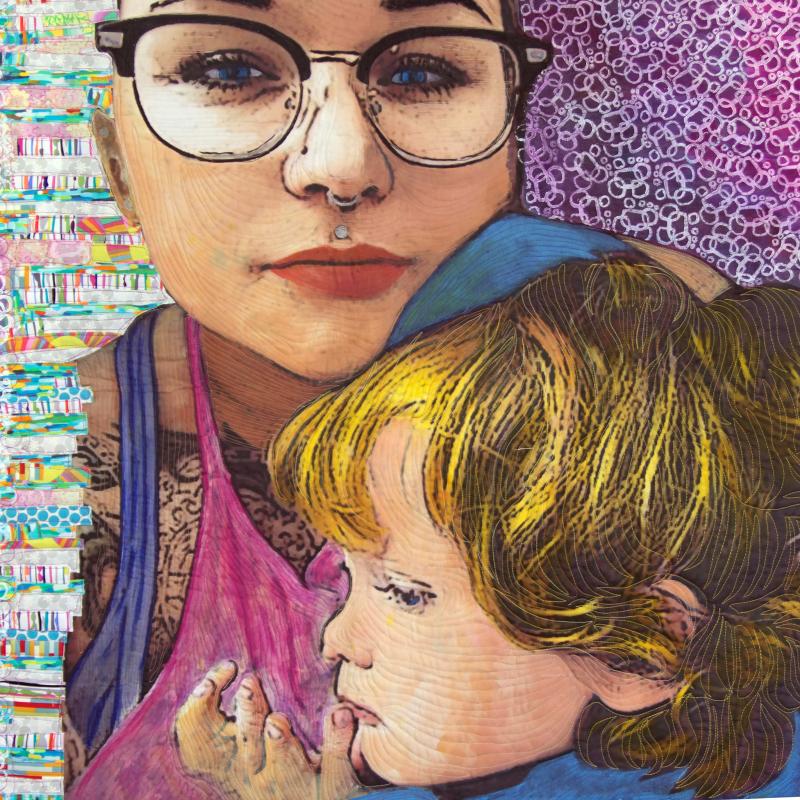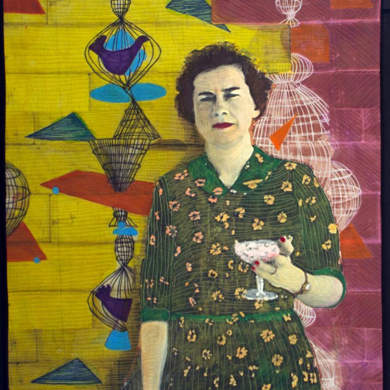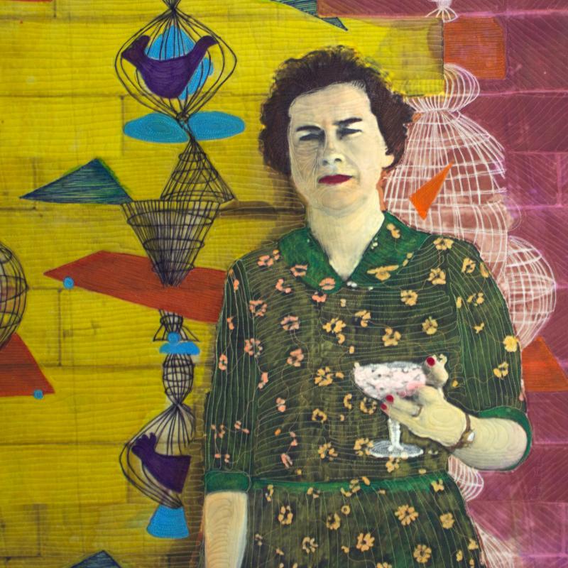 Taking cues from pop art, surrealism, and contemporary portraiture, I use traditional painting techniques with digital tools to convey complex ideas and compositions with layered imagery. My subject matter is always connected to my life. Source material includes vintage family pictures, stock photos, to cell phone snapshots. I use a variety of surface design processes applied to linen cotton canvas. The entire surface is enhanced with contour stitching. The finished artwork is hung like a tapestry; floating slightly beyond the wall.
