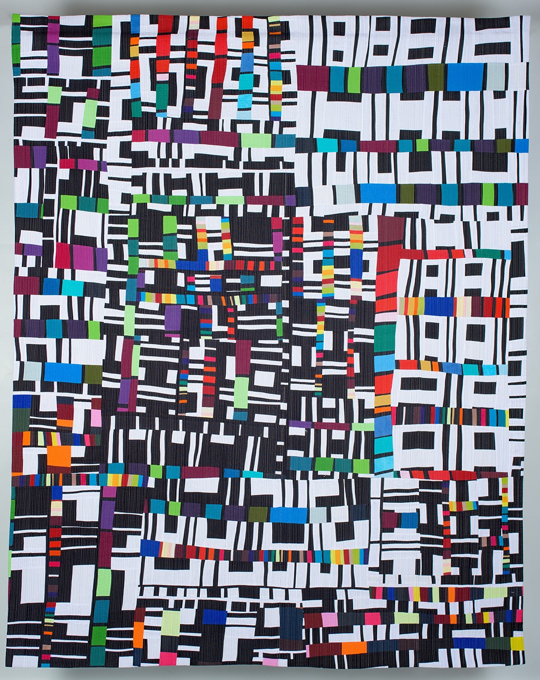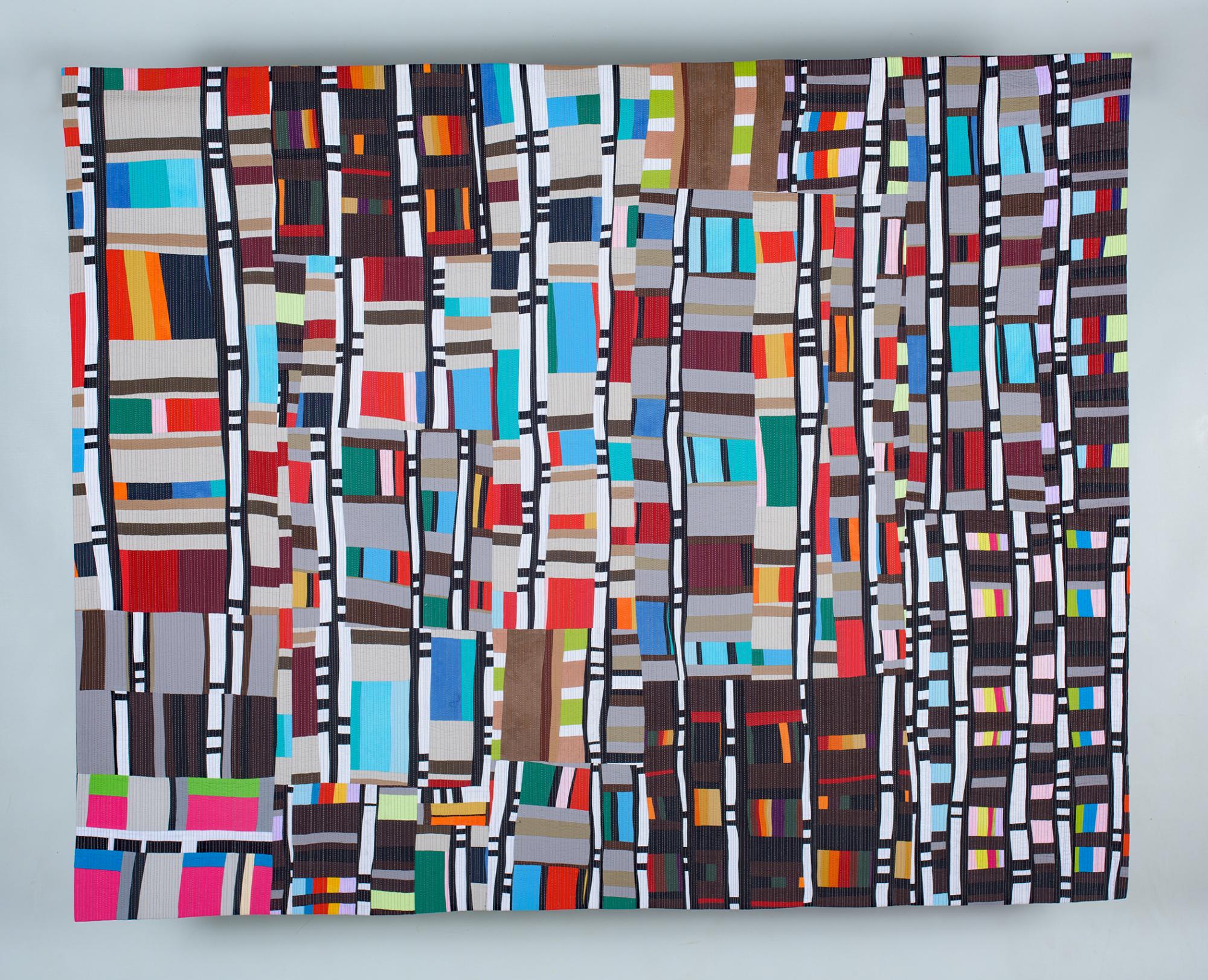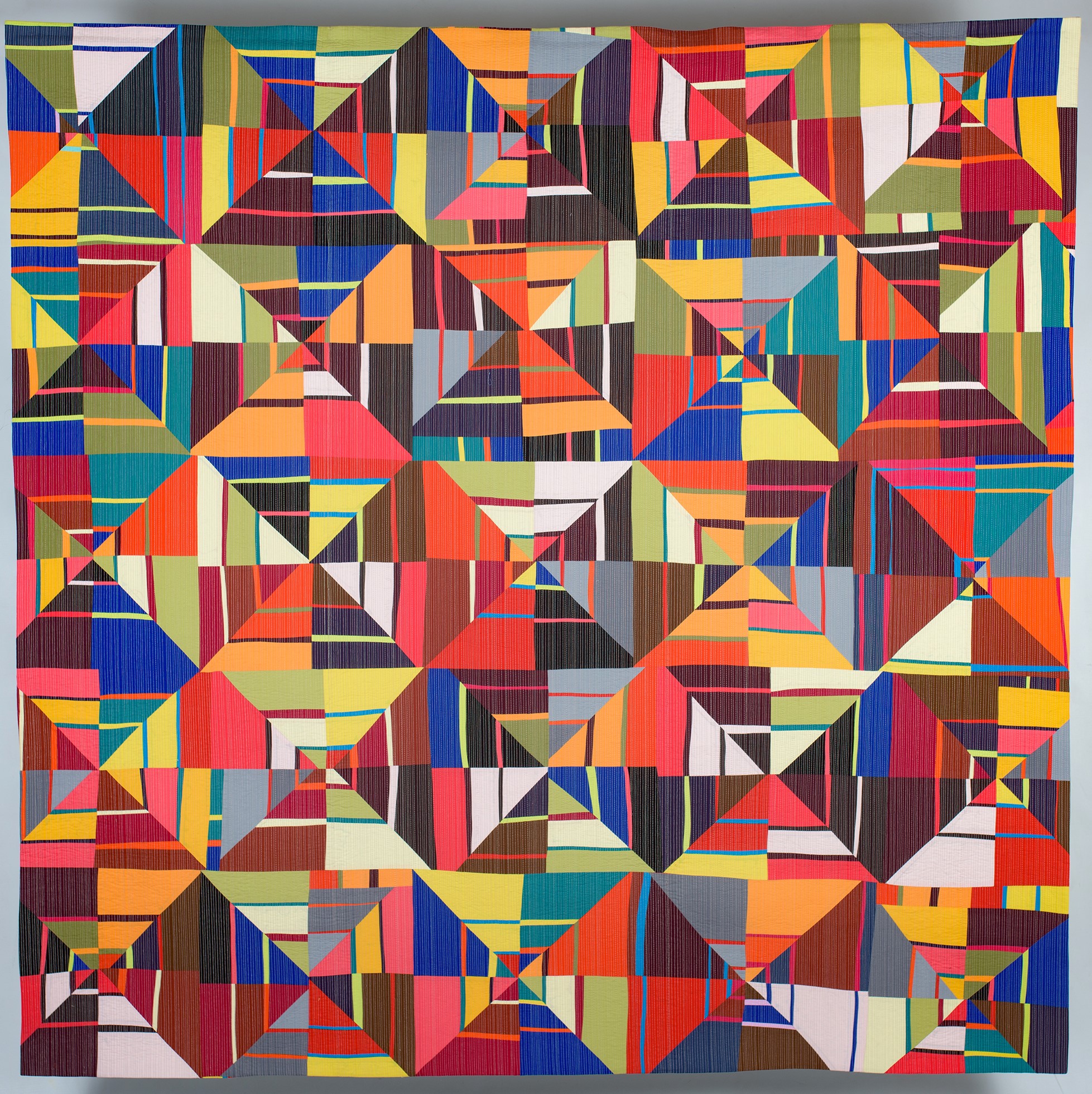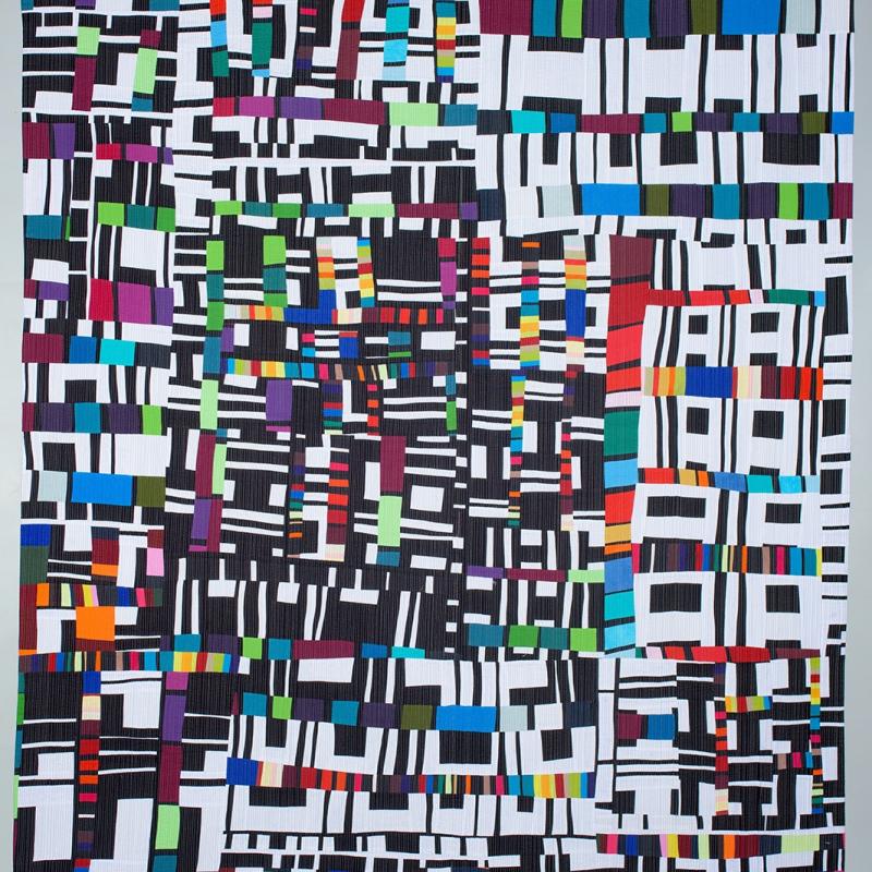 I am an improvisational textile artist. The rhythm and repetition of piecing fabric, cutting into the new configurations, and re-joining them--without ruler or measurement--create vigorous, abstract structures. Bold color and value choices further propel the musicality of the compositions. The works are densely quilted, flattening the images into dynamic fabric paintings.