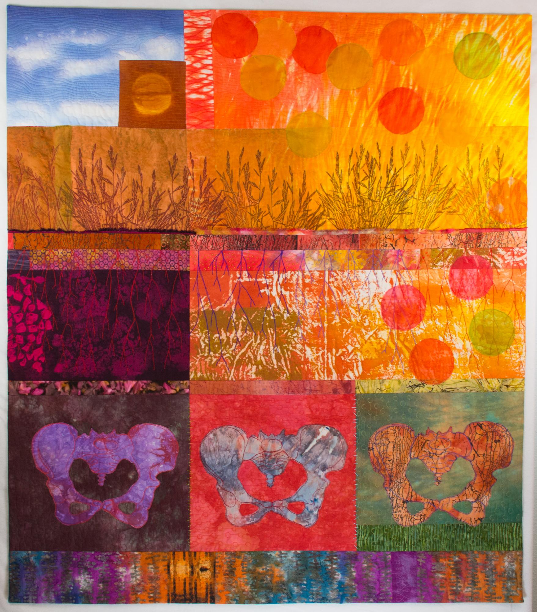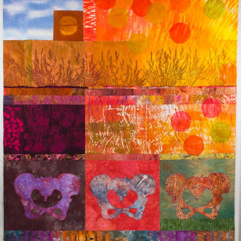 I create art quilts using hand-dye processes, printing, layering, piecing, and fusing. My work reflects a visual exploration of who, what, and where I am. I focus on how it feels to inhabit a human body, on feeling states, as well as elements of landscape. I often work with layers, both in substance and meaning. I delight in surfaces that resist solidity, and in the play of light—reflections, translucency, and shadows.