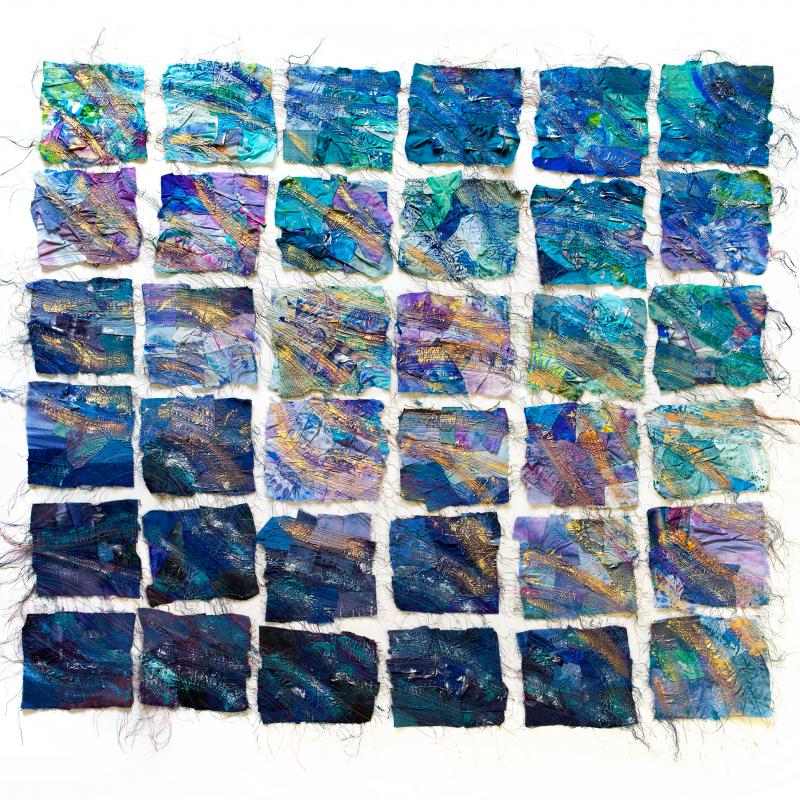 For years I have been exploring the complexity of life and responsiveness of each of us to each other through my ’Hanging By A Thread’ series. My current body of work, 'Democracy...Hanging By A Thread' is my visceral response to what is currently happening in our political arena. Fabric, paint, and thread mimic the many layers of our society. The layers and layers of fabrics on each square represent the depth of individual personalities and the size of the squares, naturally, speak for each of our physical differences and how we are respectively so unique. The threads are our connectors as each thread shows us how delicate and tenuous our relationships can be. These threads alone are thin and vulnerable but together each stitch strengthens and builds relationships and communities for the greater world.