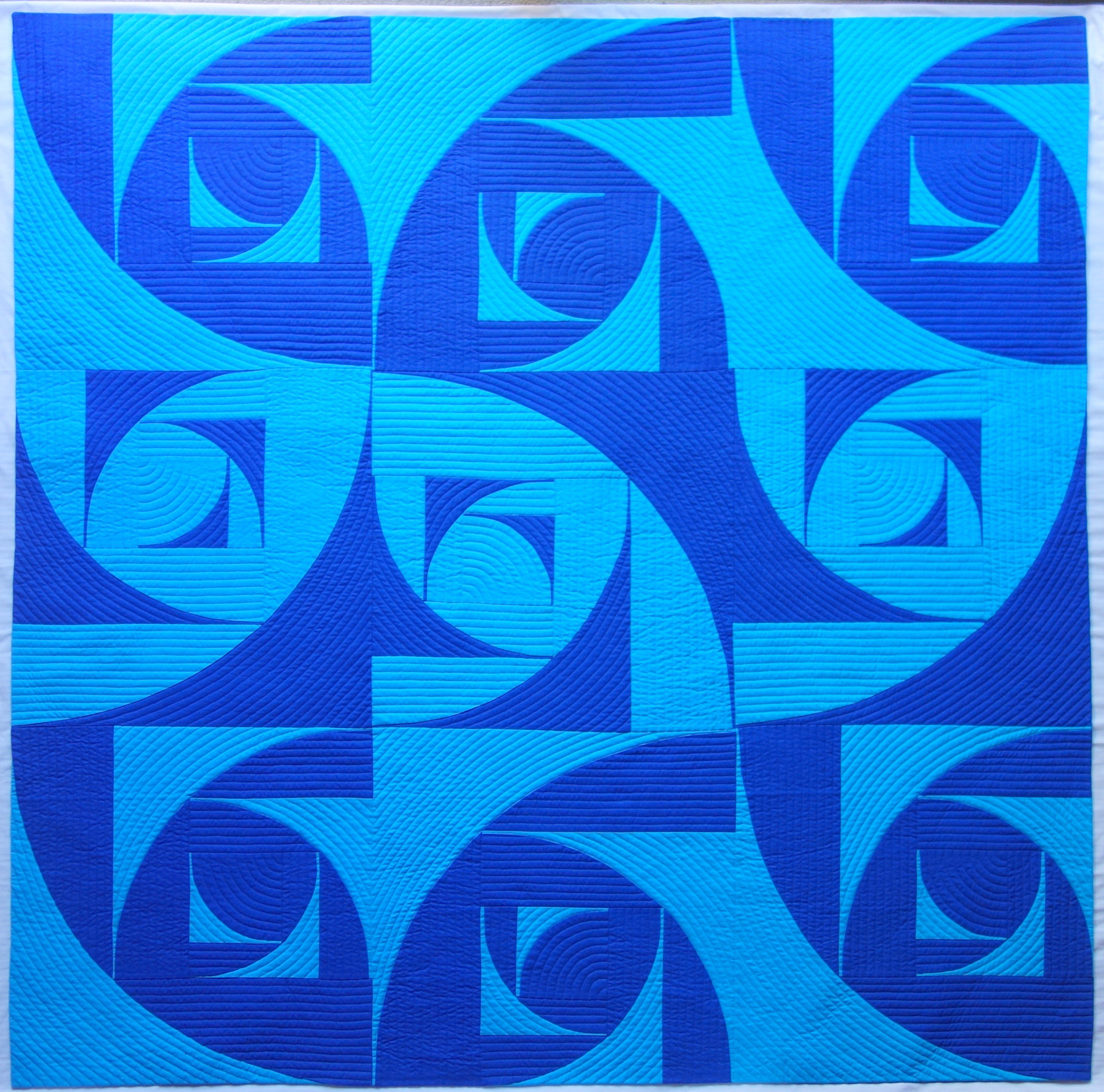 I like to bring math into my quilt designs. The images on this page are of quilts with large blocks that comprise nested and rotated Drunkards Path blocks in different sizes. I have also done this sort of thing with hexagons.