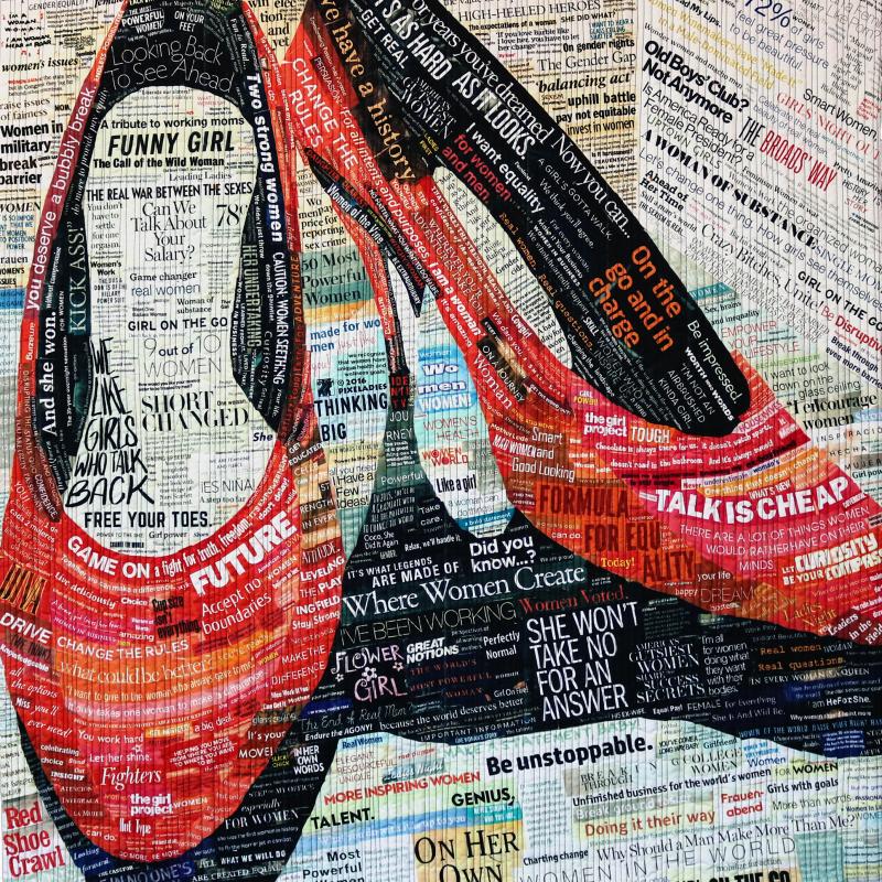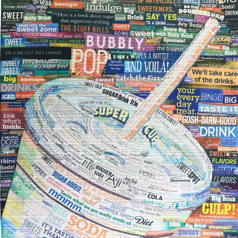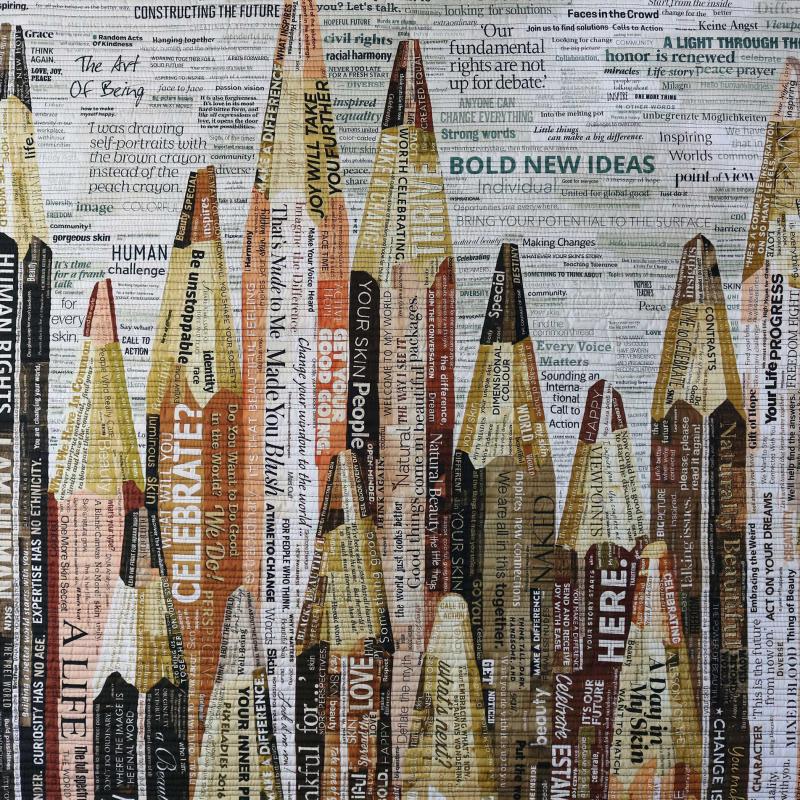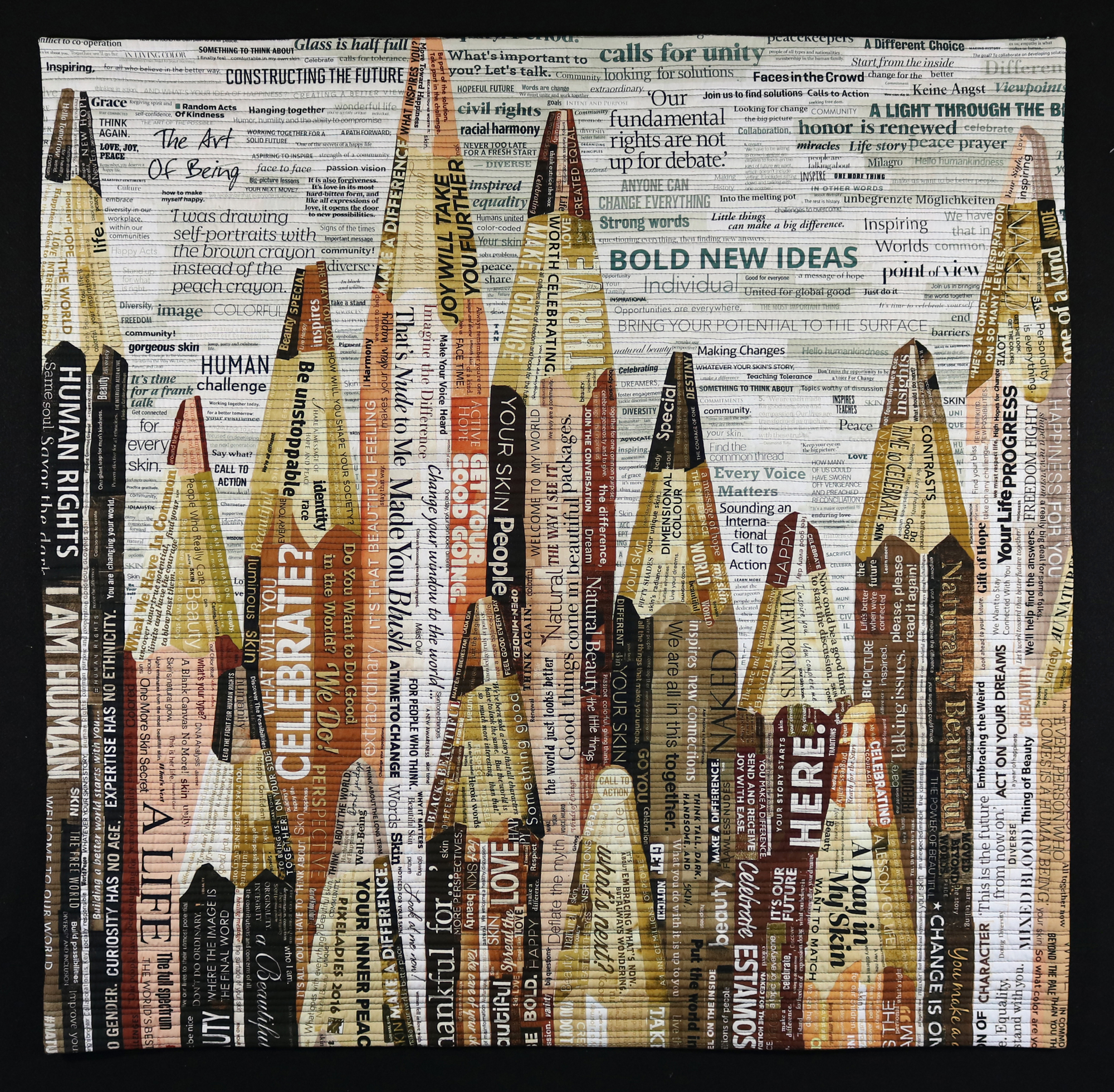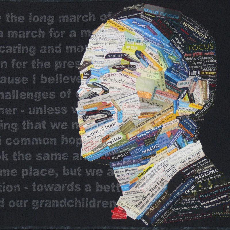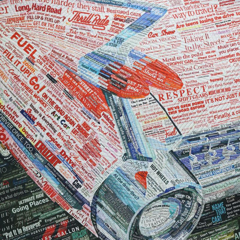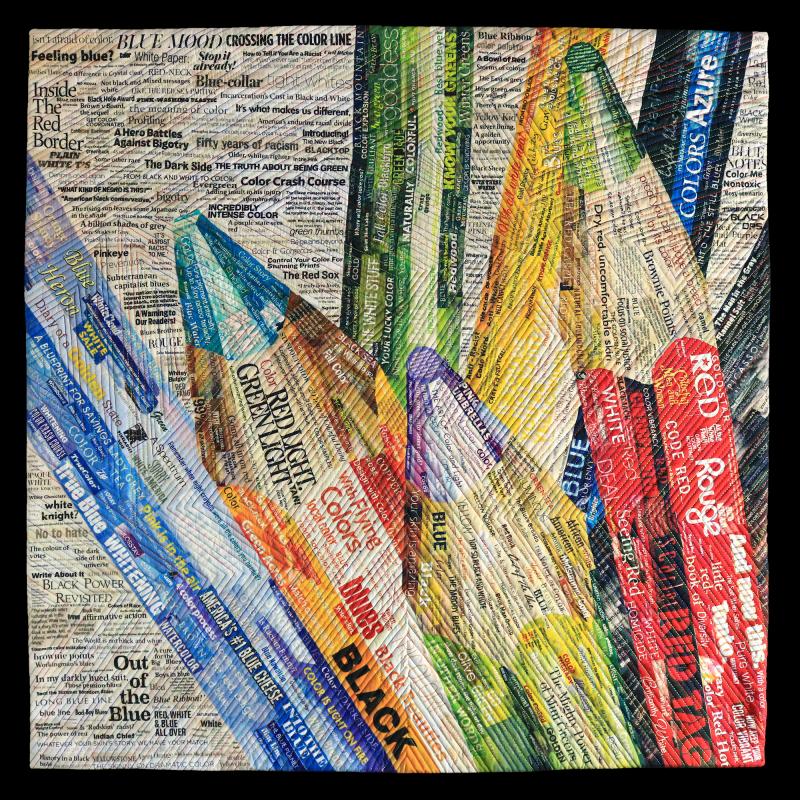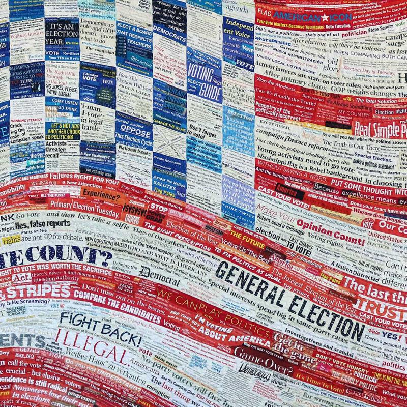 A love of language and word forms combine with a strong sense of social justice to drive the Pixeladies (Kris Sazaki and Deb Cashatt) to make art out of headlines. Their dramatic imagery is formed from collages painstakingly cut and composed from the headlines featured in a wide array of publications. The Pixeladies then scan the collages into the computer and have the final version printed onto fabric. The resulting whole-cloth quilt is densely quilted by machine or by hand. Each political statement is laced with humor, making the experience of Pixeladies' artwork unforgettable.
