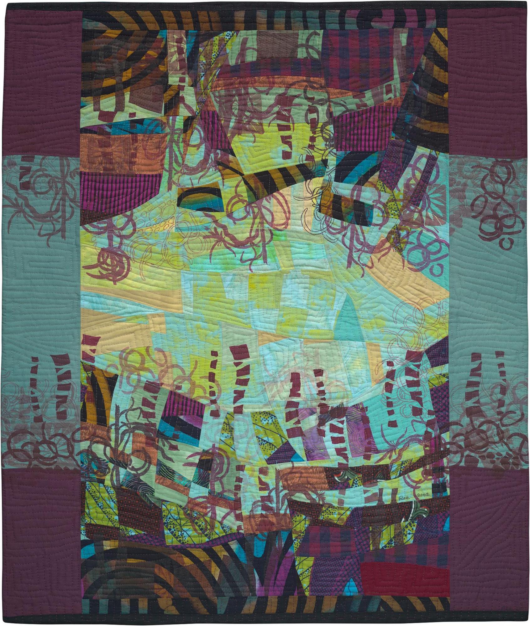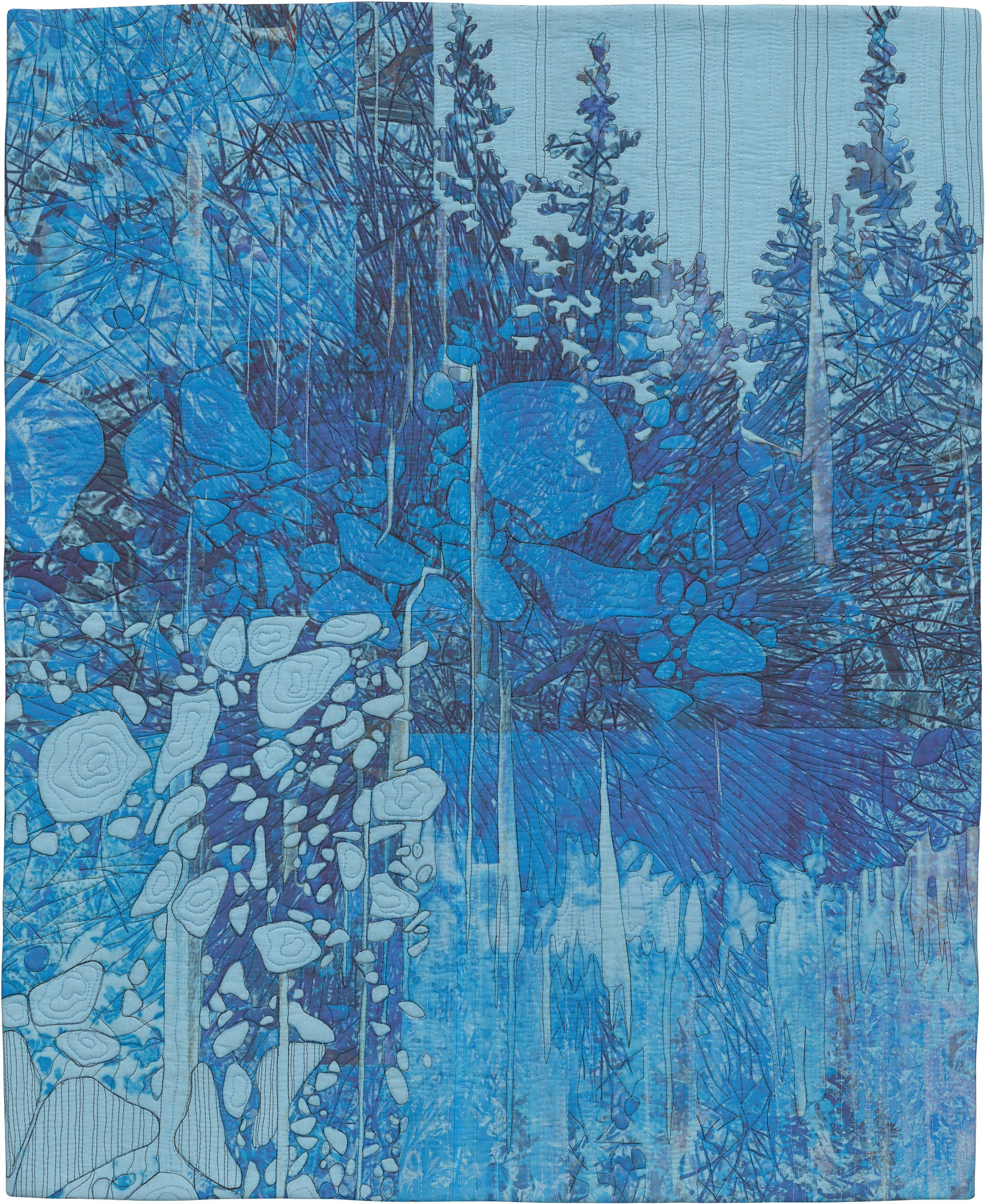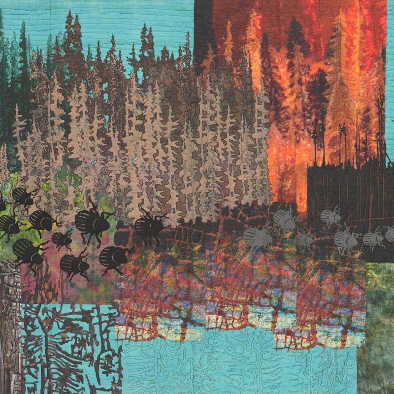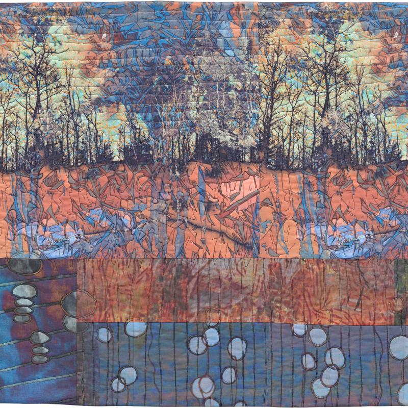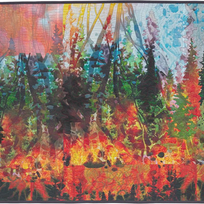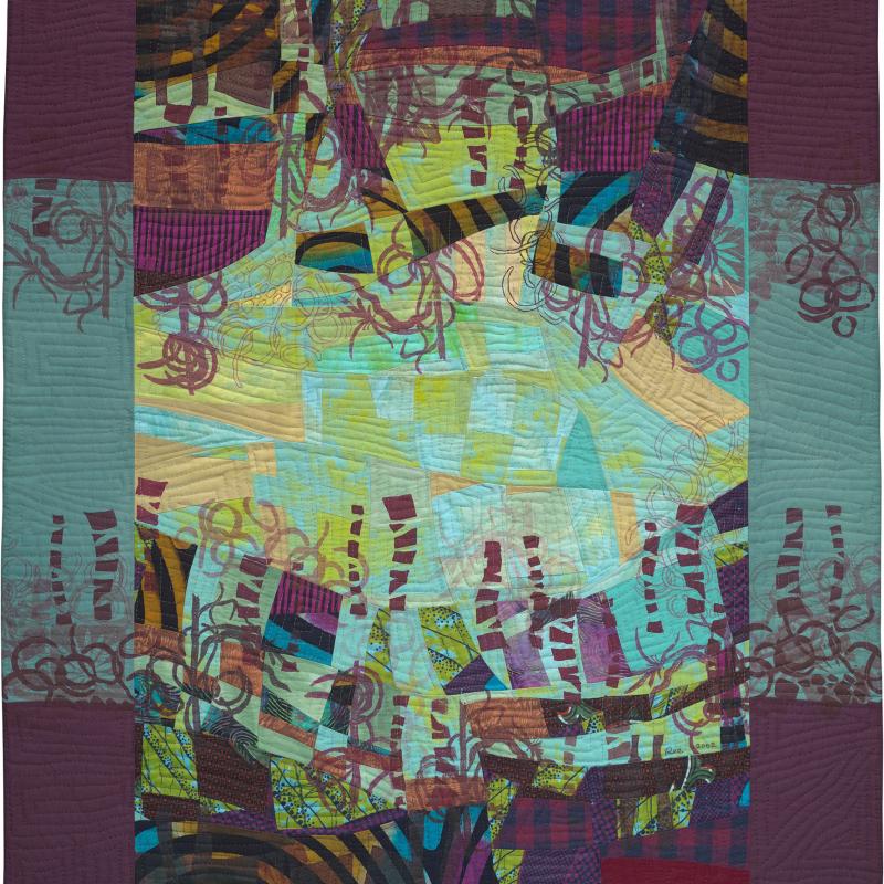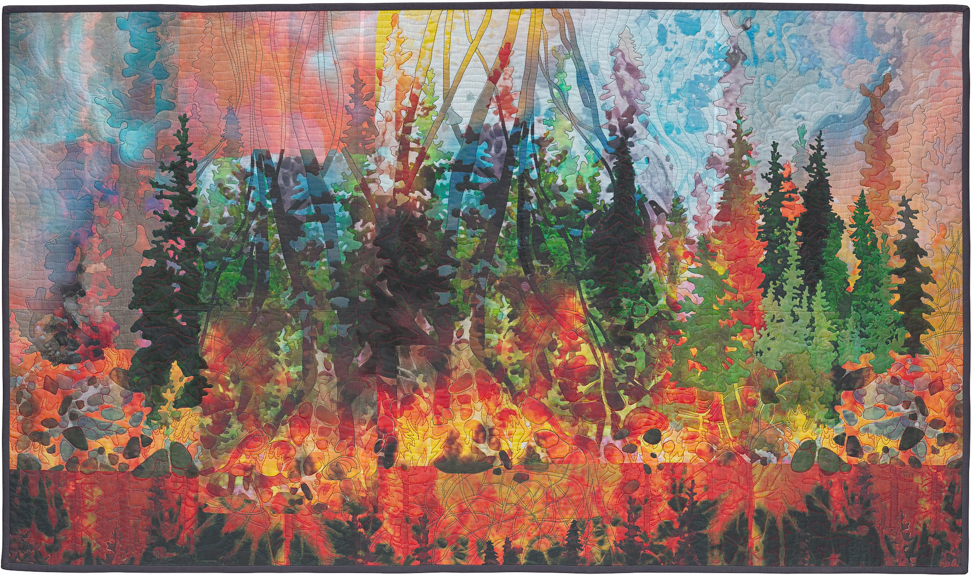 I am an Alaskan artist who has lived remotely for many years but is currently in Fairbanks. Working with scientists has changed how I see the world and describe it visually. I am currently working digitally, incorporating images of drawings, immersion, clamp-dyed fabrics, silk-screened and deconstructed silk-screened fabrics, and photographs. I experiment with images, create new and unusual color palettes, and express ideas that have interested me for years. Final designs are custom printed on fabric, sewn together, and quilted elaborately.