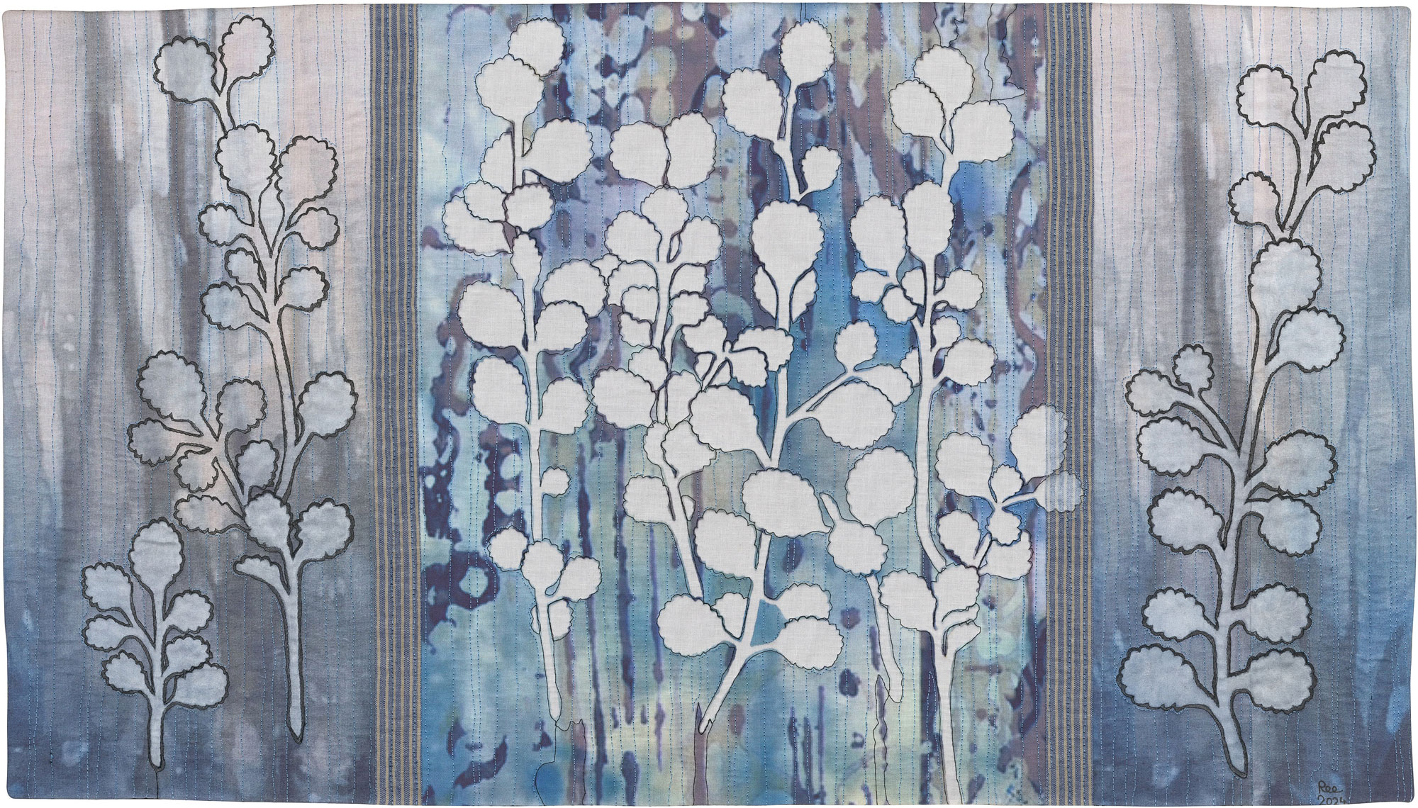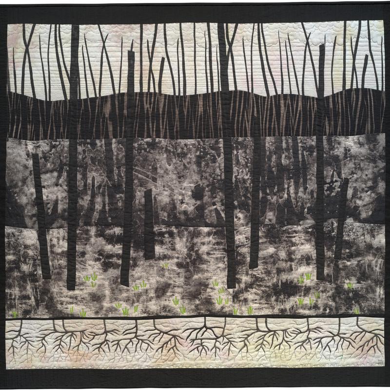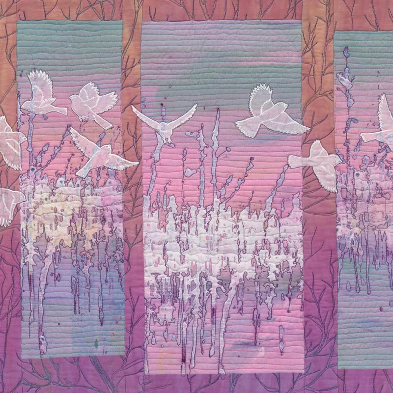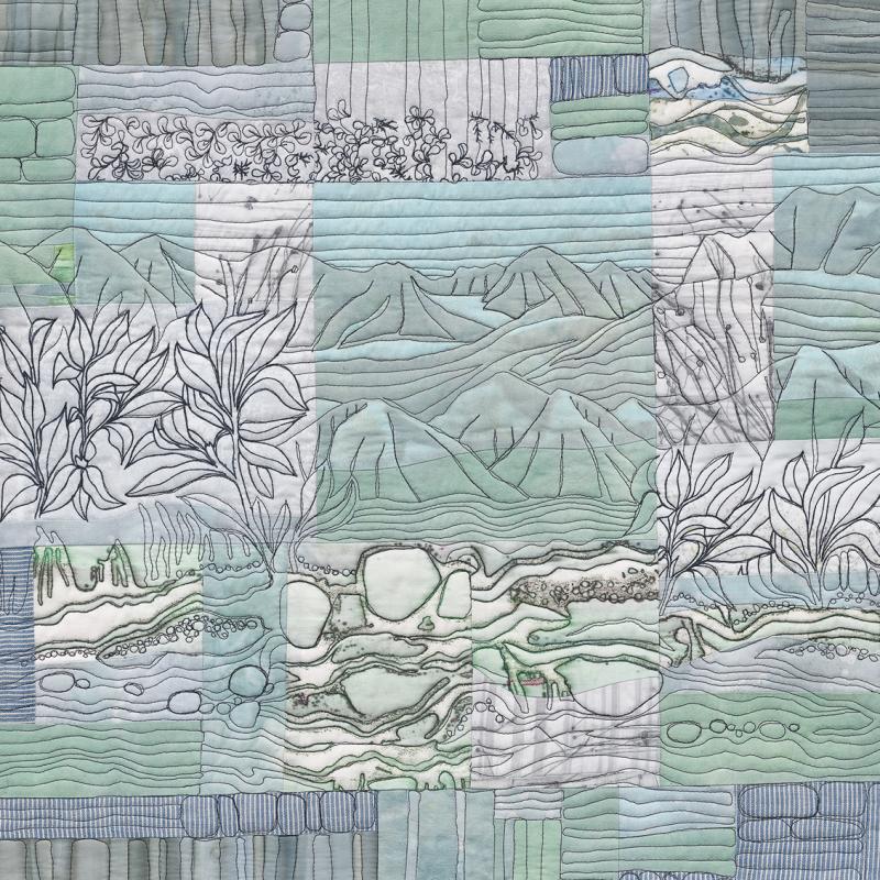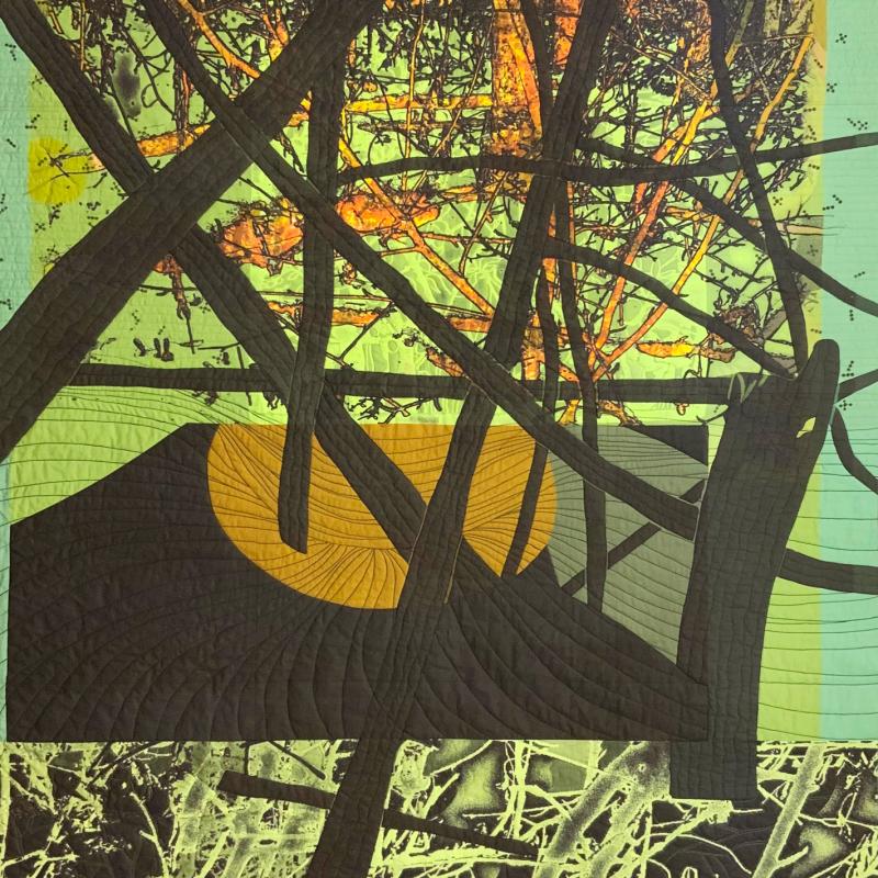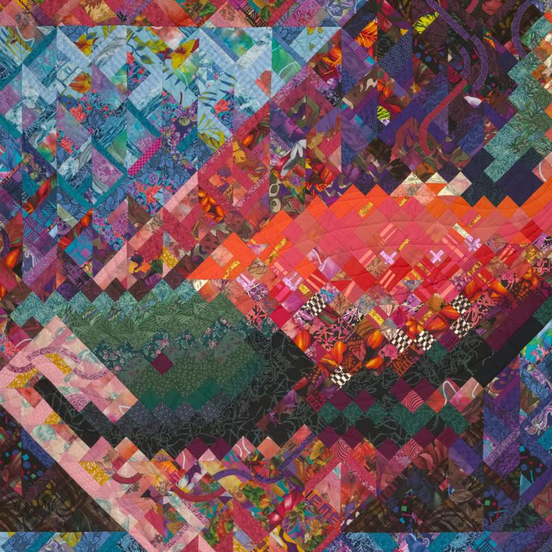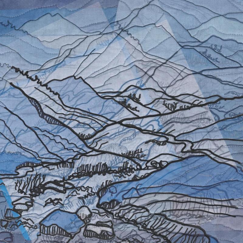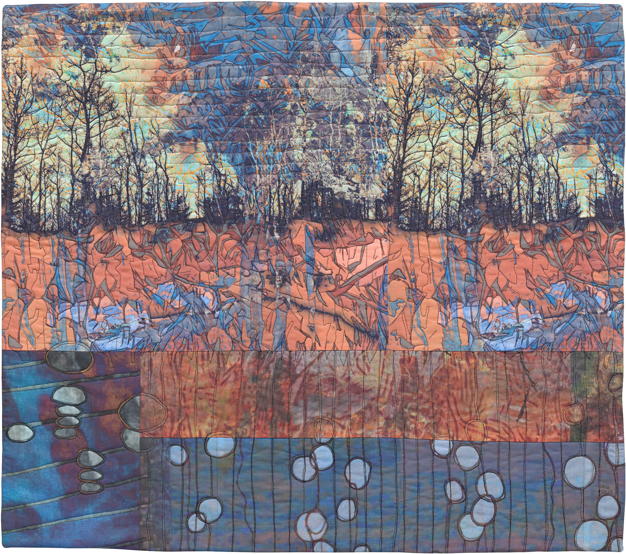 I am an Alaskan artist who has lived remotely for many years but is currently in Fairbanks. Working with scientists has changed how I see the world and describe it visually. I am currently working digitally, incorporating images of drawings, immersion, clamp-dyed fabrics, silk-screened and deconstructed silk-screened fabrics, and photographs. I experiment with images, create new and unusual color palettes, and express ideas that have interested me for years. Final designs are custom printed on fabric, sewn together, and quilted elaborately.