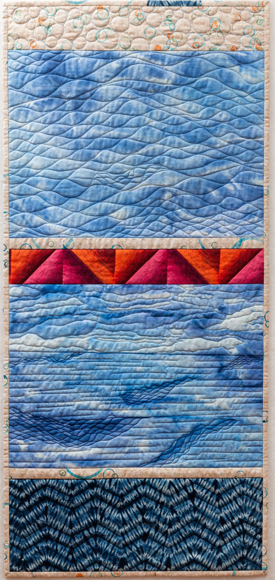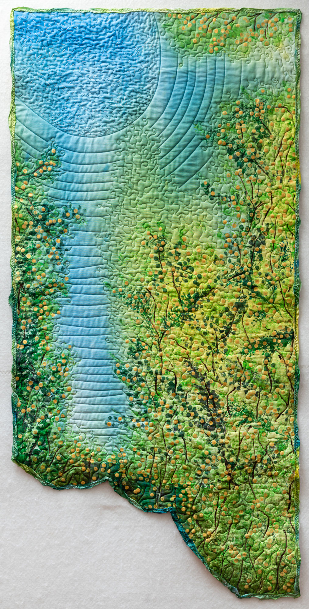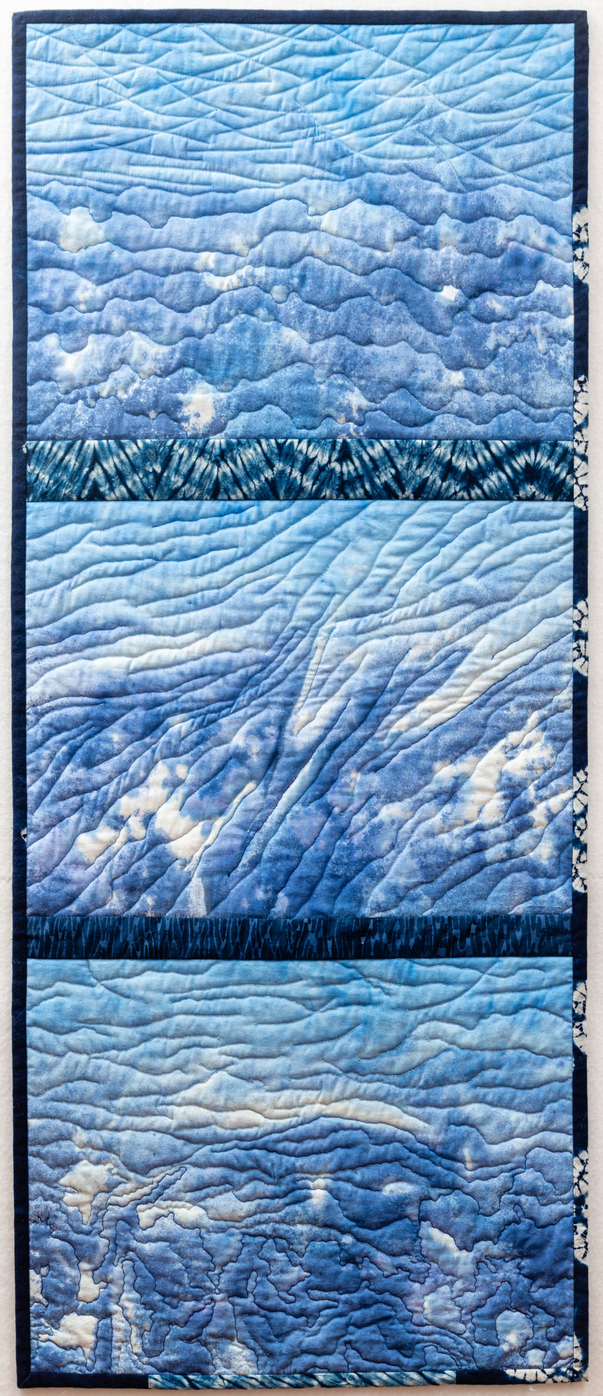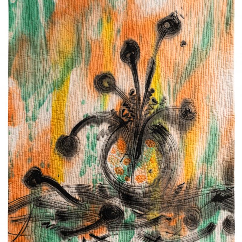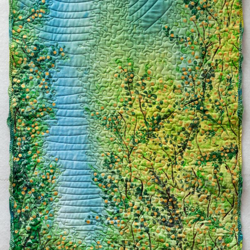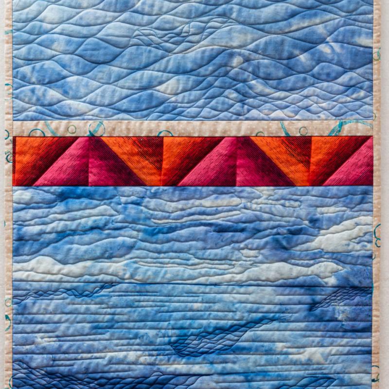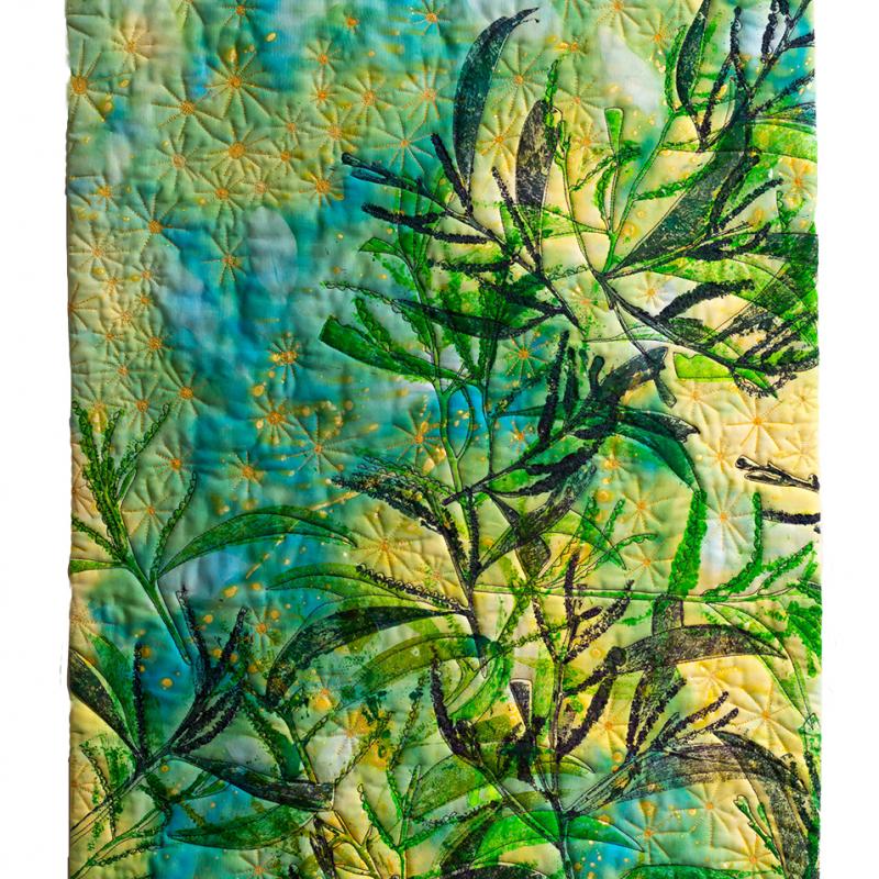 The dramatic Australian outback and coastal landscape influence her designs which are rich in colour and texture. Hand dyeing her fabric and adding meaning via printing, painting, rubbed surfaces, and machine and hand stitching are dominant features of her work.