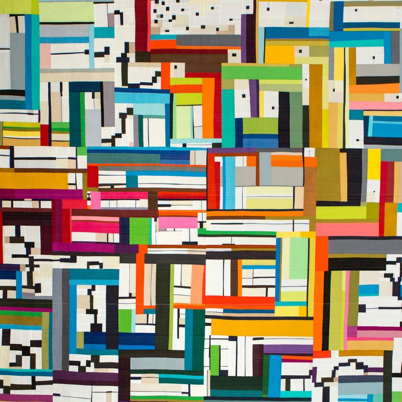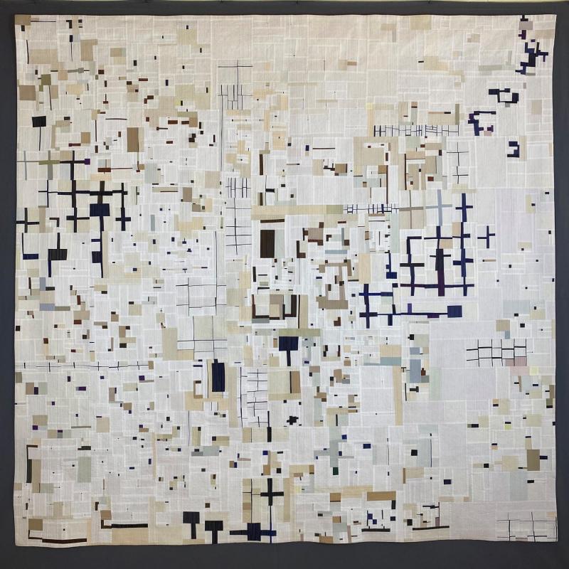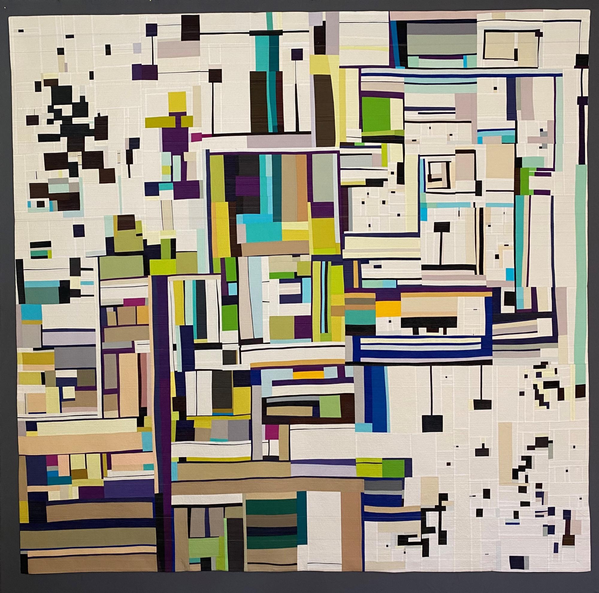 My art draws on meditations between complex science and minimalist aesthetics and communicates my sense of wonder to the world. I am a scientist and artist whose influences include cartography, statistics, erector sets, and Dr. Suess. My work is a combination of eclectic architecture, complex machinery, and outlandish arrangements that push the limits of balance, proportion, and symmetry. The resulting constructions explore surprising connections, finding resolutions with delight and humor. I’m often up on a ladder or crouching on the floor to create pieces 8 feet square. The top then goes to the longarm where my husband spends long hours quilting straight lines. The quilts’ last stop is back to my studio for hand finishing.