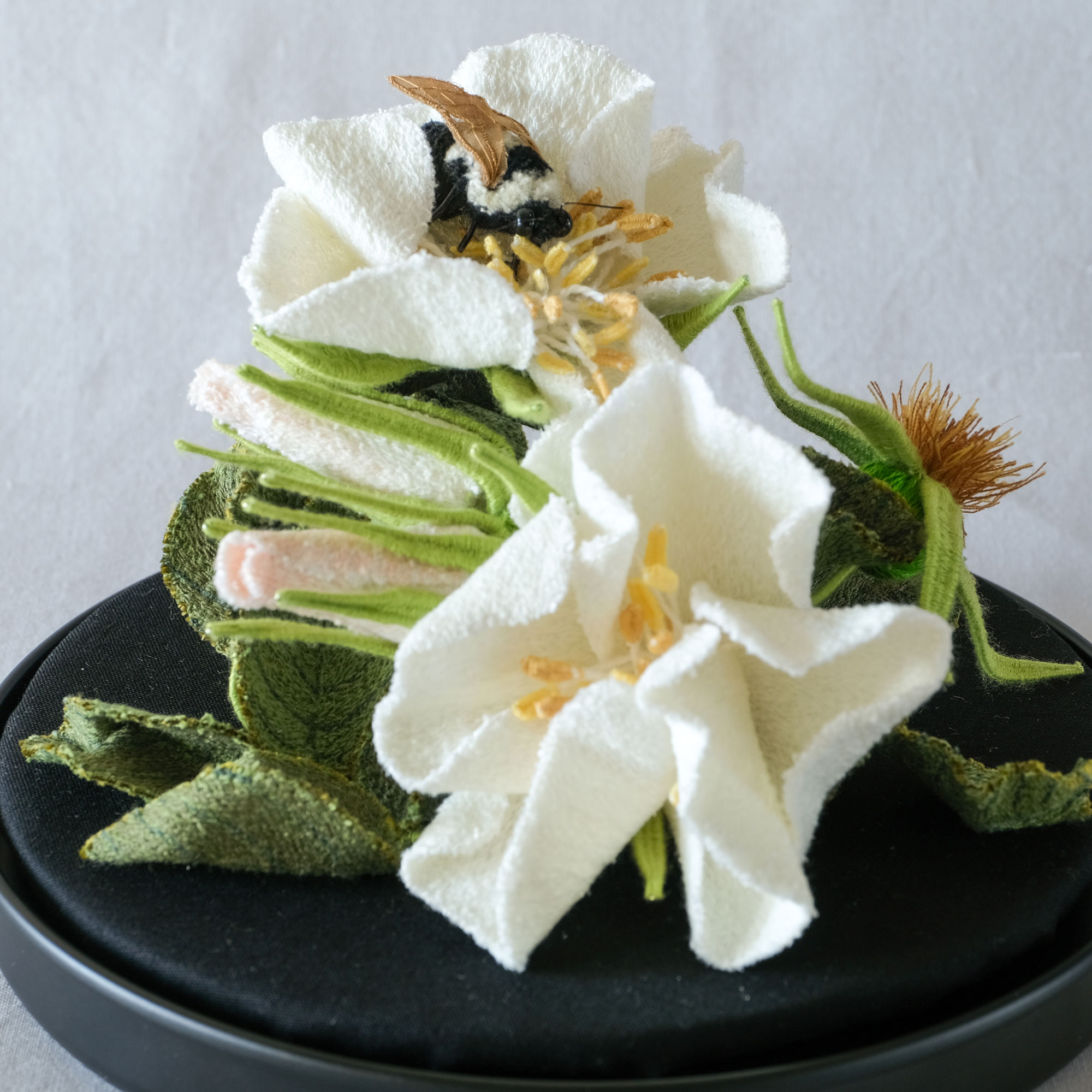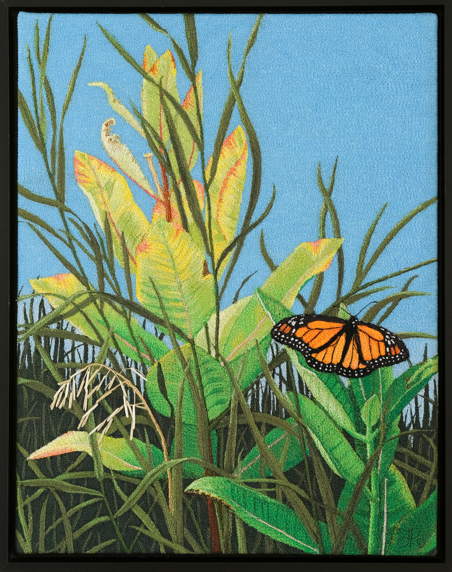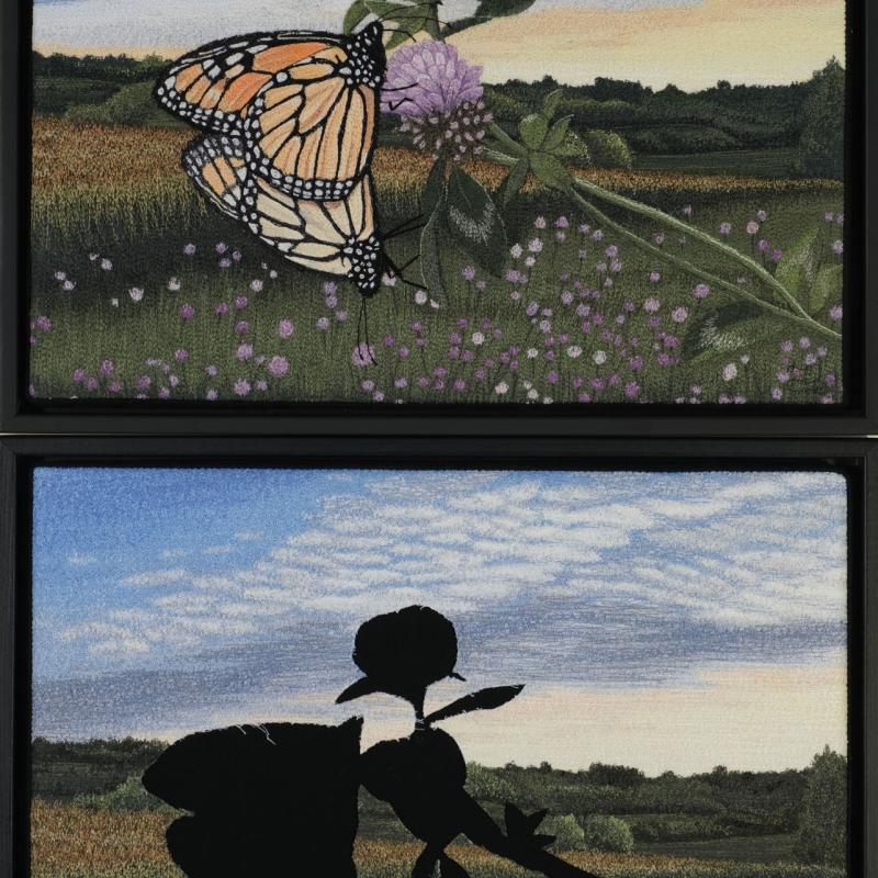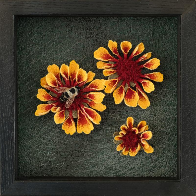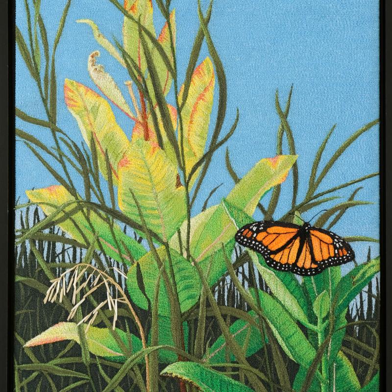 I use contemporary textile techniques to showcase changes in our physical and socio-political environments. Building on a base of traditional hand-embroidery, hand-guided longarm stitching, and a love of drawing, my representational work is detailed and “drawn with thread.” My nature studies draw attention to the importance of native pollinators as I observe them around my studio in the Niagara Escarpment UNESCO World Biosphere Reserve. Many are stitched using centuries-old three-dimensional Stumpwork techniques. My large-scale conceptual work, focused on changes wrought by human influence, incorporates three-dimensional sculptural techniques using wire and other materials. I am the lead artist and curator of the collaborative artwork “Reflections of Ourselves,” which celebrates the rich cultural heritage of Canadians. My work is held in the permanent collection of the US National Quilt Museum and private collections in North America and Europe.