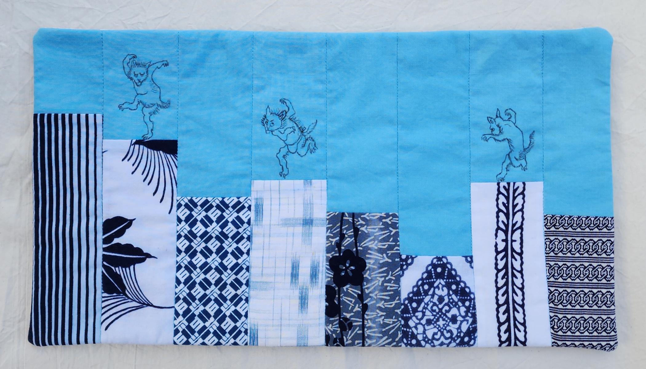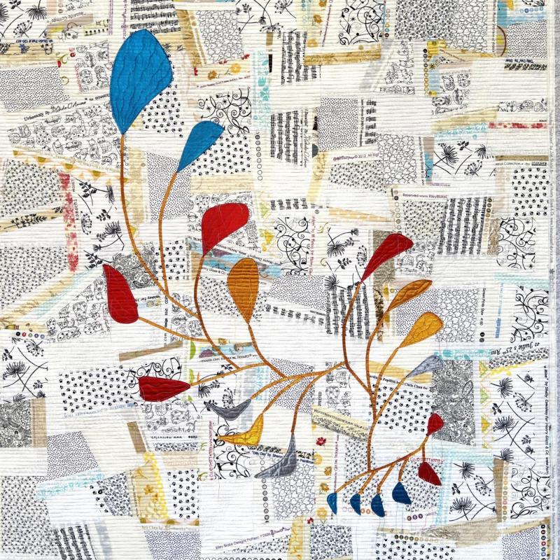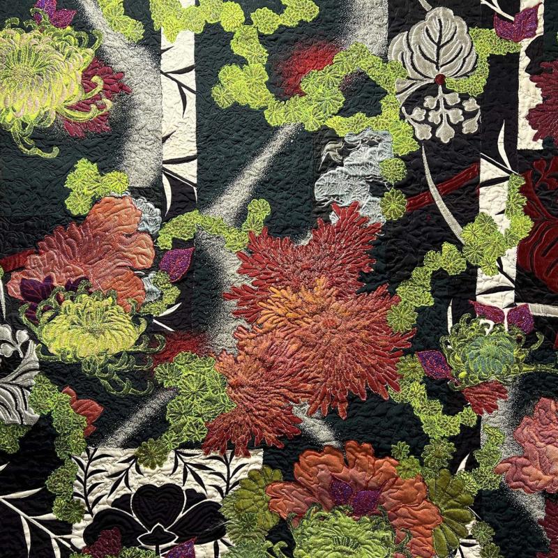 Dosho’s artwork is uniquely dimensional and textural; it is an art quilt, but also it is fiber art, thus, she refers to it as “fiber art quilt.” She uses many kinds of materials such as old Japanese kimonos, clothing, fashion, interior fabrics, and Japanese paper. Her techniques include embroidery, dyeing, painting, and discharge.