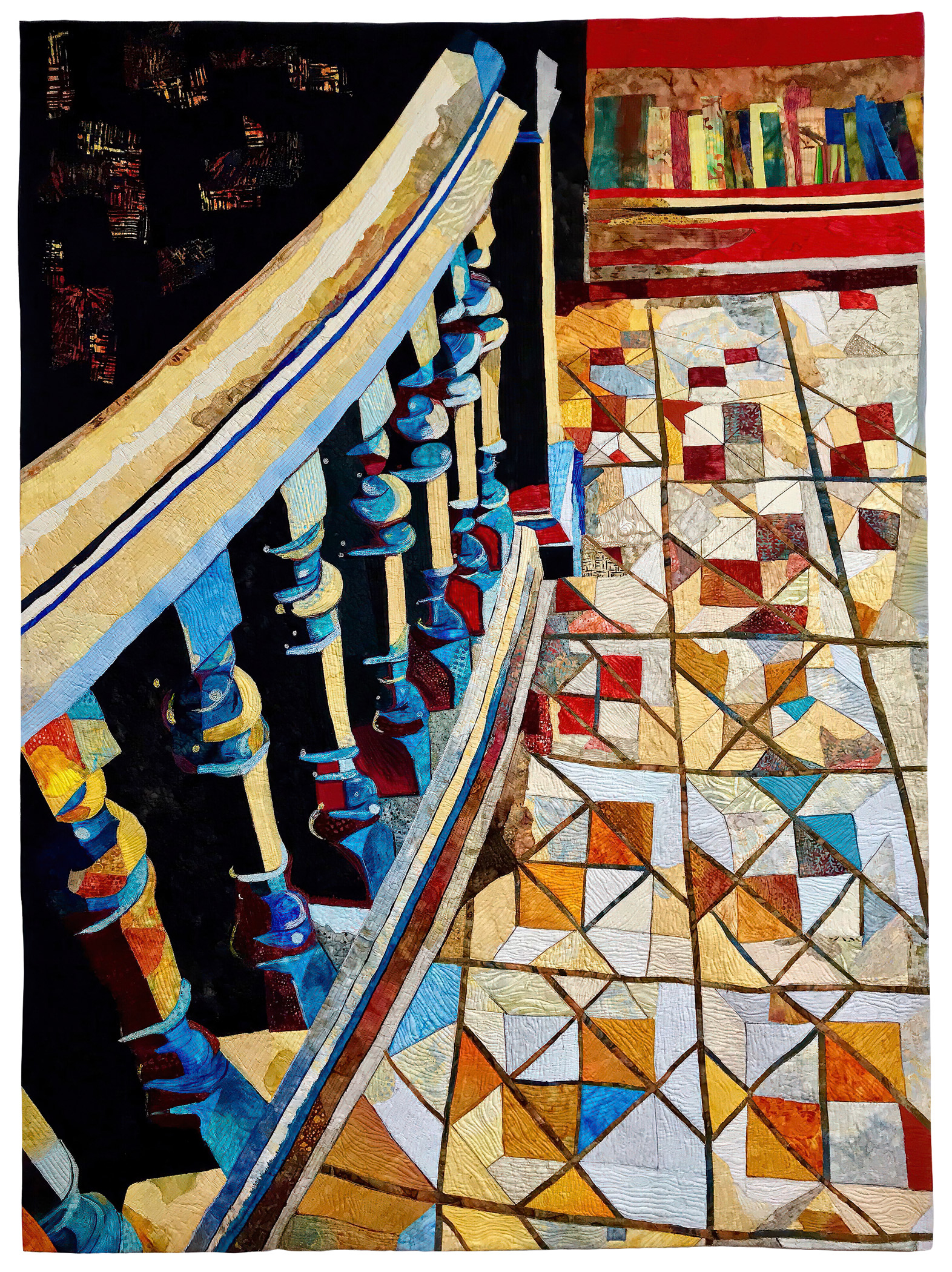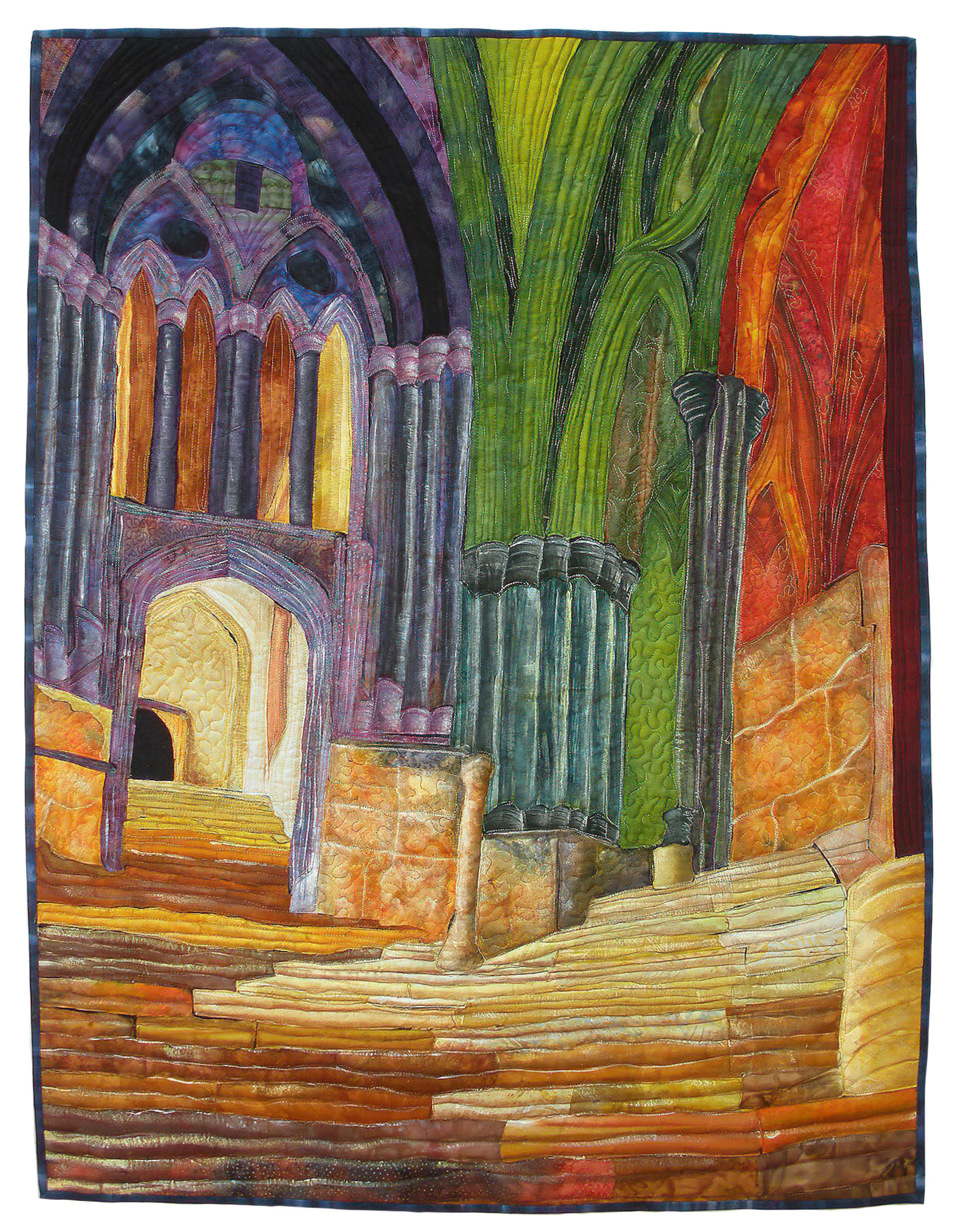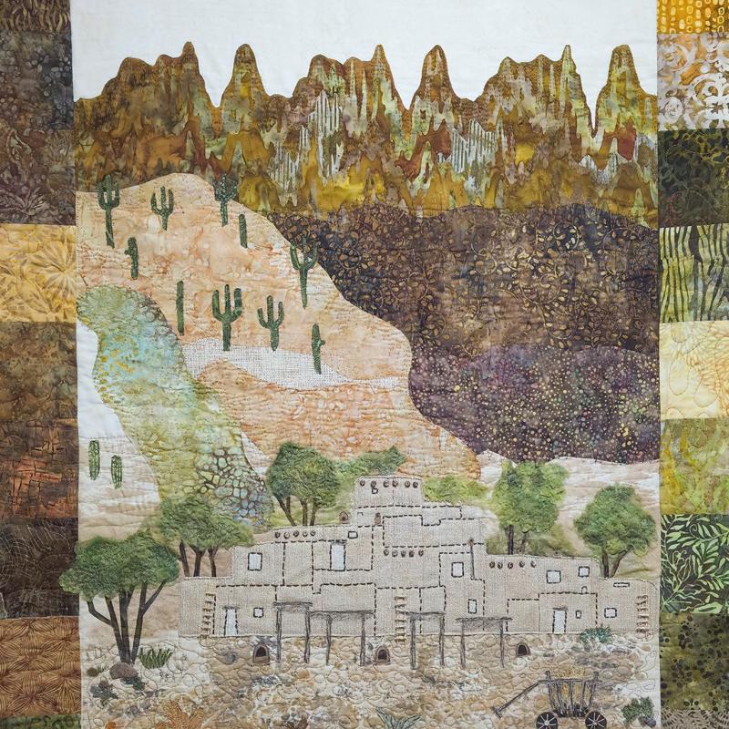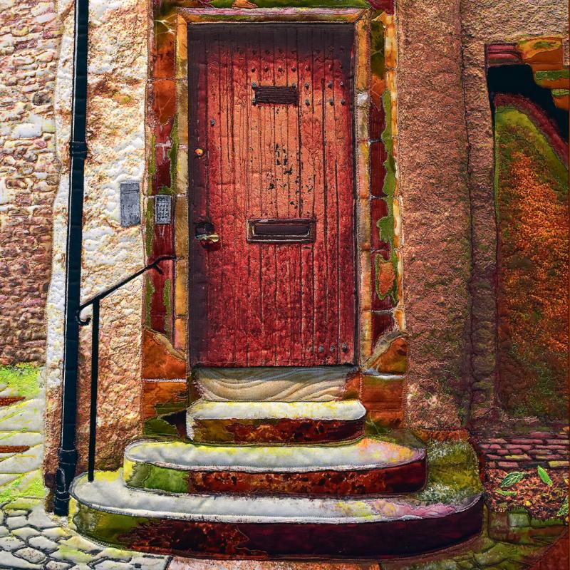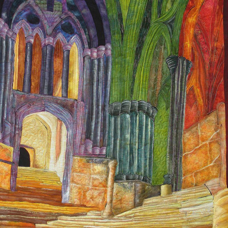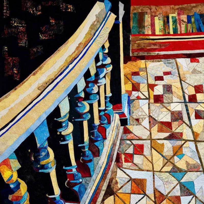 The call for entry of “Historic Detail” challenged members to consider how a structure connects with the landscape to evoke a sense of time and place. I rejoiced to discover that the submissions also reflect the breadth of SAQA membership. Alive with artistic voices and fiber art techniques, this gallery celebrates architecture and imagination.
