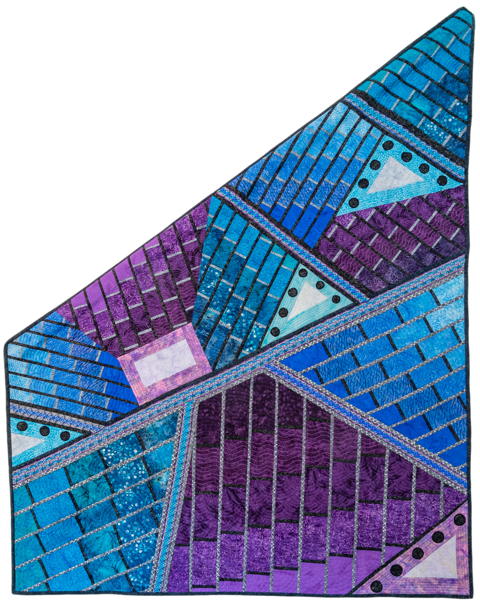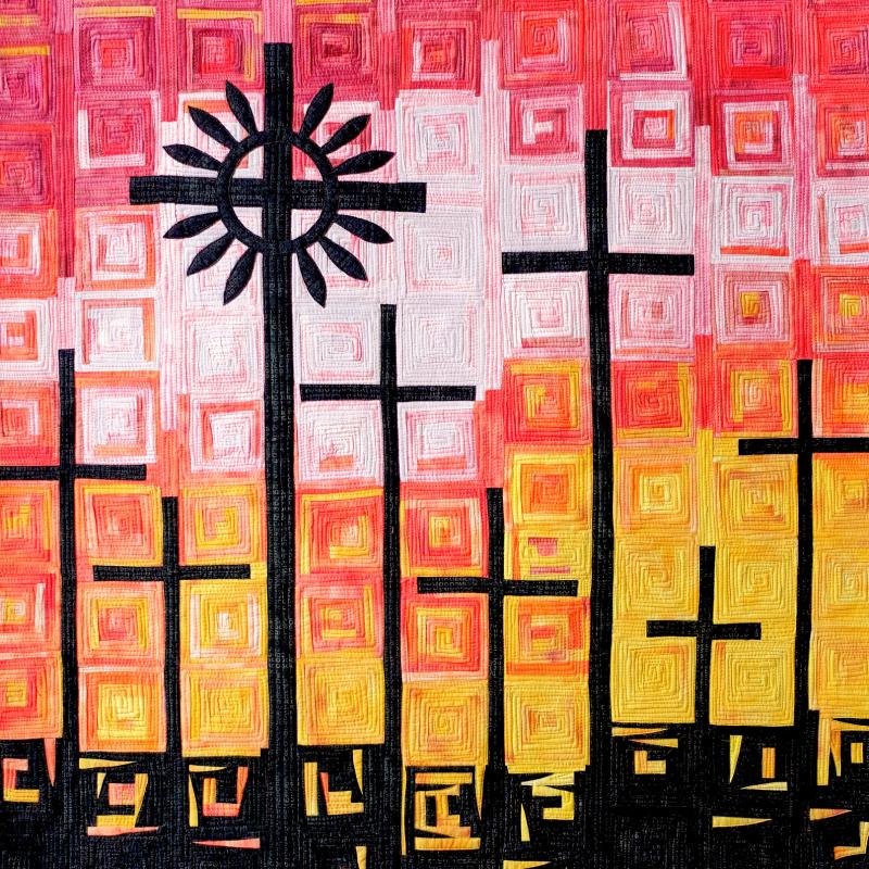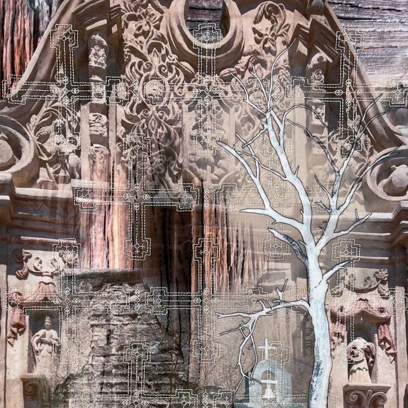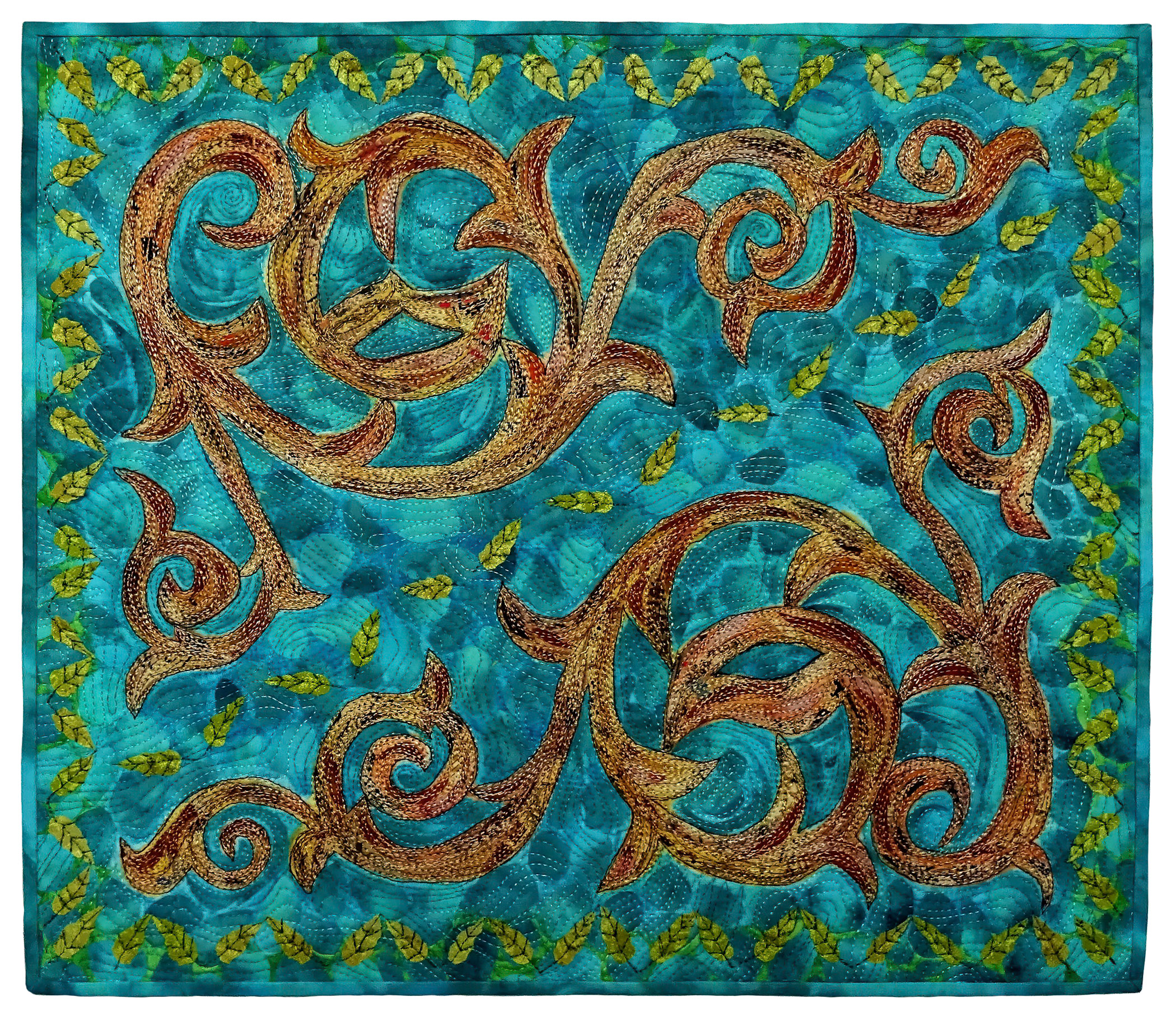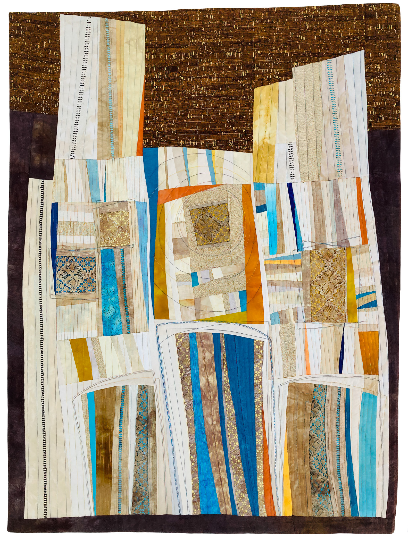 The call for entry of “Historic Detail” challenged members to consider how a structure connects with the landscape to evoke a sense of time and place. I rejoiced to discover that the submissions also reflect the breadth of SAQA membership. Alive with artistic voices and fiber art techniques, this gallery celebrates architecture and imagination.