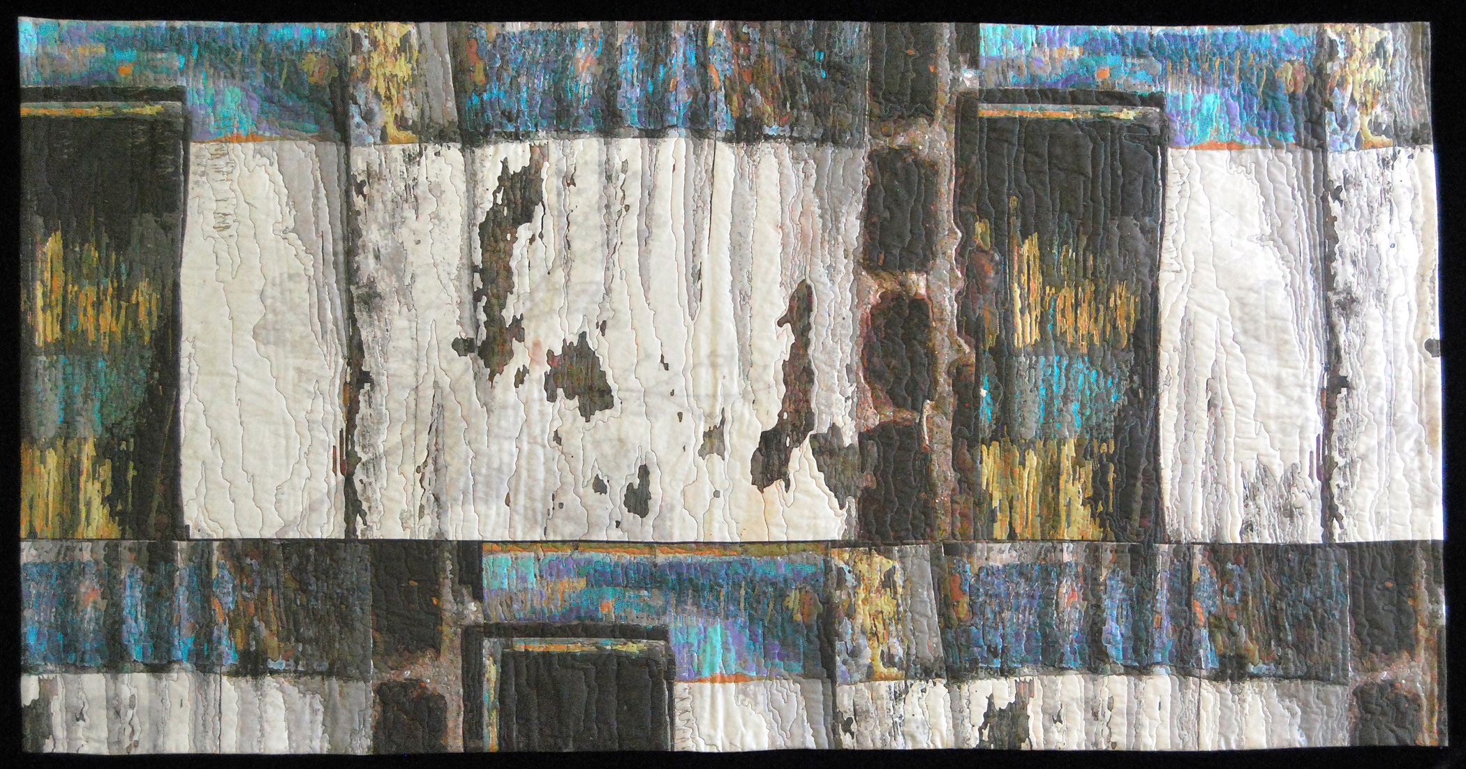 The collection includes piecing and appliqué like “Unhinged” and “Shared Heritage” that embrace the traditional definition of quilt. Beautiful three-dimensional and mixed media work such as “Facade 3” and “Seawall 7” equally represent SAQA’s definition.