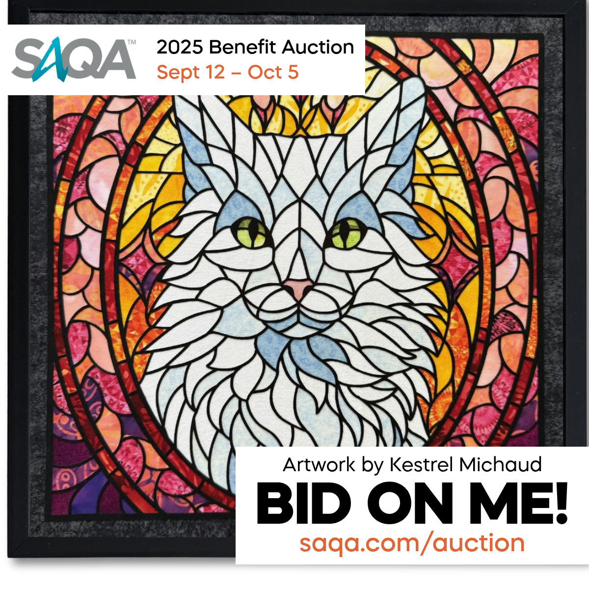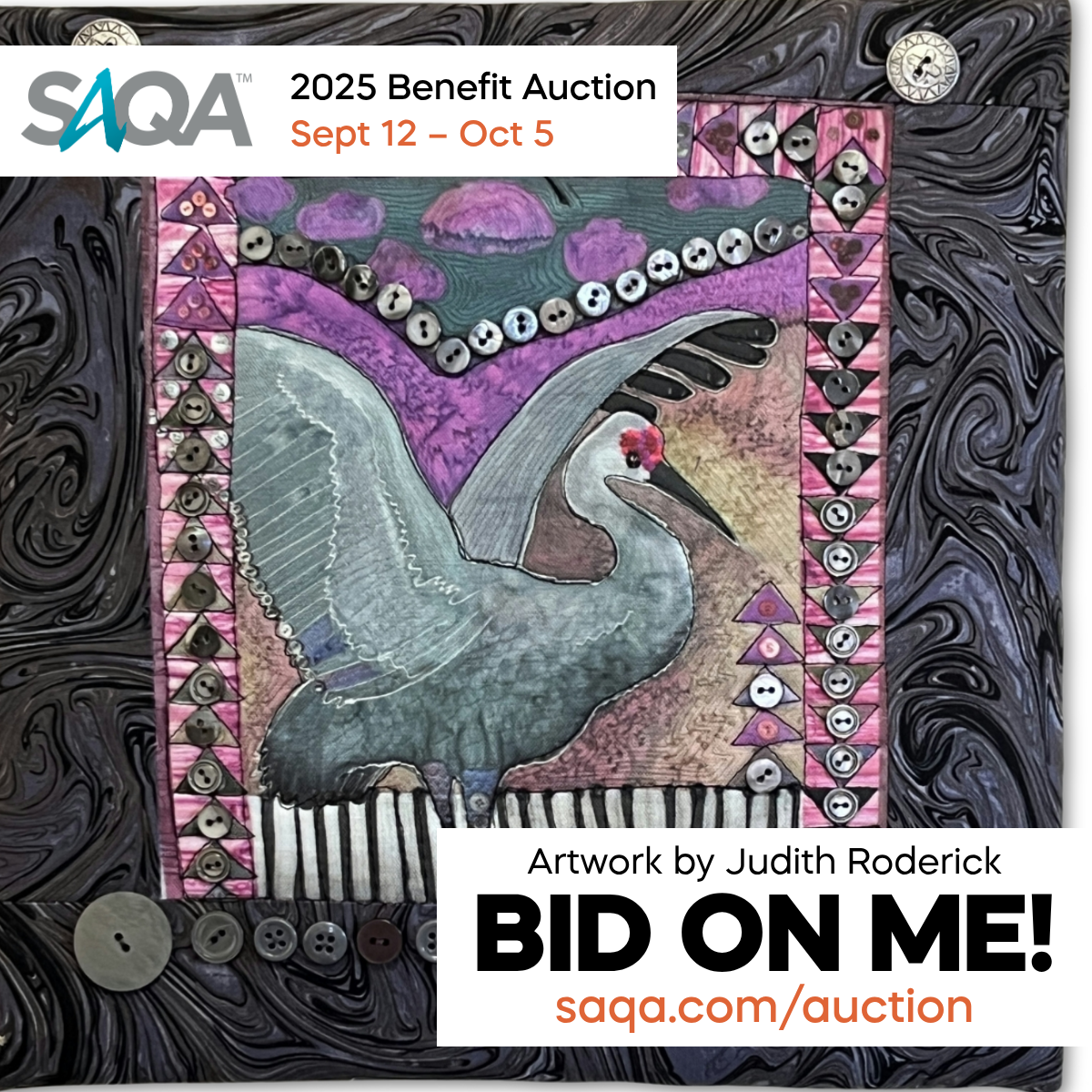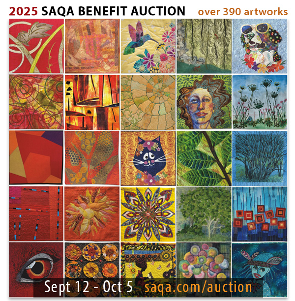 SAQA's annual Benefit Auction will take place online from September 12 through October 5, 2025. With almost 400 pieces of beautiful artwork available for bidding, there is something for everyone to enjoy!