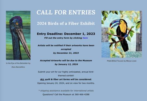 Non-SAQA Call for Entry Dec 01, 2023 Dec 01, 2023 Call for Entry Deadline December 01, 2023 Submit your art for our highly anticipated annual bird-themed exhibit. Exhibition opens January 24, 2024 and will be on view for 2 months. More Info Location La Conner Venue Info Pacific Northwest Quilt & Fiber Arts Museum