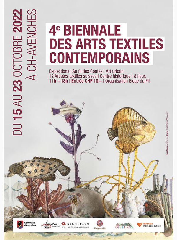 The 4th Biennale of Contemporary Textile Arts is an event taking place in various locals in the historic city center of Avenches, Switzerland. Responding to a need for a new way of viewing textile art, this event is a journey into contemporary fiber world of quilting, weaving, knitting, embroidery, crochet, jewelry, painting, sculpture and urban art. 7 individuals and 5 groups will present their work in 8 different locations.
