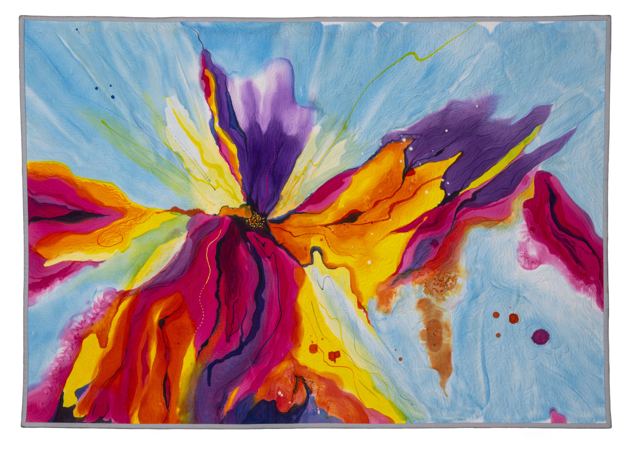 Geraldine Warner will show a collection of her artwork illustrating how she likes to explore the boundaries of quilting.. Some quilts are pieced from silk fabrics while others are whole-cloth quilts painted with acrylics on silk fabric and then layered and stitched by hand and machine.