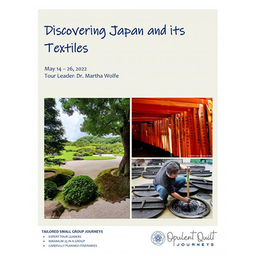 This tour is designed and led by award-winning fiber artist Martha Wolfe, founding member of the international art quilting group, Viewpoints 9. Martha is a seasoned international traveler and has taught and exhibited in locations around the world. The tour is created for those who share Martha’s love of travel, and exploring with a focus on textiles and quilts, Japan’s rich cultural history and the beauty of the ever-changing Japanese landscape.