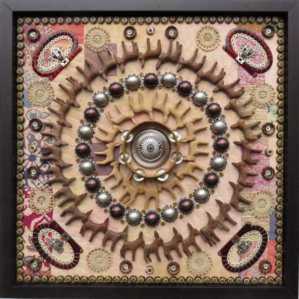 Found Object Mandalas is a solo exhibition featuring fiber artworks by Susan Lenz. Susan uses multiples of seemingly mundane items to put into perspective the abundance of life and the capacity to keep things as if for a "rainy day". Paper clips, keys, bottle caps, buttons, nails, plastic spoons, and old clock parts are combined with dominoes, film reels, old toys, and holiday decorations. These and so many other, often vintage items, are repetitively hand-stitched into meditative patterns on sections of old quilts, bringing an extraordinary new life to otherwise everyday things. This work started during the pandemic's "sheltering in place" and speaks to the universal desire for a place of belonging and sense of home.