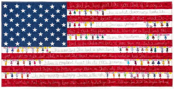 Free To Sp%@k!, a group exhibition by Southern California fiber artists Kathryn Pellman, Kelly Hartigan Goldstein, and Marty Ornish, who test the tensile strength of free expression when language itself has become a battleground. The artists pose a direct question: What happens to a democracy when the First Amendment is treated as negotiable?