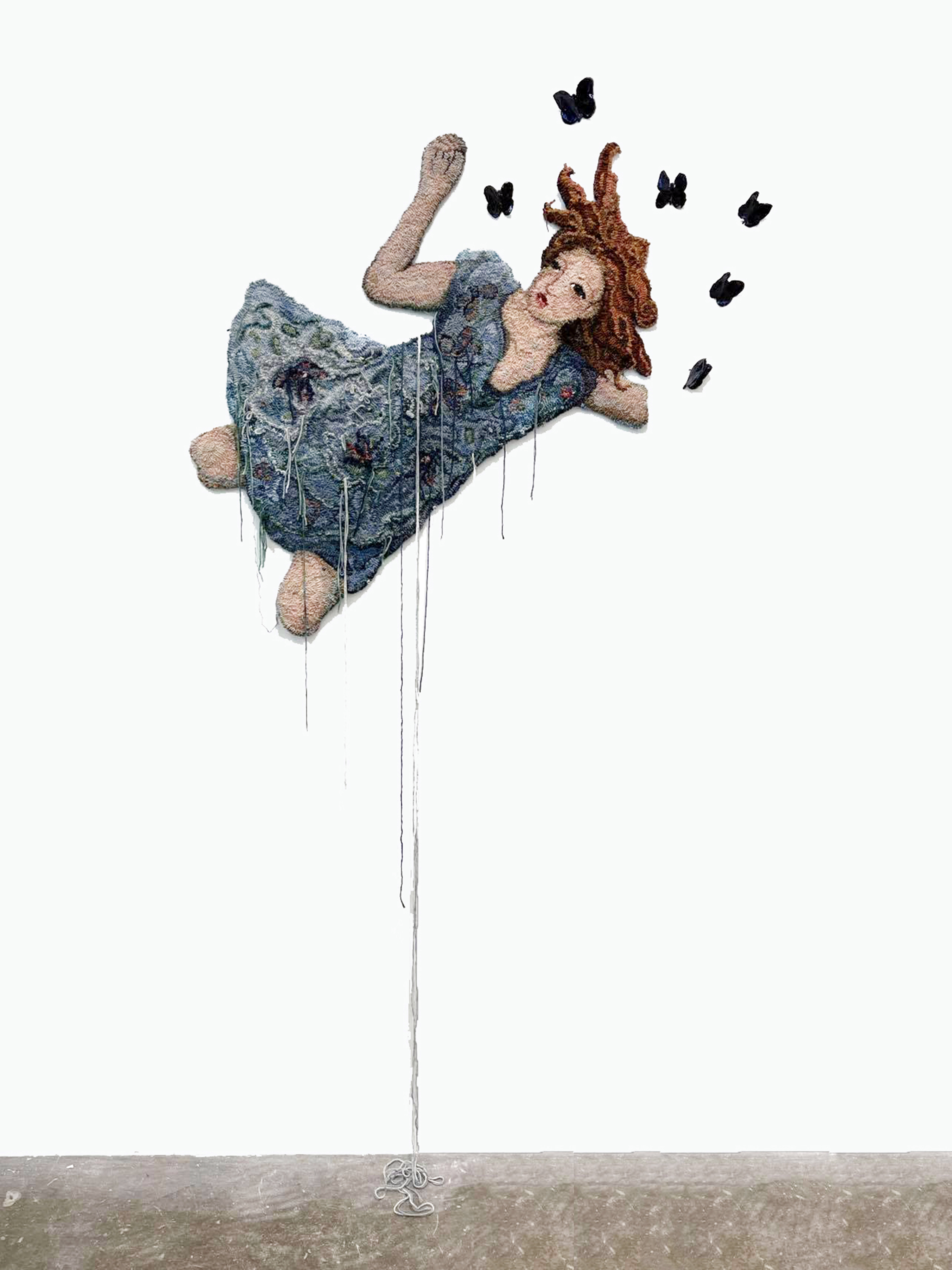 Rachelle LeBlanc, Taking Flight, 2021; wool and yarn, recycled wool, linen, red earthenware, high fire glaze, and wire; 48 x 44 x 1/2 in. Courtesy of the artist.