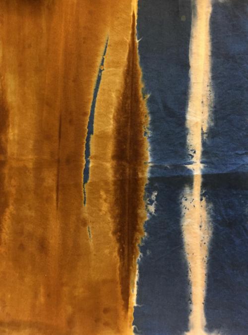 We will create a variety of imagery, focusing on blue on brown, blue on white, white on blue, brown on blue, or a combination of all of these. Potassium permanganate will remove the indigo, which first leaves the background color in varying shades of brown. Further processing removes the brown, leaving the background color white with an indigo-blue pattern. This process not only works on indigo-dyed cloth but also works on cloth dyed with natural dyes and synthetic dyes.