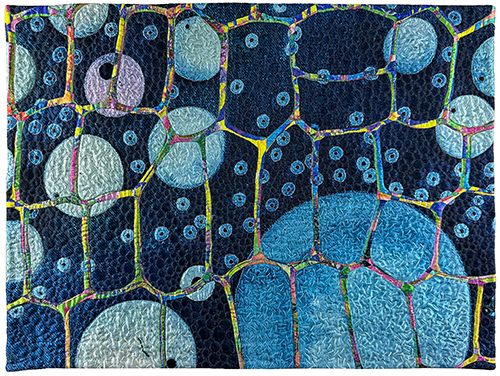In this exhibit, science and art are intertwined in various textiles designed by the artist. In Cell-evision, a large-scale woodcarving was printed directly onto silk velvet. In the ongoing Through a Lens series, sun prints were made on cotton fabric with acrylic paint and found objects as stencils. Individual sun prints were photographed, digitally manipulated and recombined in various ways into a unique image custom printed onto satin. Texture and dimension were added with a variety of hand and machine stitching.