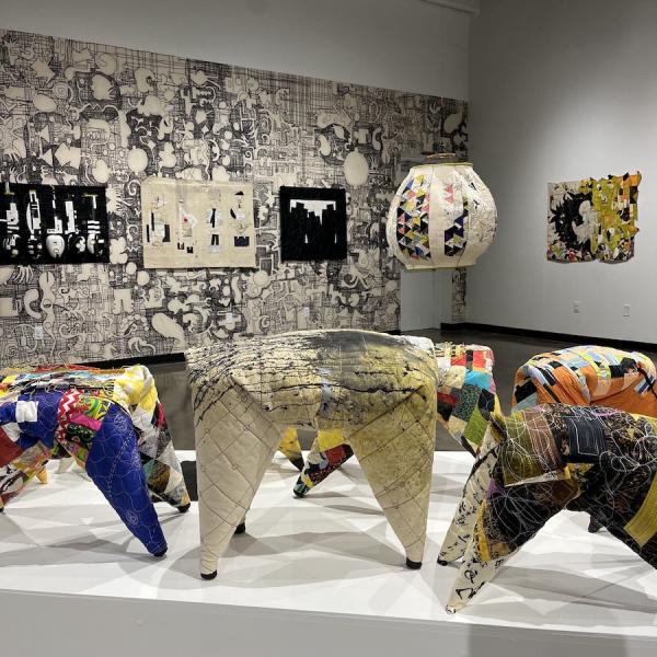 "My art has an undercurrent of peculiarities and humor. I look for things that are uncanny—those elements in life that don’t quite make sense. Characters and patterns emerge through stitching. Moving from two-dimensional surfaces to three-dimensional forms, I built a herd this year. The members have no heads. They are diverse and a little disturbing. Where are they going? What has the herd heard to draw them here? Let loose upon my studio floor and tables, they wander aimlessly. They could be me and you. They could be them. They stay together, they move as one, letting someone else or something else dictate their actions."