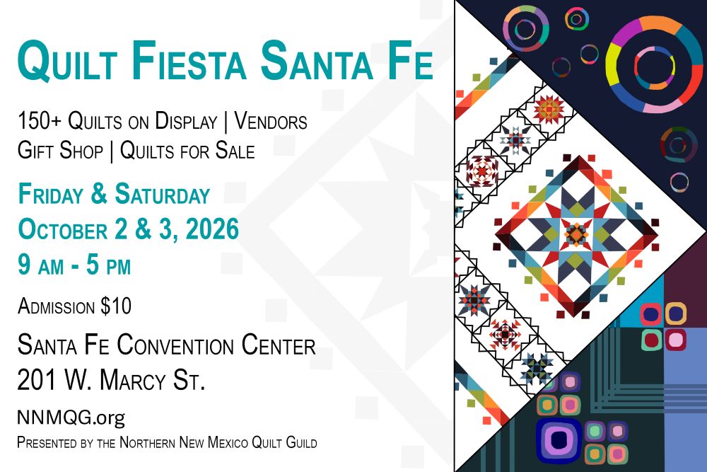 Meet up with your quilty friends at Quilt Fiesta Santa Fe. The biannual event is downtown at the Santa Fe Convention Center on Friday, October 2, and Saturday, October 3 from 9 until 5 each day. This juried show and exhibit features some 150 quilts plus vendors, art quilts, an appraiser, raffle quilt, a gift shop, and quilts for sale. Enjoy the artistry and heart in every piece!