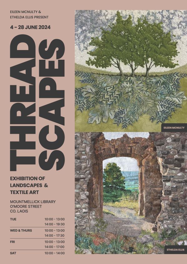 2 Irish Textile Artists, Ethelda Ellis and Eileen McNulty, both SAQA members are having an exhibition of their work. It is a collection of mainly Irish landscapes. Each of the artists has her own distinctive approach. Eileen is inspired by the stories that her mother told about the fairy trees and their connection to the underworld. Her characteristic trees with interesting undergrowth are in most of her work. Ethelda is inspired by her local landscape in the Midlands of Ireland and tries to capture it realistically in textiles.