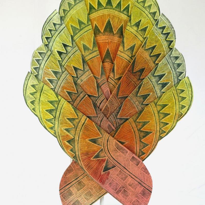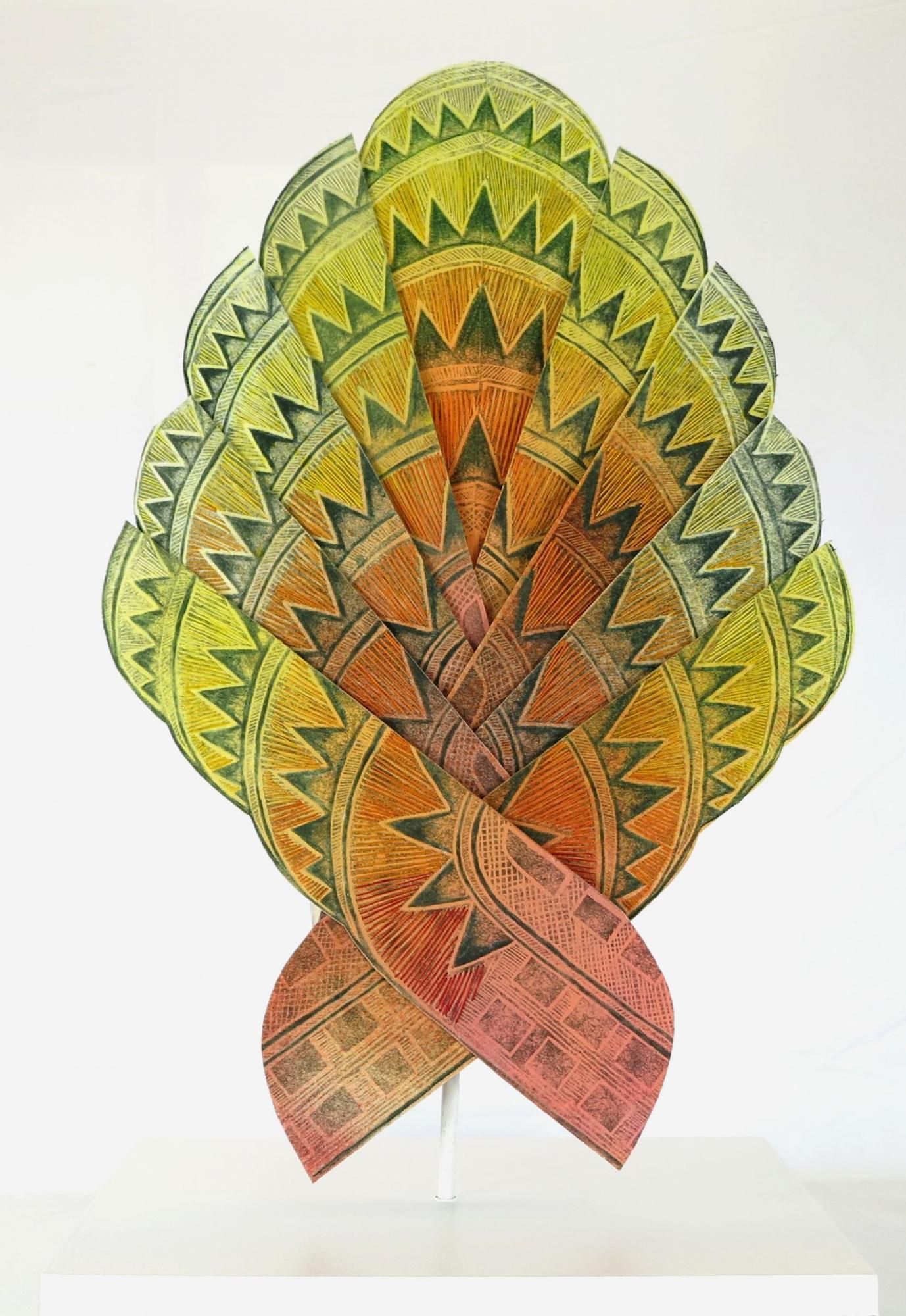 The manipulation of layered three-dimensional forms is the main focus of her work. She marks, layers, creases, drapes, stacks, and stitches textiles to create three-dimensional art quilts, structures, and assemblages and allow gravity to determine their final forms.