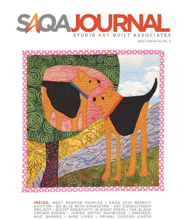 Want to be more creative and make more work? The SAQA Journal tells you how! In our third issue of 2022, featured artist Sharon Peoples and contributor Margaret Abramshe share how daily journaling and sketching combine to generate greater artistic output. Abramshe even developed an eight-step plan to make her studio a creative haven. Clara Nartey began a new collection of work, The Black Crown Series, after a chance encounter. She writes about her journey to develop these colorful works and how it has had an impact on her.